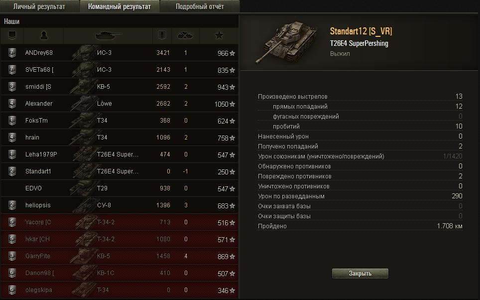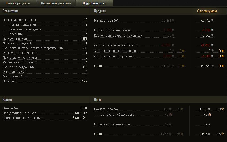 Вот такое чудо повстречалось мне в бою... Видео: Сам герой сюжета, который за весь бой дамаг нанес только мне, по врагам - 0: http://worldoftanks....064-Standart12/ А здесь можно посмотреть результаты боя: http://wotreplays.ru...6b6b317095d49d2 Для тех, кому лениво заходить по ссылкам: http://cdn-frm-eu.wargaming.net/wot/ru/uploads/monthly_03_2013/post-4404467-0-03457200-1363672910_thumb.jpg http://cdn-frm-eu.wargaming.net/wot/ru/uploads/monthly_03_2013/post-4404467-0-95098200-1363672954_thumb.jpg http://cdn-frm-eu.wargaming.net/wot/ru/uploads/monthly_03_2013/post-4404467-0-41399400-1363672992_thumb.jpg Радует то, что размер компенсации полностью покрыл стоимость ремонта. Интересно, какой ему штраф выписали?) PS: для интересующихся - 39 дамага по своему я нанес при случайном столкновении (не успел довернуть корпус, когда он откатывался задом), приношу свои извинения игроку с ником ivkar из клана [CHECK]. PPS: жалобу из боя отправил, остальных просто не успел попросить отправить жалобу.