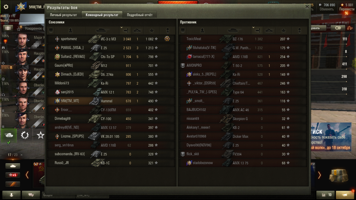 Поражение в бою 15-2.Скрин с уроном который я нанёс противнику.У него оставалось несколько единиц хп и я мог его спокойно добить,но-у меня проскочил рикошет! А мы уже проигрывали 7-1.И да,с такими повреждениями(на скрине) танку не сделалось ничего,в конце боя он живой.Внимание вопрос-а есть ли вообще смысл упираться в этой постановочной игре? Если он с такими повреждениями остался цел а мы проиграли 15-2.И это далеко не единичный случай,когда ты с повреждением хотя бы одного из этих модулей погибаешь сразу а тут ему с 3мя! ничего не сделалось.И в конце каждого боя возникает вопрос-ЛЕСТА ВЫ ВО ЧТО ИГРУ ПРЕВРАТИЛИ?!!!!!!!!!!!!