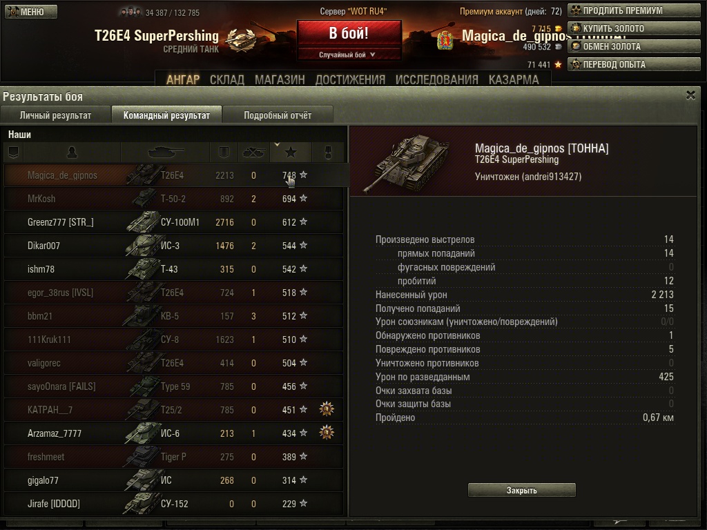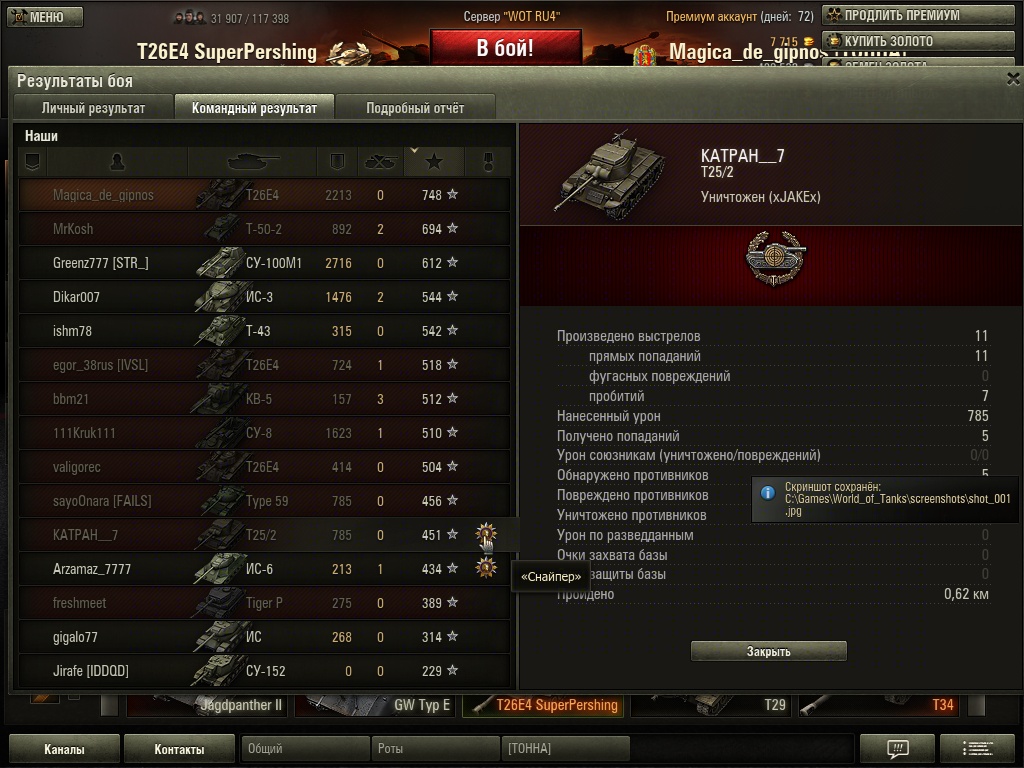Здравствуйте уважаемые!, после боя мне кажется , что медаль СНАЙПЕР была присуждена не совсем честно, Если я не прав объясните пожалуйста. Попаданий у меня и оппонента 100% но у меня их 14 у него 11, возможно потенциальный урон у него больше , но в итоге я набрал опыта больше. скрины прилагаю спасибо http://cdn-frm-eu.wargaming.net/wot/ru/uploads/monthly_12_2012/post-4065796-0-17402600-1355895006_thumb.jpg реплей http://wotreplays.ru...4_superpershing