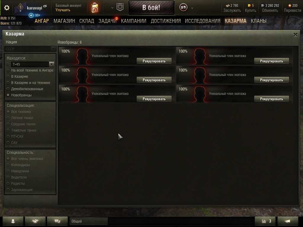 Добрый день, вечер, или утро! Хотелось бы улучшить механику рекрутинга членов экипажа, а именно: - такой способ рекрутировать нового члена экипажа как сейчас отображен на рис. 9 хорош, но только когда в Казарме есть члены экипажа той же нации, что и техника, - но у меня, и думаю не только у меня, есть возможность рекрутировать Новобранцев, а я как "покупатель" их не "вижу" т.к. они еще "вольноопределяющиеся" и я могу рекрутировать только кого-то, так сказать со стороны, т.е. "призвать новичков", а "вольноопределяющиеся Новобранцы" томятся и ждут когда о них вспомнят, они даже не в казарме, а где-то там на "приписном пункте" ждут призыва. (рис.5) Мне их уже почти жаль девчёнки и мальчишки наверное хорошие у многих уже есть по одному, а то и по три перка. В общем предложение у меня, подключите к возможности рекрутировать нового члена экипажа из "барака" с новобранцами. ЗЫ: Я еще и про демобилизованных забыл, их бы тоже не мешало подключить, я так пару человек экипажа потерял, кажется, их же можно было вернуть там в течении какого-то времени. Так что учитывая надвигающиеся изменения с экипажем 2.0 очень хорошо было бы учесть мое предложение и расширить возможности при выборе новых членов экипажа. (рис. 9) (рис. 5)