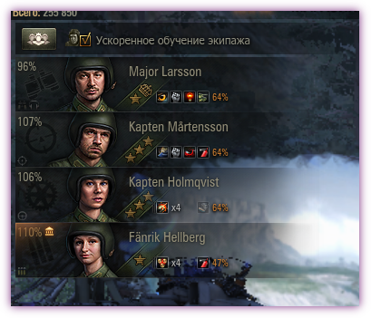 Значит, сажаешь в танк нового члена экипажа из числа новобранцев, которых раздают, например, при новогодних акциях (такого, у которого уже боевое братство изучено и еще парочка любых навыков на выбор). Потом танк становится элитным, и включаешь флажок "Ускоренное обучение экипажа". И этот новобранец навсегда теперь станет отстающим и будет ускоренно прокачиваться дальше, несмотря на то, что в экипаже есть обычные танкисты, которые набирали опыт своим ходом, бой за боем, и навыков имеют намного меньше. По-моему, несправедливо Справедливо, когда отстающий – это не тот новобранец, у которого боёв мало (соответственно, и опыта тоже), а тот, у которого навыков меньше. Пример смотри на скриншоте. У этой Fanrik Hellberg навыков куда больше, чем у командира. Однако весь дополнительный опыт – ей.