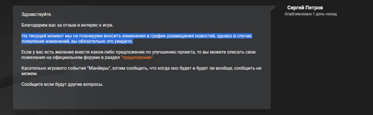 Уже в который раз замечаю от лесты что новости о каких либо событиях выходят либо за день до начала, либо в день начала события (Скрин имеется) Просто скоро будет ивент "Манёвры", и когда люди к ивенту готовятся знаю его дату заранее (минимум 2 недели до начала), то тут выходит что вероятно новость выйдет за день до начала ивента и люди не смогут элементарно организовать роты, кто работает не успеет взять отпуск. Выходит лесте всё равно на игроков и они сообщают о событиях только тогда когда уже это событие началось, пример тому ЛФ и СО