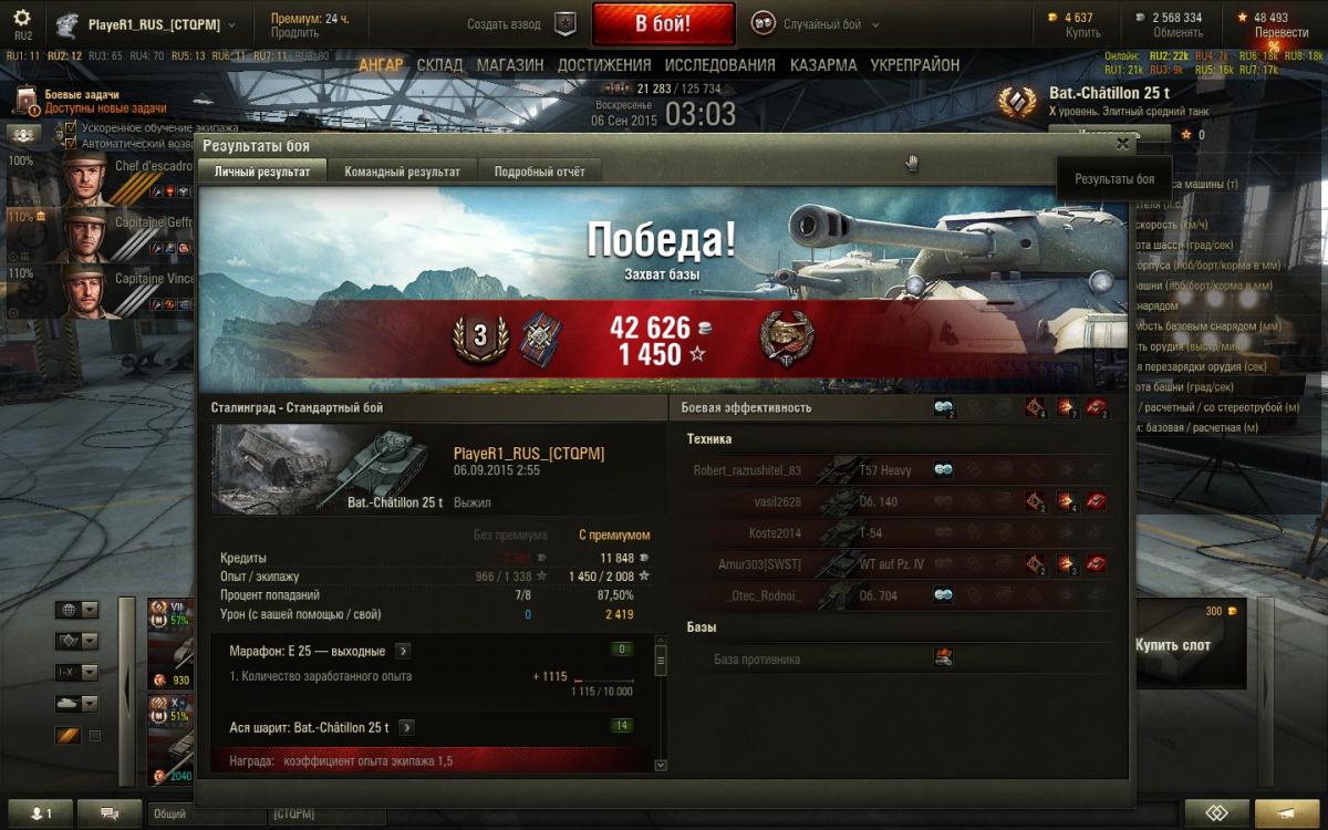Постараюсь быть краток: с 05.09 на 06.09 2015 играя в WOT, выполняя марафон, произошел следующий казус. До 2го или 3го выполнения задачи (10К опыта) оставалось приблизительно 1500 опыта. За 5 минут до начала новых игровых суток я был вынужден купить прем акк для того, что бы успеть завершить задачу. Выйдя в бой (02:56 МСК) получил уведомление, что в предыдущем бою получил 500 опыта, в итоге оставалось 1000 заработать за данный бой (скрин ниже). В итоге в этом бою получаю необходимую сумму опыта и что же я вижу в послебоевой статистике - опыт был зачтен в новые сутки, то есть предыдущая задача марафона не была выполнена. Просьба объяснить и помочь восстановить справедливость. На сколько я знаю - если вышел в бой с прем акк и он закончился в бою, то опыт и серебро дают как за прем акк. Почему же тогда в этом случае опыт пошел в новые сутки?