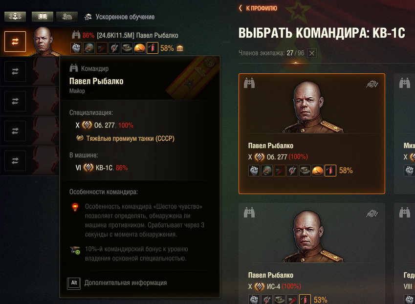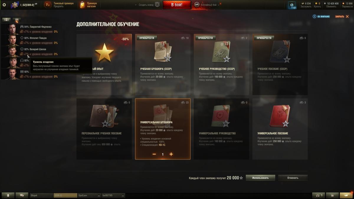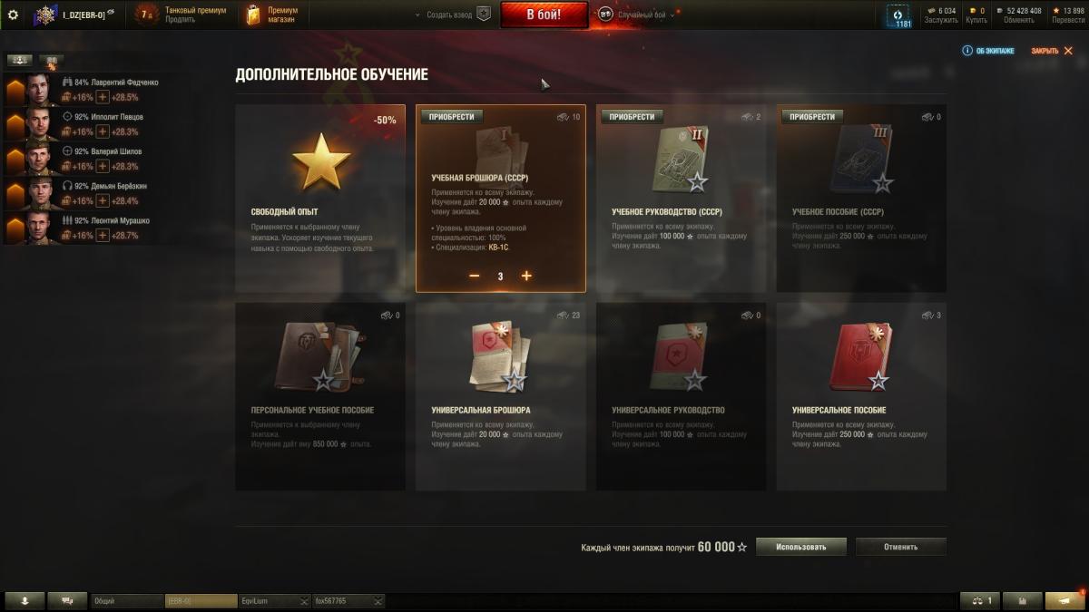 После недавнего ребаланса экипажа, появилась новая фишка, про которую (оказывается) некоторые не знают. Так вот, фишка в том, что основную специальность экипажа можно прокачивать брошурками. Если у вас не 100% экипаж, брошурку все равно можно применить, просто опыт пойдет на прокачку уровня владения основной специальностью, а не на навыки. Вы можете не тратить голду на обучение экипажа, а просто обучить за кредиты его до 75%, а после доучить брошурками. С 75% до 100% это где-то 4-5 брошурок по 20К опыта (стандартных). А если учитывать, что в этом году леста дала много возможностей получить книжки по 250К опыта, сойдет и одной такой, еще и навык почти полностью выучится.