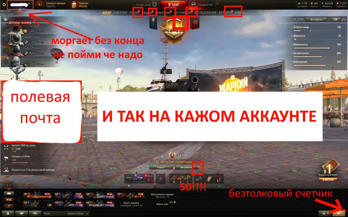 Сделайте механизм "Отметить все сообщения как прочитанные". каждый раз после установки и переустановки клиента, меня игра пытается ознакомить СО ВСЕМИ ЕЕ ФИЧАМИ и с десятками непрочитанных уведомлений по каждому меню. + морганиями аля ТКНИ СЮДА БЫСТРО. + возможность самому отключить всякую рекламу со скидками и новостями из полевой почты.