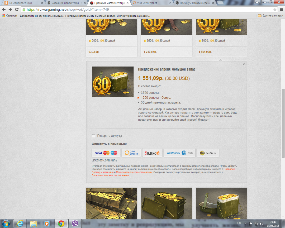 Добрый вечер! Хотелось бы уточнить один вопрос: На основном сайте wot прошел анонс акций на май в премиум магазине. Меня заинтересовало "предложение мая". Так вот... Стоимость большого пакета 25 $ вместо 30$, соответственно мы имеем цену (в пересчете на рубли) - 1290,50 р.. У меня показывается стоимость в 1551 р.. А это обычная стоимость 7500 голды, которые входят в этот пакет (вместе с премом на 30 дней). Вы можете поправить стоимость в магазине, чтобы не нужно было нажимать оплату, для реальной оценки стоимости?