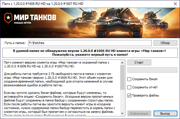 В данной теме будут размещаться старые версии клиента игры «Мир танков», чтобы все желающие могли их скачать и использовать для проигрывания своих реплеев, сделанных на предыдущих версиях клиента. В комментариях можете оставлять свои вопросы по работе со старыми клиентами и патчами. Список клиентов (запакованы архиватором zip) : 1.18.1.0 #1462 1.19.0.0 #1525 1.20.0.0 #1606 1.21.0.0 #1642 1.22.0.0 #1679 1.23.0.0 #1730 1.24.0.0 #1756 1.25.0.0 #1780 1.26.0.0 #1819 1.27.0.0 #1839 1.28.0.0 #1856 1.29.0.0 #1870 1.30.0.0 #1886 1.31.0.0 #1912 1.32.0.0 #1932 1.33.0.0 #1950 1.34.0.0 #1963 1.35.0.0 #1974 1.36.0.0 #1990 1.37.0.0 #2005 1.38.0.0 #2130 1.39.0.0 #2157 1.40.0.0 #2171 1.41.0.0 #2209 Список патчей : 1.18.1.0 - 1.19.0.0 1.19.0.0 - 1.20.0.0 1.20.0.0 - 1.21.0.0 1.21.0.0 - 1.22.0.0 1.22.0.0 - 1.23.0.0 1.23.0.0 - 1.24.0.0 1.24.0.0 - 1.25.0.0 1.25.0.0 - 1.26.0.0 1.26.0.0 - 1.27.0.0 1.27.0.0 - 1.28.0.0 1.28.0.0 - 1.29.0.0 1.29.0.0 - 1.30.0.0 1.30.0.0 - 1.31.0.0 1.31.0.0 - 1.32.0.0 1.32.0.0 - 1.33.0.0 1.33.0.0 - 1.34.0.0 1.34.0.0 - 1.35.0.0 1.35.0.0 - 1.36.0.0 1.36.0.0 - 1.37.0.0 1.37.0.0 - 1.38.0.0 1.38.0.0 - 1.39.0.0 1.39.0.0 - 1.40.0.0 1.40.0.0 - 1.41.0.0 1.41.0.0 - 1.42.0.0 Как применять патчи? Самый простой способ - скопировать патч в папку с нужным клиентом игры и запустить. Патч сам определит версию клиента и предложит пропатчить его (если версия подходящая). Так же патч можно запускать, вообще, из любой другой папки, но после запуска надо будет указать путь к папке с нужным клиентом. Некоторые патчи представляют из себя архив из нескольких файлов. Это связано с ограничениями программы, создающей патчи - нельзя создать исполняемый файл размером более 1 ГБ. Поэтому программа создаёт небольшой исполняемый файл, а все необходимые для работы патча данные размещает в файлах с расширением bin. Если вам нужно применить именно такой патч, то нужно распаковать содержимое zip-архива с патчем в любую папку (это может быть и папка с нужным клиентом игры, и любая другая папка), запустить исполняемый файл и указать путь к папке с нужным клиентом игры, если распаковка и запуск производились не в папку с нужным клиентом игры. Перед запуском патча убедитесь, что ваша учётная запись обладает правами администратора. Как это работает? Допустим, вам нужен клиент версии 1.20.1.0 #1624. Вы качаете архив с клиентом версии 1.20.0.0 #1606 и все необходимые патчи для получения версии 1.20.1.0 #1624: 1.20.0.0_1606_RU_HD - 1.20.0.0_1607_RU_HD, 1.20.0.0_1607_RU_HD - 1.20.0.1_1608_RU_HD, 1.20.0.1_1608_RU_HD - 1.20.1.0_1624_RU_HD. Распаковываете архив с клиентом 1.20.0.0 #1606 в нужную папку. Последовательно применяете патчи и получаете версию 1.20.1.0 #1624. Окно с патчем выглядит так: Настройки опций патча лучше не изменять без особой надобности, если вы не понимаете, для чего это делаете. Иногда патчу для работы нужно 1-2 ГБ в папке с клиентом игры, а иногда - 50-55 ГБ. Этот объём нужен для создания временной папки, необходимой для отката изменений, если что-то в работе патча пошло не так. Эта информация отображается в окне патча. Вы не сможете запустить работу патча, если нет необходимого свободного места на диске - стартовое окно патча запустится, но после нажатия на кнопку "Старт" будет показано сообщение о нехватке свободного места на диске с клиентом игры. В таком случае нужно закрыть окно патча, освободить нужный объём памяти на диске и запустить патч вновь. Как проиграть старый реплей? Открыть два окна, в одном чтобы был реплей, а в другом открыта корневая папка с нужной версией клиента. Хватаем в первом окне реплей и перетаскиваем его в окно с открытой корневой папкой нужной версии клиента, и роняем на исполняемый файл игры. Перед запуском реплея лучше переместить файл preferences.xml в какую-то другую папку и полностью очистить кэш. Как