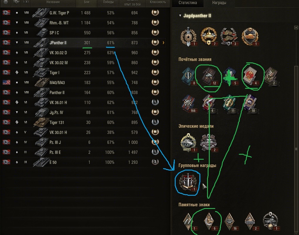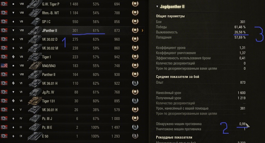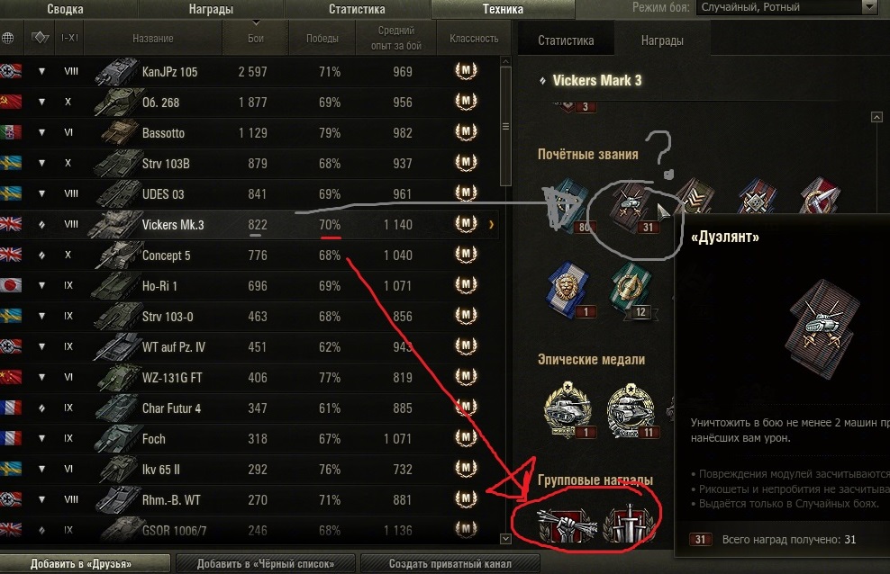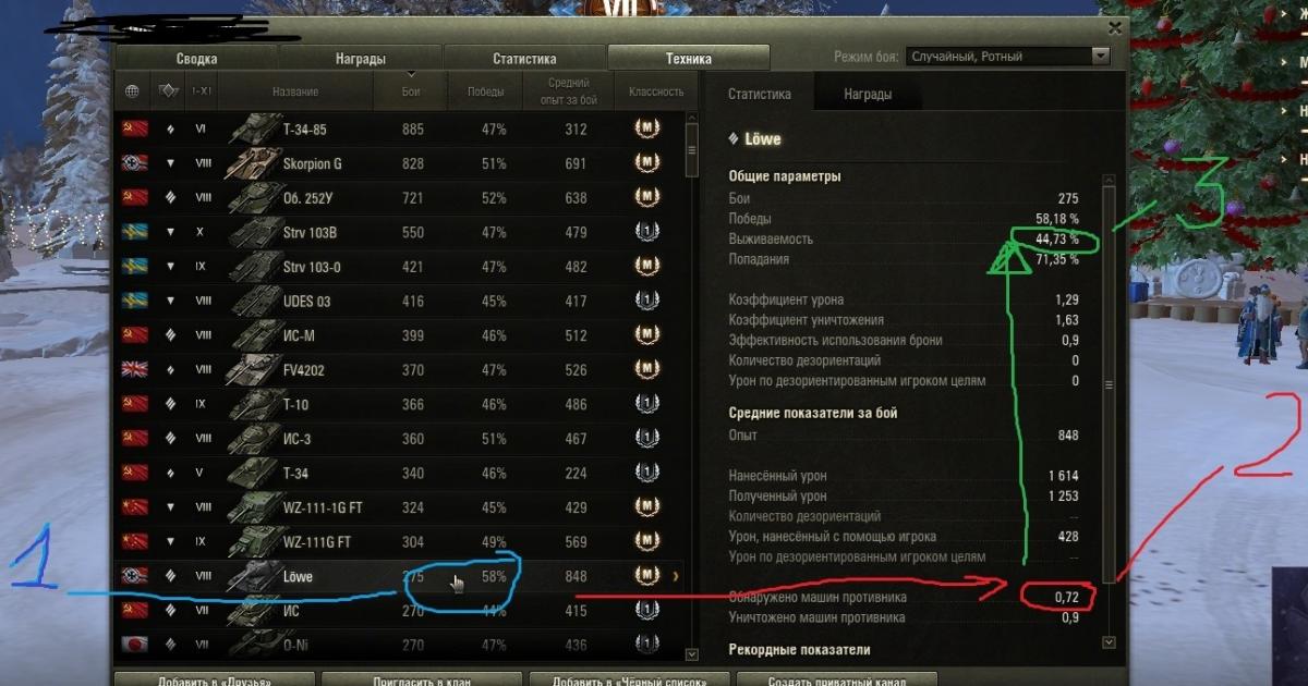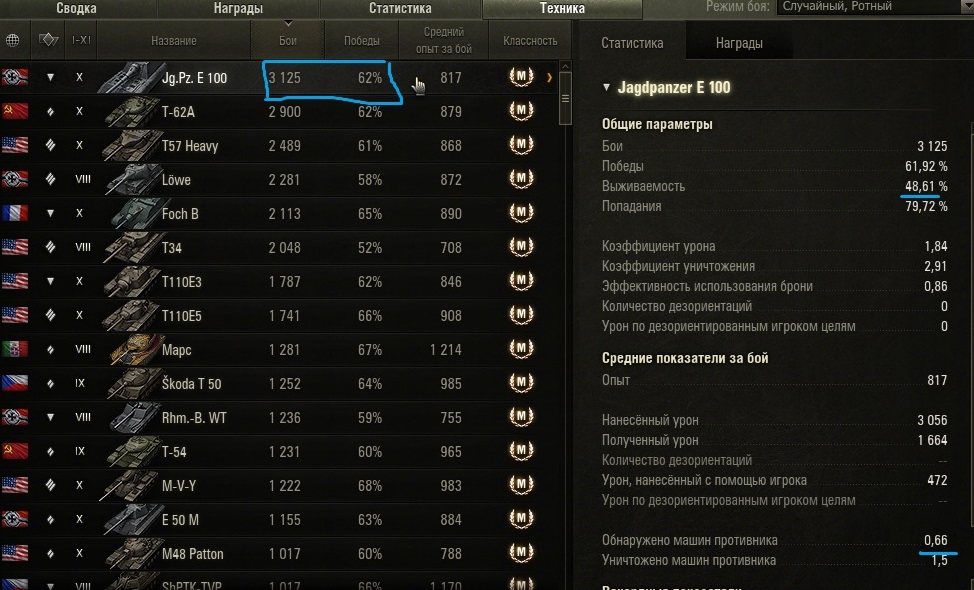 Приветствую. Есть раш рейтинг? - добавляйтесь в игре, мы единственные уникумы в игре. Думаете что сэйвовый снайпинг приносит больше побед?- Дерзайте аргументами, если умеете и понимаете что-то в стате. Итак, хотите быстро понять что-то об умениях игрока? - Для этого нужен, конечно же, открытый клиент игры и вкладка достижения которая расскажет нам почти все. Итак, есть игрок. Заходим в его достижения - техника, ничто не сортируем листаем вниз по убыванию количества боев: 1.Ищем самый высокий винрейт на интересном нам танке. https://forum-mt-prod.lesta.ru/monthly_12_2025/post-268857459-0-16532400-1765980179_thumb.jpg 2.Обращаем внимание на обнаружение. 3. Проверяем выживаемость. Далее вкладка награды. 4. Проверяем количество самой информативной награды дуэлянт. Норма - 1 на 10 боев для ст и тт. https://forum-mt-prod.lesta.ru/monthly_12_2025/post-268857459-0-36319100-1765980372_thumb.jpg 5. Смотрим что по групповым наградам: больше наград - больше должен быть винрейт. https://forum-mt-prod.lesta.ru/monthly_12_2025/post-268857459-0-20731200-1765980437_thumb.jpg Всё, если на одном из пунктов не найдено высоких для вас показателей, то на этом пункте и завершаем оценку. Оцениваем следующего. Если прошли все пункты и хотите подробного понимания про командную ценность, рациональность действий и понимание языка игры, то рассказываю дальше. Подробный раздел: Если вас устраивает и показатели похожи на ваши то вероятность побед будет увеличиваться по формуле: сила винрейта1 + сила винрейта2+сила винрейта3 +50%(сила может быть отрицательной, например при взводе 40% побед) Сила побед: определяется отношением вычета 50 процентов из процента побед на количества групповых наград на сотню боев. https://forum-mt-prod.lesta.ru/monthly_12_2025/post-268857459-0-57128000-1765981106_thumb.jpg Кто кому победок принес? Слабое усилие и влияние на победу - низкое отношение наград дуэлянт на ст, наличие групповых медалей. https://forum-mt-prod.lesta.ru/monthly_12_2025/post-268857459-0-38371100-1765981311_thumb.jpg Выживаемость как стиль игры. Высокое при низком винрейте - вопросы. Низкое при высоком винрейте-рациональность. Высокое обнаружение = штурмовой и засадный урон. Штурмовой и засадный урон ценнее стелса так как развивают события боя и дают выгодную ситуацию на миникарте. Стелс урон слабо развивает события на последней стадии боя и он разменивает ваших союзников в начале боя, о чем и скажет ваше низкое обнаружение. https://forum-mt-prod.lesta.ru/monthly_12_2025/post-268857459-0-19290300-1765983731_thumb.jpghttps://forum-mt-prod.lesta.ru/monthly_12_2025/post-268857459-0-00153800-1765981978_thumb.jpg Смотрим в сумме: награды заговоренный+ камикадзе+дуэлянт. Оцениваем умение наносить урон, помощь союзникам, нацеленность на фраги, игру со счетом и непосредственное влияние на исход. При этом проверяем отношение групповых наград на количество боев при данном проценте побед. Норма заговоренного - 1на 10 боев для ст и тт при высокой выживаемости. https://forum-mt-prod.lesta.ru/monthly_12_2025/post-268857459-0-28858300-1765983838_thumb.jpghttps://forum-mt-prod.lesta.ru/monthly_12_2025/post-268857459-0-88076200-1765982584_thumb.jpg Небольшая википедия по главным индикаторам: дуэлянт - 2фрага за бой которые нанесли критический или урон по вам. непосредственные активные действия как при штурме так и засаде. защита и прорыв направлений. урон и фраг тараном в счет, то есть хороший индикатор активной игры. заговоренный - принять урон от 4 противников и выжить с победой. езда по всей карте. смена позиций и засад. камикадзе - фраг тараном на уровень выше. засадный маневр, при высоком проценте побед - предшествующий эффективный снайпинг, рациональность за короткие