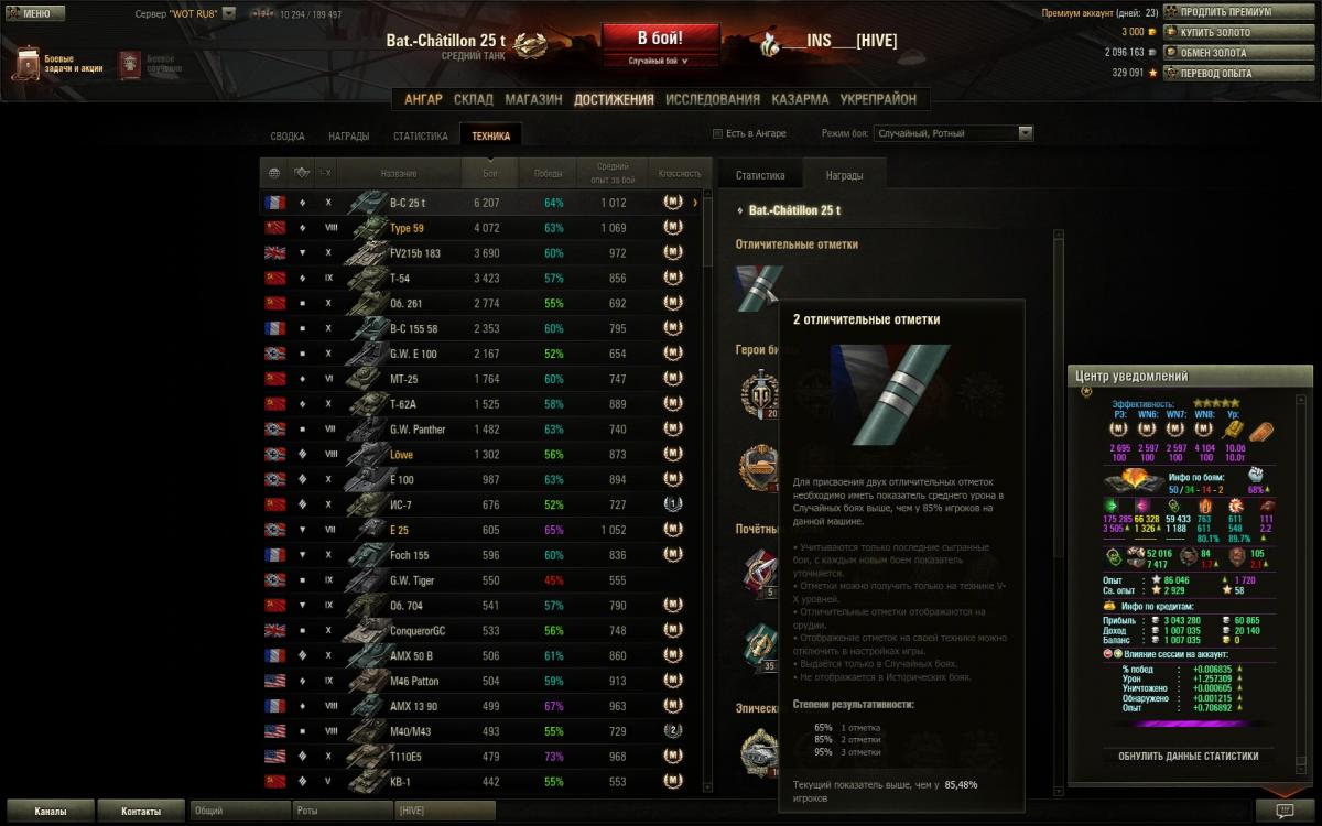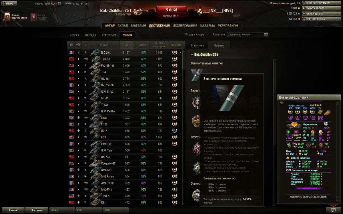 День добрый. Скажу сразу - я прочитал все доступные материалы и ответы разработчиков по получению отметок на ствол и тем не менее вопрос о том, каким образом рассчитывается показатель "вы лучше N% игроков" остается открытым. Пишут что для исключения случайных присвоений отметки статистика накапливается за какое-то количество последних боёв, в некоторых постах даже писали конкретные числа - 100 боёв. Я решился на эксперимент и провел подряд 100 боёв на наиболее катаемом мною танке - Bat. Chat. 25t. Очень уж хотелось мне получить эту третью отметку на этот танк. Ремарка - до патча мой максимальный показатель был 90%. На момент старта эксперимента показатель был около 86%. Итак, я провел подряд две серии по 50 боёв. В первой серии средний дамаг был 3822, во второй - 3505. Таким образом за крайних 100 боёв средний дамаг составил 3664. Скриншоты с результатами серий прилагаются. Каково же значение "отметочного" показателя? После первой серии показатель... уменьшился??! О_о и стал равен 84.92. После второй серии поднялся аж до 85.48. В общем не могли бы вы показать мне те 15% рандомных нагибаторов, которые держат средний дамаг выше 3664? Разумеется, найдется некоторое количество уникальных игроков которым это под силу, но 15% всех игроков?