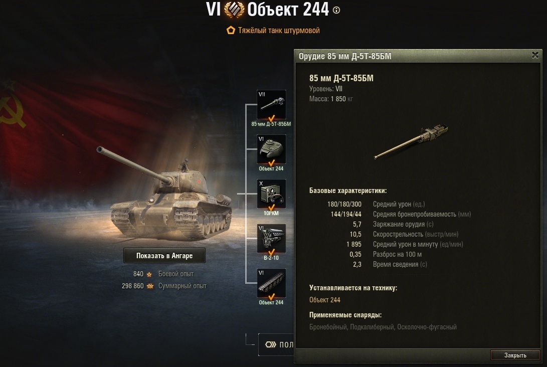 Данная тема посвящена премиумному тяжелому танку советской ветки "Объект 244". Впервые его можно было приобрести в составе VIP-пакета с пригласительным билетом на "танковый фестиваль", который состоялся в декабре 2018 года. С тех пор танк на постоянной основе в продажу не вводился, однако его можно было купить в рамках различных разовых акций. Например, во время акции "Торговый караван" в январе 2025 г. был шанс получить танк за выполнение покупной задачи за 4200 золота. За выполнение мог случайно выпасть один из следующих танков VI уровня: "Объект 244", "Кромвель Б", "Шерман-Файрфлай", "Бретань-Пантера". Также с выходом патча 1.32 танк в числе прочих машин VI уровня был включен в состав возможных наград за реферальную программу из "особого контейнера с машиной VI уровня". По состоянию на март 2026 г. танк в игре не продается, но на официальной странице с бонус- и инвайт-кодами значится инвайт-код TANKITOP1RU, который дает "Объект 244" (кроме прочих плюшек) в аренду на 10 боев, а также инвайт-код MTSTART, дающий возможность заработать этот танк насовсем за некоторую цепочку задач. На существующий аккаунт инвайт-коды не применяются, но при создании нового аккаунта могут пригодиться... По крайней мере, существует подобная возможность провести "тест-драйв" данного танка. Техническая стоимость "Объекта 244" изначально (по крайней мере, с августа 2020 г.) составляла 4900 единиц золота. С 4 мая 2023 г. техническую стоимость всей премиумной и акционной техники VI уровня в "Мире танков" в рамках акции сдалали одинаковой, приравняв к 6000 золота. Сначала временное, с 31 мая 2023 г. это изменение цен сделали постоянным. 1. Исторический прототип "...Котин облазал трофейный "Тигр" от гусениц до дульного тормоза и хмуро вытянулся перед Сталиным. - В общем, товарищ Сталин, одно из двух - либо это мутант, либо... Полный звиздец, - твердо сказал Котин. - Как говорил товарищ Ленин: нет такого звиздеца, который не перезвиздели бы большевики..." (с) "История танка Тигр" 2. ТТХ и модули в игре, плюсы и минусы танка "...После твоего пробития у врага всегда останется хотя бы 1%. И с этим процентом он навоюет больше, чем с предыдущими 99-ю..." (с) "Мир танков глазами пессимиста" 2.1. Орудие "Если сбивают гусеницу тебе, то разворачивает самым слабым местом к врагу. Если снимаешь гусеницу врагу, его разворачивает самым непробиваемым местом к тебе..." (с) "Мир танков глазами пессимиста" 2.2. Бронирование танка Положительные и отрицательные стороны тяжелого танка "Объект 244" в игре. Плюсы: + отличное для своего уровня бронирование; + точное и скорострельное орудие, высокий урон в минуту; + неплохие для ТТ подвижность и маневренность; + компактные размеры (сложнее попасть); + хорошая для ТТ маскировка; + премиум статус: пересадка экипажей без штрафа, повышенный заработок в боях. Минусы: - мал разовый урон орудия, посредственная пробиваемость; - посредственные углы склонения орудия (сложно играть от рельефа); - плохой обзор; - небольшой для ТТ запас прочности. 3. Экипаж "...Когда нужно быстро сменить позицию, обнаруживается, что у тебя закритован двигатель..." (с) "Мир танков глазами пессимиста" На танке требуется типовой экипаж из 4 человек: командир (он же радист), наводчик, механик-водитель и заряжающий. На премиумной машине, скорее всего, будут ездить обученные танкисты с другого танка... На случай, если не качаете советские "тяжи", или хотите воспитать для "244" о