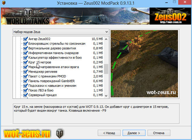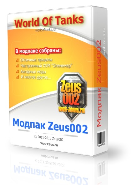 ModPack Zeus002 - сборка лучших модов для Мир Танков С помощью энтузиастов игры "Мир танков" разрабатываются множество модификаций для клиента. Среди них есть незначительные моды и есть очень нужные и полезные. Например, новый и удобный прицел можно установить с помощью модов. Или «умную» миникарту, на которой отображаются круги обзора в зависимости от умений экипажа танка и установленного оборудования. Мы отобрали самые полезные и удобные моды и собрали их в один ModPack Zeus002. Вы можете скачать его и легко установить с помощью удобного инсталлятора, разработанного нами. В ModPack Zeus002 только проверенные и необходимые моды, которые улучшают игру, а не превращают её в неповоротливого монстра. К тому же, вы ещё в процессе установки сможете отключить установку второстепенных модов, которые вам покажутся ненужными. На текущий момент по многочисленным просьбам в установщике модпака реализовано отображение картинки и описания для выбранного мода. Теперь вы сможете увидеть примерно, как выглядит выбранный вами мод и прочитать его описание. Для автоматической установки предустановлено два пресета: «Набор модов Zeus» и «Набор модов Alex». Они включают самые оптимальные настройки установки модов. Если вам нужен свой набор устанавливаемых модификаций, то отметьте галочками нужные моды вручную. ВНИМАНИЕ!!! Перед установкой модпака не забудьте выйти из игры, иначе модпак не установится правильно! Обратите внимание также, что установщик удалит предыдущие моды, установленные в папку res_mods. Это необходимо, чтобы избежать конфликтов с другими модами, не протестированными в нашей сборке. Установка модпака: Запустить инсталлятор, выбрать папку с установленной игрой и следовать инструкциям установщика. Всё просто и без нудного выбирания сотен модов. Внимание! Если после установки модпака при входе в бой у вас пропадает игровой интерфейс, то выйдите из игры, нажав комбинацию клавиш "ALT+F4" и как можно скорее зайдите в бой повторно на ТОТ же сервер, чтобы его закончить. В дальнейшем почистите игровой кэш и обновите драйвера видеокарты, чтобы устранить проблему. В модпаке есть мод, который возвращает старые красивые миникарты в бою. ВНИМАНИЕ! Мой модпак ТОЛЬКО для стандартного режима игры Скачивайте модпак ТОЛЬКО с этой ветки форума или с моего сайта ССЫЛКА. На остальных сайтах возможен вирус. Список модов в сборке Modpack Zeus002:XVM-13.0.0 (modxvm.com) Улучшенные картинки танков в ушах во время боя от Zeus002 Быстрый выход из боя в ангар по комбинации клавиш ALT+F1 Траектории заезда танков (подсадки) Изображения миникарт от версии 0.9.15 Прицел Маракаси (Andre_V) Прицел DelluxПрицел Amway921Прицел TAIPAN 2Прицел Дамоклов МечПрицел МуразораПрицел Разрушитель (Andre_V) Прицел Элизиум Прицел Oreshkin Прицел OverCrossПрицел SpectrПрицел Гефест (Zeus002) - улучшает FPSПросмотр всех танков в дереве (The_IzeBerg) Коррекция дальномера (GPCracker)Прогресс выполнения ЛБЗ во время бояПоказ перков в бою (клавиша Backspace) Фильтр спама по миникарте Направление орудий на миникарте (PyThOn_DeVeLoPeR) ХП команд в бою (Armagomen)Послебоевая статистика с девушками (можно отключить установку) (Zeus002)Включение/Выключение серверного прицела в бою (Dark_Knight_MiX)Круг отрисовки на миникартеАрт прицел Battle Assistant (клавиша G) (reven86)Улучшенные картинки танков в ангаре (TPblHbl4_78)Автоснятие и автоустановка стереотрубы и масксети (XVM)Потанковый рейтинг xTE в окне достижений (XVM)Параметры 