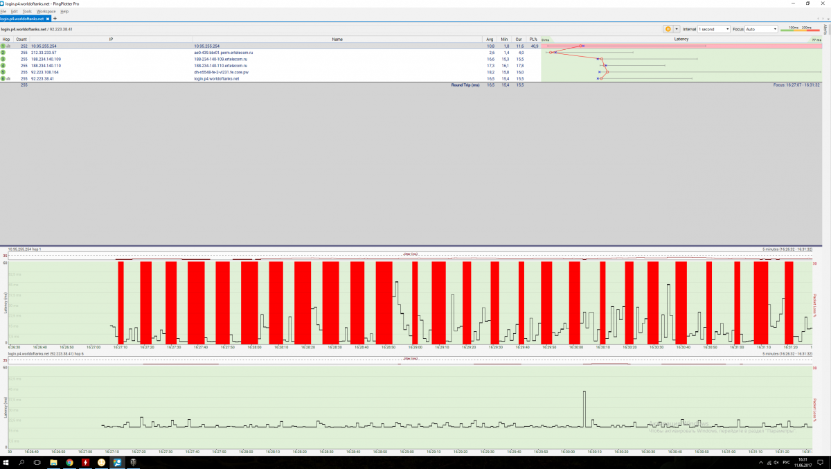 Добрый день! Пинг в игре показывает 15-15, лампочка не мигает. Все объекты, кроме моего танка двигаются нормально. Он как-будто буксует в текстурах. Наблюдается постоянно, играть невозможно. При этом с поворотом башни, ни со снайперским прицелом проблем нет. Приложу реплей, там все видно в первые 10 секунд начала боя. И скрин пинг-плоттера. Что было сделано: Вчера отформатировал диск и переустановил win, игру. Позвонил провайдеру (Дом.ру), он проверил соединение, с помощью меня установил на компьютер программу по сбору информации по соединению, сказал с интернетом проблем нет. Я указал на то, что идут потери на первом узле (потери ли?), который, как я понял принадлежит провайдеру, на что мне ответили, что на последнем узле (сервер игры) потерь нет, пинг нормальный, значит все в порядке. Подскажите, пожалуйста, может я не правильно понял показания программы? Что посоветуете делать? Спасибо ! UPD Скорость скачивания и серфинга, кстати нормальная replay_last_battle.wotreplay