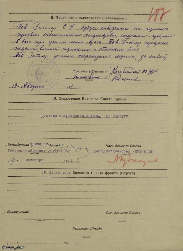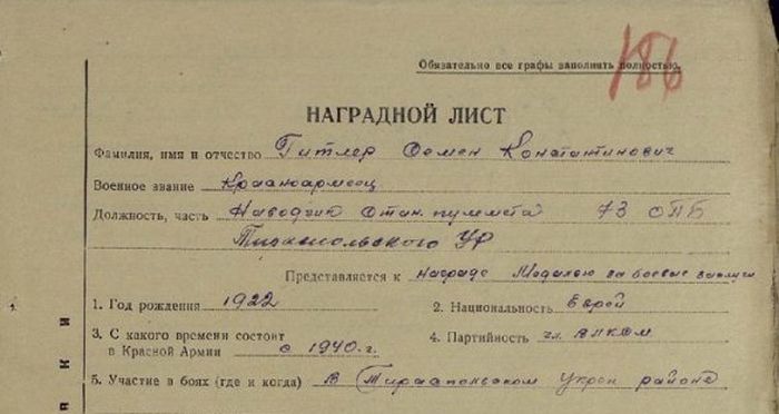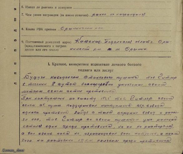 http://cdn-frm-eu.wargaming.net/wot/ru/uploads/monthly_05_2017/post-7013522-0-19356700-1494318634_thumb.jpg http://cdn-frm-eu.wargaming.net/wot/ru/uploads/monthly_05_2017/post-7013522-0-42795700-1494318643_thumb.jpg http://cdn-frm-eu.wargaming.net/wot/ru/uploads/monthly_05_2017/post-7013522-0-23996400-1494318656_thumb.jpg Красноармеец *** при обороне 174,5 высоты Тираспольского укрепительного райна в течение восьми суток уничтожал своим огнем противника. Будучи наводчиком станкового пулемета, поддерживал огнем наступление своего взвода. Оказавшись в окружении и получив ранение, тов. *** вел огонь, пока не израсходовал боеприпасы, после чего, не бросив оружия, выбрался к своим, в общей сложности уничтожив более сотни военнослужащих Вермахта. За свой подвиг *** награжден медалью "За Отвагу".