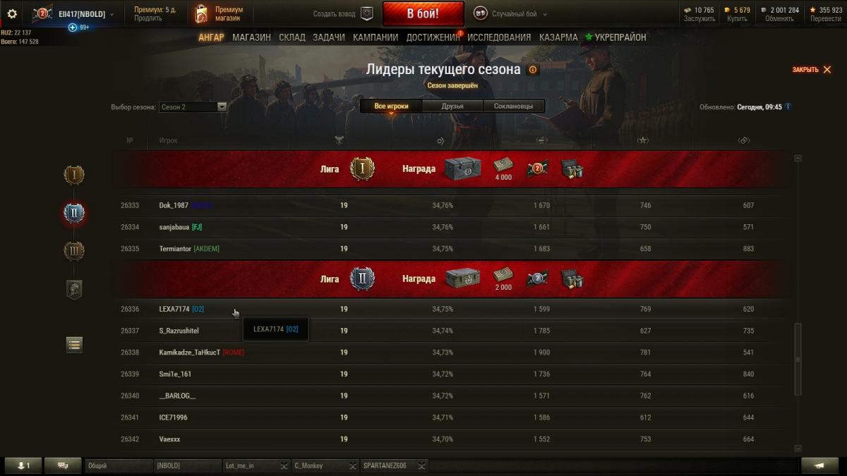 Почему позиция игрока упала после окончания ранговых? Разве она не может ТОЛЬКО увеличиваться? (в связи с удалением игроков на запрещенке из списка участников) Запечатлел сей факт после того как сам потерял позицию. Решил что нужны скриншоты.. заскриншотил свою уже изменившуюся позицию (после падения она уже не изменилась) и позицию игрока занимавшего последнюю строчку в первой лиге (игрок LEXA7174 клан О2). В дальнейшем моя позиция уже не менялась, а его упала на одну строчку, что оставило его за пределами первой лиги. Первый скриншот - от 22.08.2018, второй - от 27.08.2018. Кого там впихивают в первую лигу после завершения сезона? http://cdn-frm-eu.wargaming.net/wot/ru/uploads/monthly_08_2018/post-2431752-0-02791900-1535353879_thumb.jpghttp://cdn-frm-eu.wargaming.net/wot/ru/uploads/monthly_08_2018/post-2431752-0-95949200-1535353891_thumb.jpg