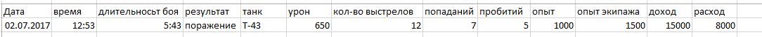 Господа разработчики! Предлагаю сохранять результаты боя, те что выводятся в ангаре после боя, в файл в формате csv, чтобы всегда можно было посмотреть/проанализировать как изменилась игра. Инфу сохранять общую, т.е. без расписывания по кому попал, что пробил, а только кол-во попаданий, суммарный засвет, кол-во обнаруженных и т.п.. Примерно в таком виде: http://cdn-frm-eu.wargaming.net/wot/ru/uploads/monthly_07_2017/post-81319-0-97504700-1498955645_thumb.jpg