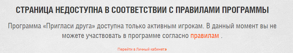 Утро доброе. Итак суть проблемы и вопроса из нее исходящего. Был созданн аккаунт, по этой программе его пригласил знакомый в игру и мы знатно покатались взводом. В правилах жанной программы четко указан определенный, очень важный пункт (пол года как указан). http://cdn-frm-eu.wargaming.net/wot/ru/uploads/monthly_09_2015/post-5765554-0-61628800-1443506184_thumb.jpg Как оказалось к моему глубочайшему удивлению я теперь не могу пригласить с того аккаунта друга и купить ему сразу премиум танк в подарок дабы мы могли покатать во взводе и получить бонусный опыт, а в итоге и танк на аккаунт. В полном противоречии с тем что написано на официальном первоисточнике в течении полугода. Я человек глубоко верующий в Вайргейминг и перед созданием этой темы воспользовался поиском по форуму, вдруг я не первый кто столкнулся с даной ошибкой. И таки да, не первый. Вот например тема месячной давности где разработчик опровергает выделеную на скриншоте строчку. Теперь вопрос. На сколько сложно было за пол года (ну или за месяц с небольшим после ответа официального лица о несоответствии должны то были знать) исправить 1 строчку на сайте? Я прочитал условия программы, седлал аккаунт, в него уже вложено около 2к $ основываясь на официальной информации и тут такая "радость привалила". Создавай мол новый аккаунт. Очень бы хотелось увидеть оффициальный ответ по даному вопросу и увидеть исправления.