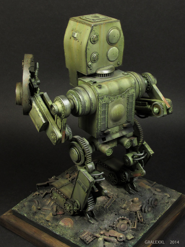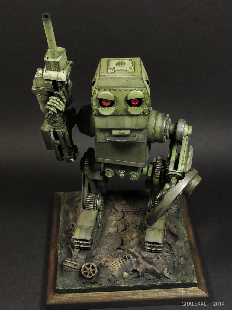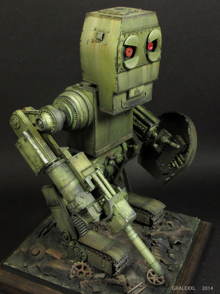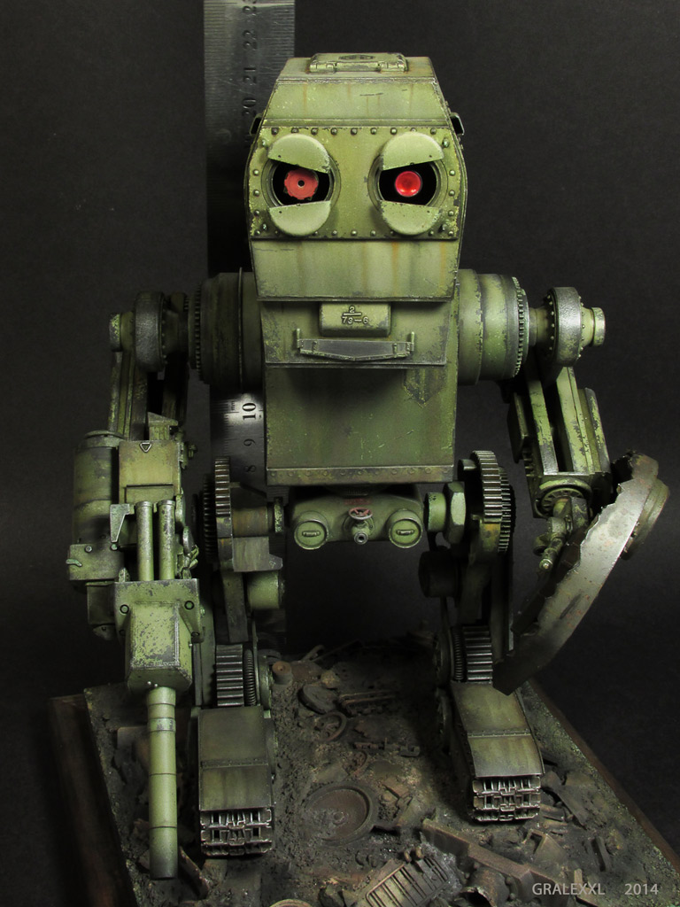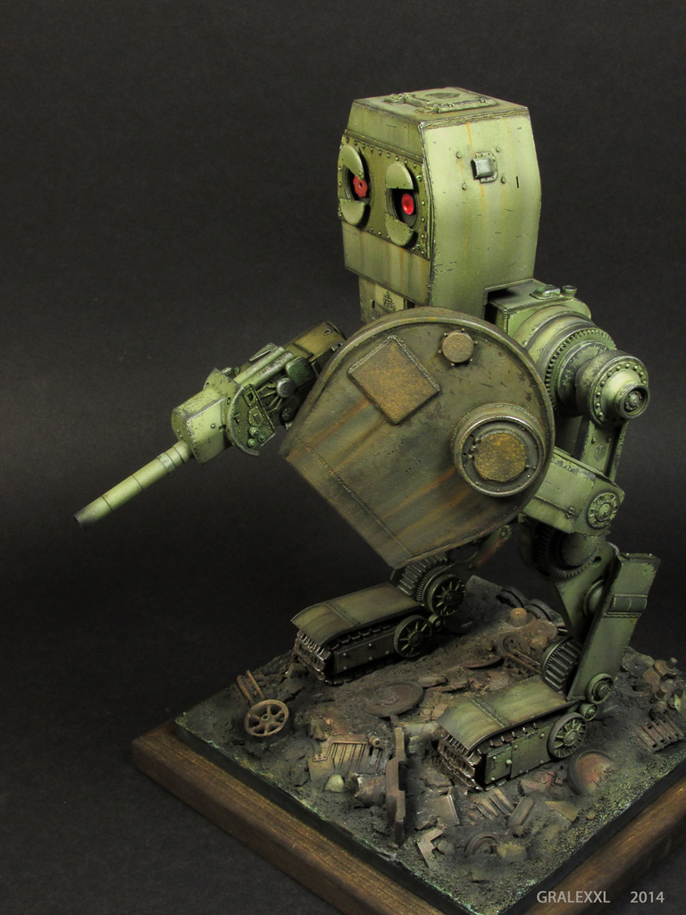 Слава Богу - успел :) Роботанк готов и опубликован в конкурсной теме! Отсутствие свободного времени создавало определённые трудности. Даже бросить хотел. Но вот результат: http://i65.fastpic.ru/big/2014/1208/92/2e0ef5ea6a14b5f18c56b6e5dd9c5c92.jpg Работать над моделью было интересно, поэтому хочу поделиться с кем ни будь :) историей её создания. Изнурив себя на светляке из спичек Т-70/80 (там я не успел), решил выбрать для роботанка тот же прототип, так как изучил эти танки вдоль и поперёк. Поскольку временной отрезок создания прототипов 30-40-е годы, я задумался - как инженеры того времени могли бы решить "поставленную партией и народом" задачу? Как выглядел бы военный робот в 40-е? Ну точно вряд ли как современные трансформеры! (продолжение следует) а пока - спойлер:
