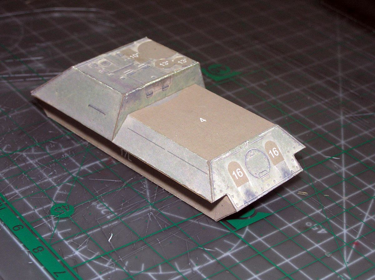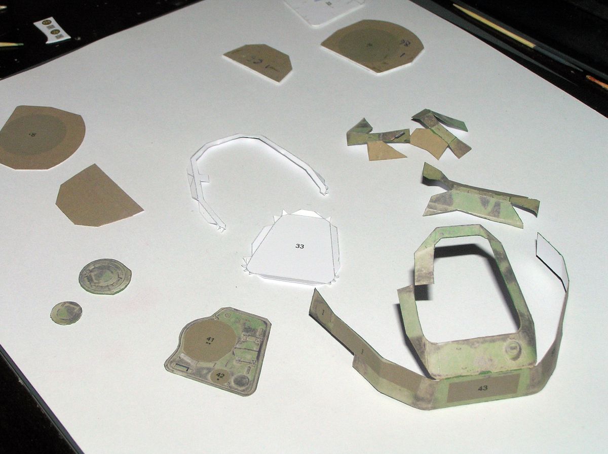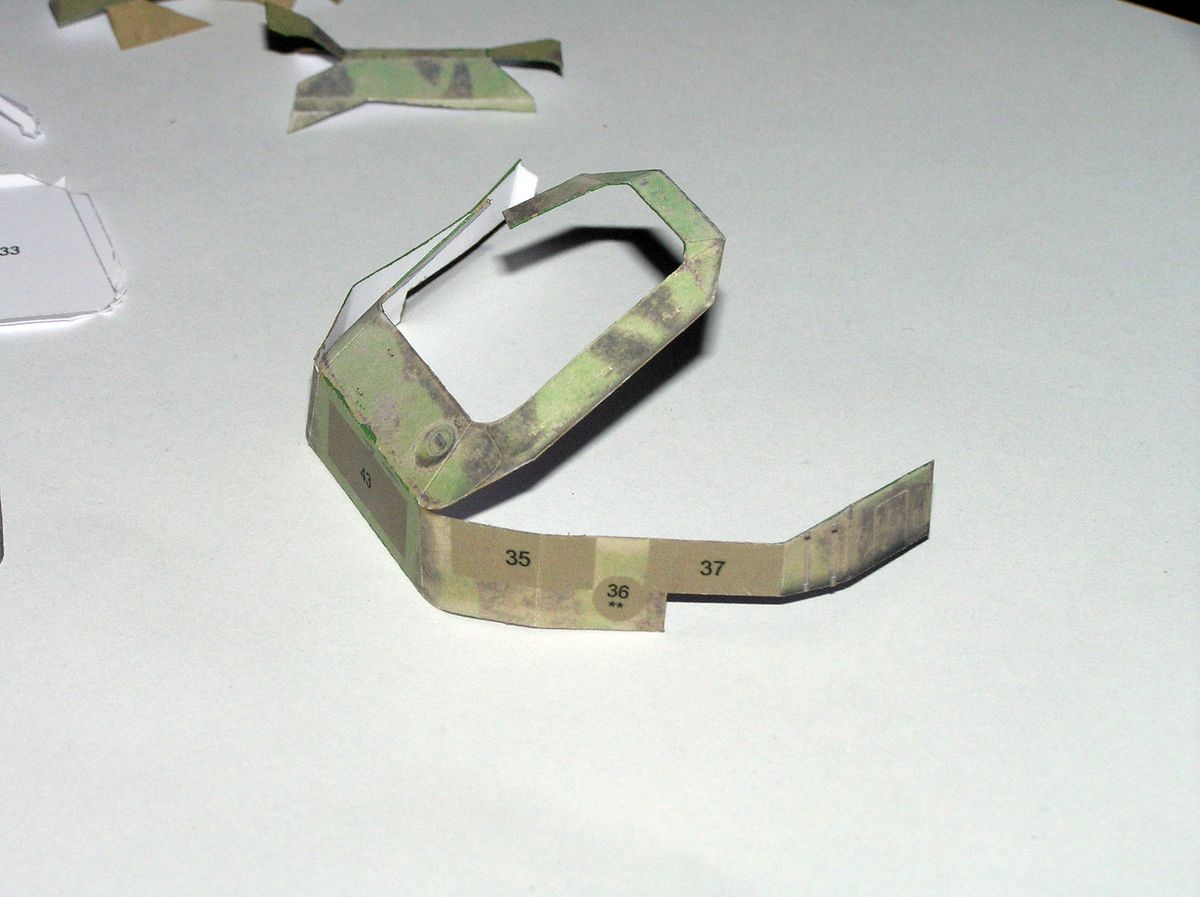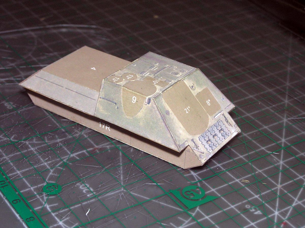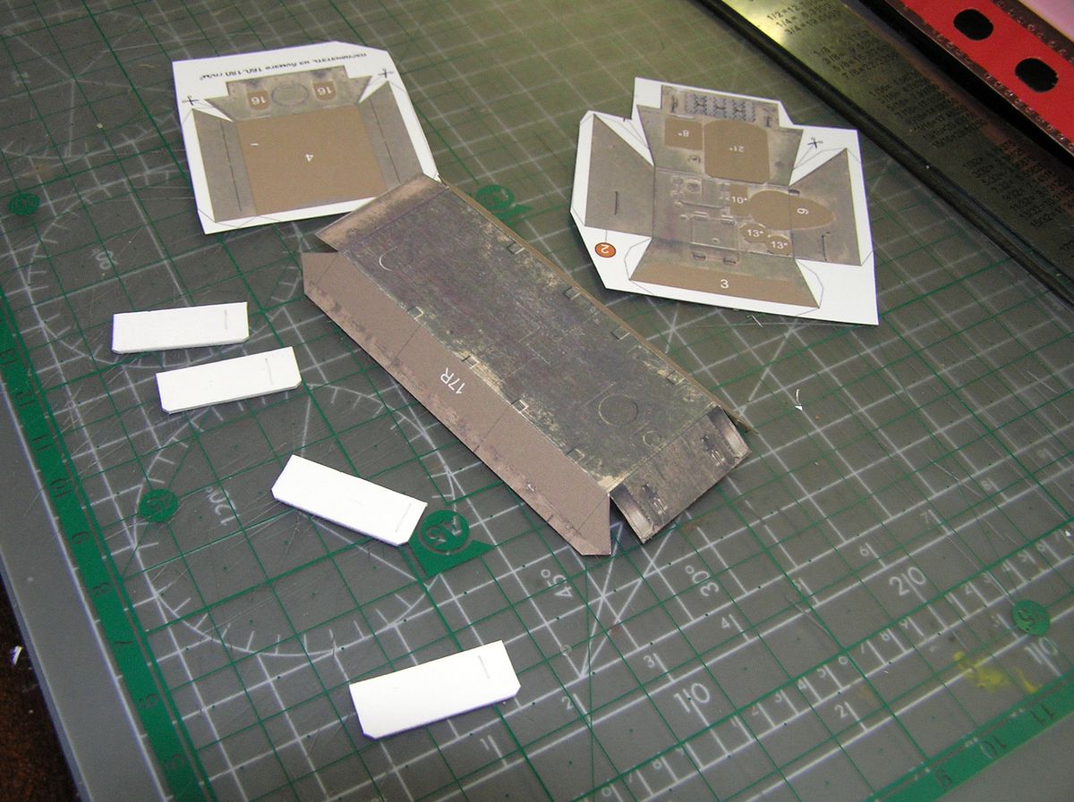 Скачать брошюру для сборки модели Waffentrager auf E100 в версии "Макет танка" можно тут. Печатать детали лучше всего на бумаге плотностью 160 г/м2 (некоторые листы - на бумаге плотностью 80 г/м2). Для сборки также понадобится картон и проволока различных диаметров, а также акриловая краска для закрашивания торцов бумажных деталей и проволочных деталей. Перед началом работы рекомендую почитать статьи: Инструменты и материалы для бумажного моделизма. Хочу победить в "Бронекоробочке" 1 http://cdn-frm-eu.wargaming.net/wot/ru/uploads/monthly_09_2020/post-718256-0-49061800-1601288101_thumb.jpg В соответствии со схемой 1 склеиваем ванну корпуса из деталей 1, 2L, 2R, 3, 4, 5, 6L, 6R, 7L, 7R. 2 http://cdn-frm-eu.wargaming.net/wot/ru/uploads/monthly_09_2020/post-718256-0-26655800-1601288104_thumb.jpg Вид снизу на корпус. Деталь 8а можно с самого начала использовать как ориентир для уточнения толщины 2R и 2L. 3 http://cdn-frm-eu.wargaming.net/wot/ru/uploads/monthly_09_2020/post-718256-0-64045400-1601288111_thumb.jpg http://cdn-frm-eu.wargaming.net/wot/ru/uploads/monthly_09_2020/post-718256-0-78591700-1601288113_thumb.jpg Склеиваем между собой детали 9 и 9а, предварительно проклеенные на картон. 4 http://cdn-frm-eu.wargaming.net/wot/ru/uploads/monthly_09_2020/post-718256-0-85635300-1601288118_thumb.jpg В соответствии со схемами 2 и 4 склеиваем деталь 8. Я эту деталь усилил изнутри путем проклейки дополнительных слоев бумаги с изнанки. При этом необходимо слегка подшлифовать детали 2R и 2L в месте приклейки детали 8. 5 http://cdn-frm-eu.wargaming.net/wot/ru/uploads/monthly_09_2020/post-718256-0-53458000-1601288116_thumb.jpg Приклеиваем к детали 8 детали 18L, 18R, 24, 25, 26, 27, 27а, 28, 29, 30 – для дополнительной жесткости детали 8. Во-первых, приклейка этих деталей проще, пока деталь не приклеена к корпусу. Во-вторых, так легче избежать прогибов на детали 8 6 http://cdn-frm-eu.wargaming.net/wot/ru/uploads/monthly_09_2020/post-718256-0-28093100-1601288128_thumb.jpg Приклеиваем к ванне корпуса деталь 8, затем – склеенные между собой детали 9 и 9а. 7 http://cdn-frm-eu.wargaming.net/wot/ru/uploads/monthly_09_2020/post-718256-0-38400300-1601288123_thumb.jpg Перейдем к сборке подвески. Склеиваем детали 45, 45а, 45b, а также блоки пружин 46, 47, 47а и 47b. Приклеивать эти детали к корпусу рекомендую в следующем порядке: сначала деталь 45, затем оси балансиров 48, затем блоки пружин 46+47. 8 http://cdn-frm-eu.wargaming.net/wot/ru/uploads/monthly_09_2020/post-718256-0-36508100-1601288140_thumb.jpg Вид сбоку на места крепления подвески. Обратите внимание на "отсебятину" в местах крепления ведущих катков и ленивцев - это сделано для упрочнения крепления этих катков и упрощения их позиционирования. 9 http://cdn-frm-eu.wargaming.net/wot/ru/uploads/monthly_09_2020/post-718256-0-33933400-1601288130_thumb.jpg Я выбрал усложненную версию ходовой, состоящую из 32 отдельных "блинчиков" опорных катков. В процессе сборки и проклейки на картон это может слегка пугать. Опорные катки делятся на катки внутреннего ряда и катки внешнего ряда 10 http://cdn-frm-eu.wargaming.net/wot/ru/uploads/monthly_09_2020/post-718256-0-85113700-1601288132_thumb.jpg Собранные катки внутреннего ряда 11 http://cdn-frm-eu.wargaming.net/wot/ru/uploads/monthly_09_2020/post-718256-0-43454000-1601288134_thumb.jpg Собранные катки внешнего ряда 12 http://cdn-frm-eu.wargaming.net/wot/ru/uploads/monthly_09_2020/post-718256-0-44827200-1601288138_thumb.jpg Балансиры внешнего ряда катков. К балансирам приклеены оси, которые будут вставляться в детали 48 и оси внешнего ряда катков. Эти оси - чисто моя самодеятельность, с их помощью проще позиционировать катки и сами балансиры. Да и держаться они за счет этого намного крепче. 13 http://cdn-frm-eu.wargaming.net/wot/ru/uploads/monthly_09_2020/post-718256-0-37905100-1601288136_thumb.jpg Дополнительная "отсебятина": 1) подставка под корпус для одинакового клиренса по всей длине ходовой - иначе говоря, корпус везде будет отстоять от поверхности стола на одно и то же расстояние (7мм); 2) "направляющие" для регули