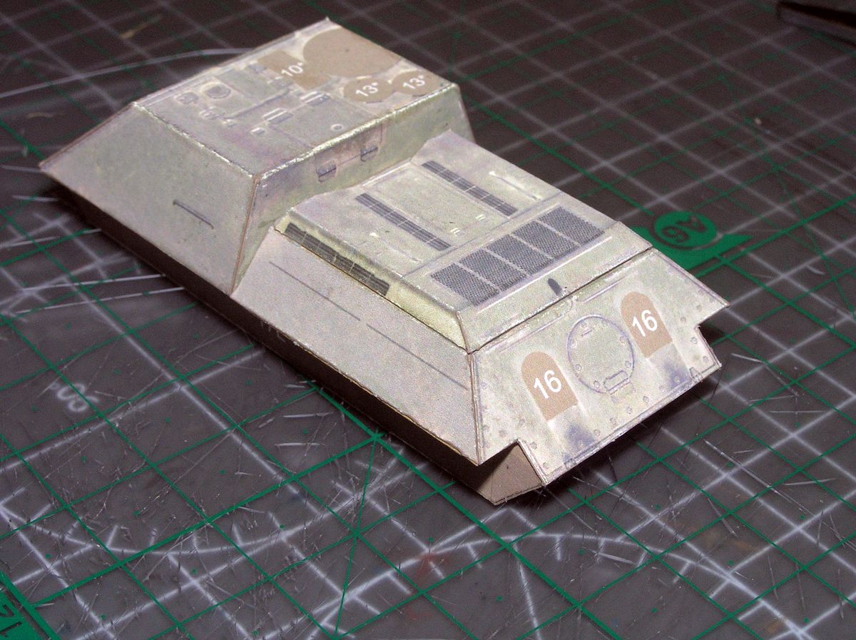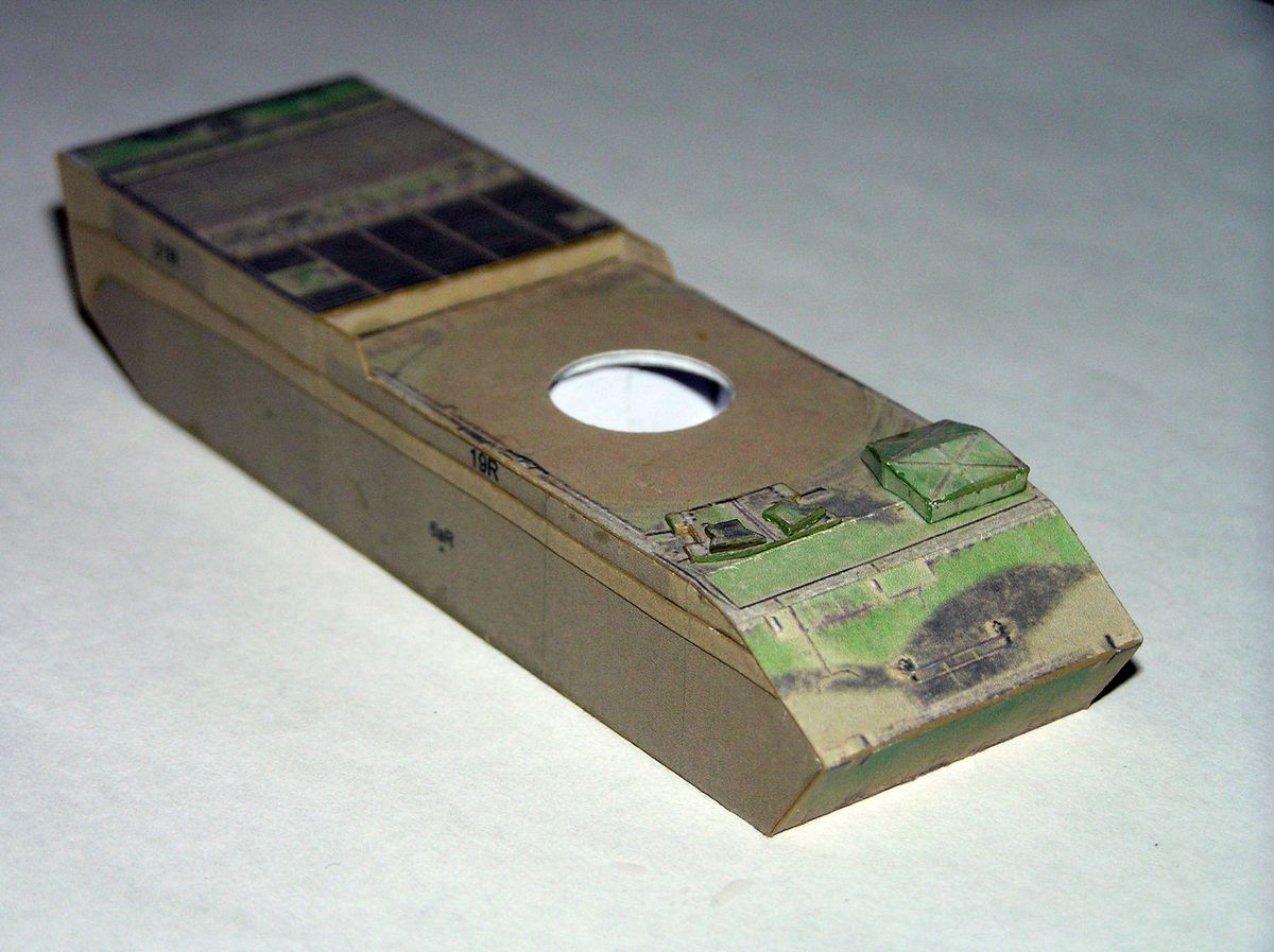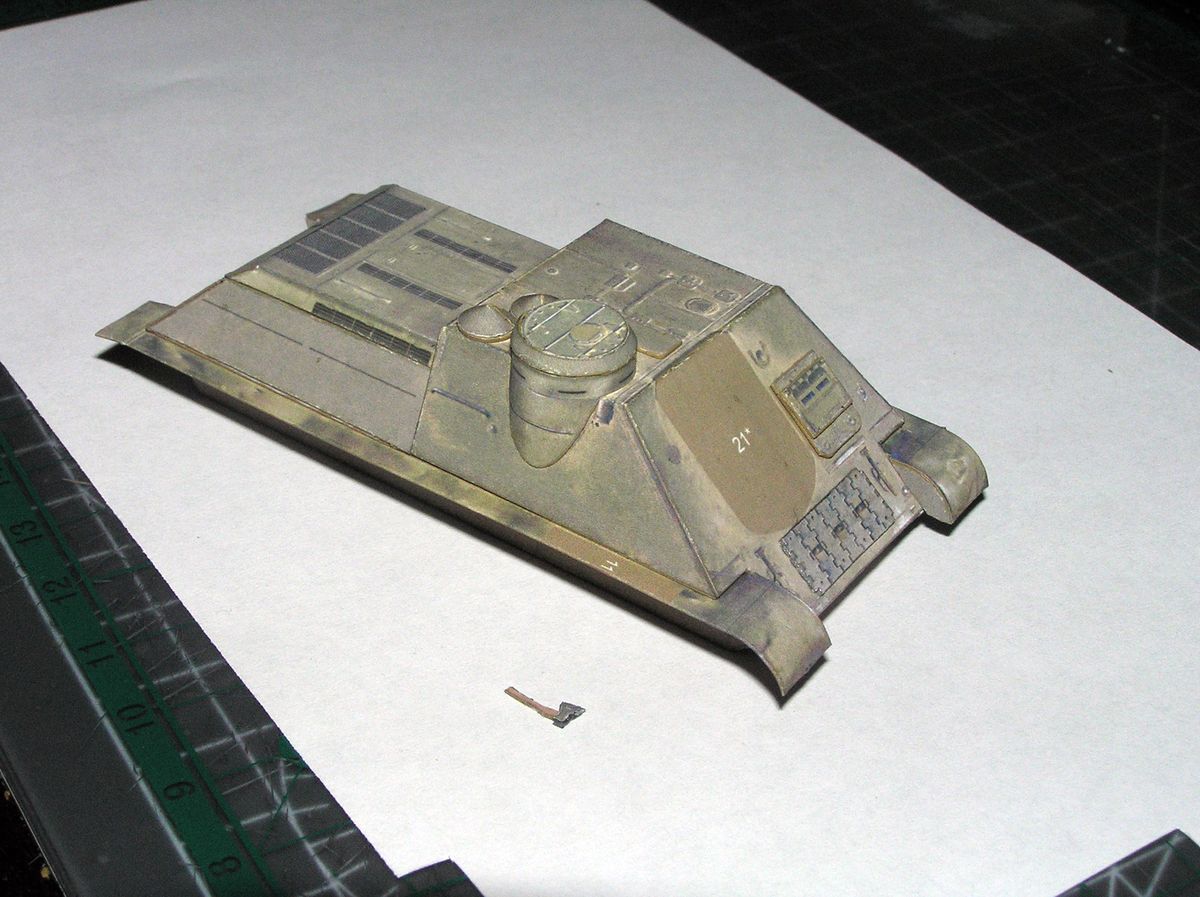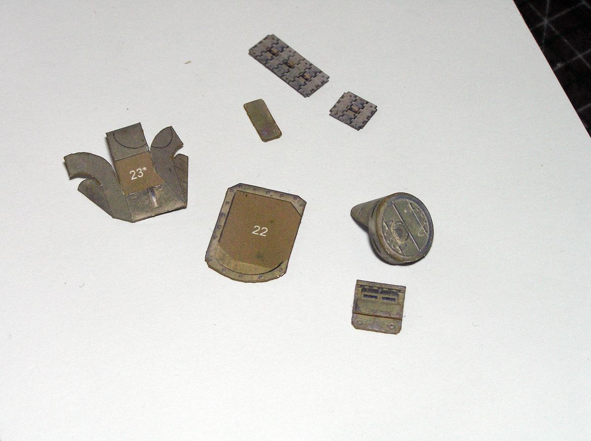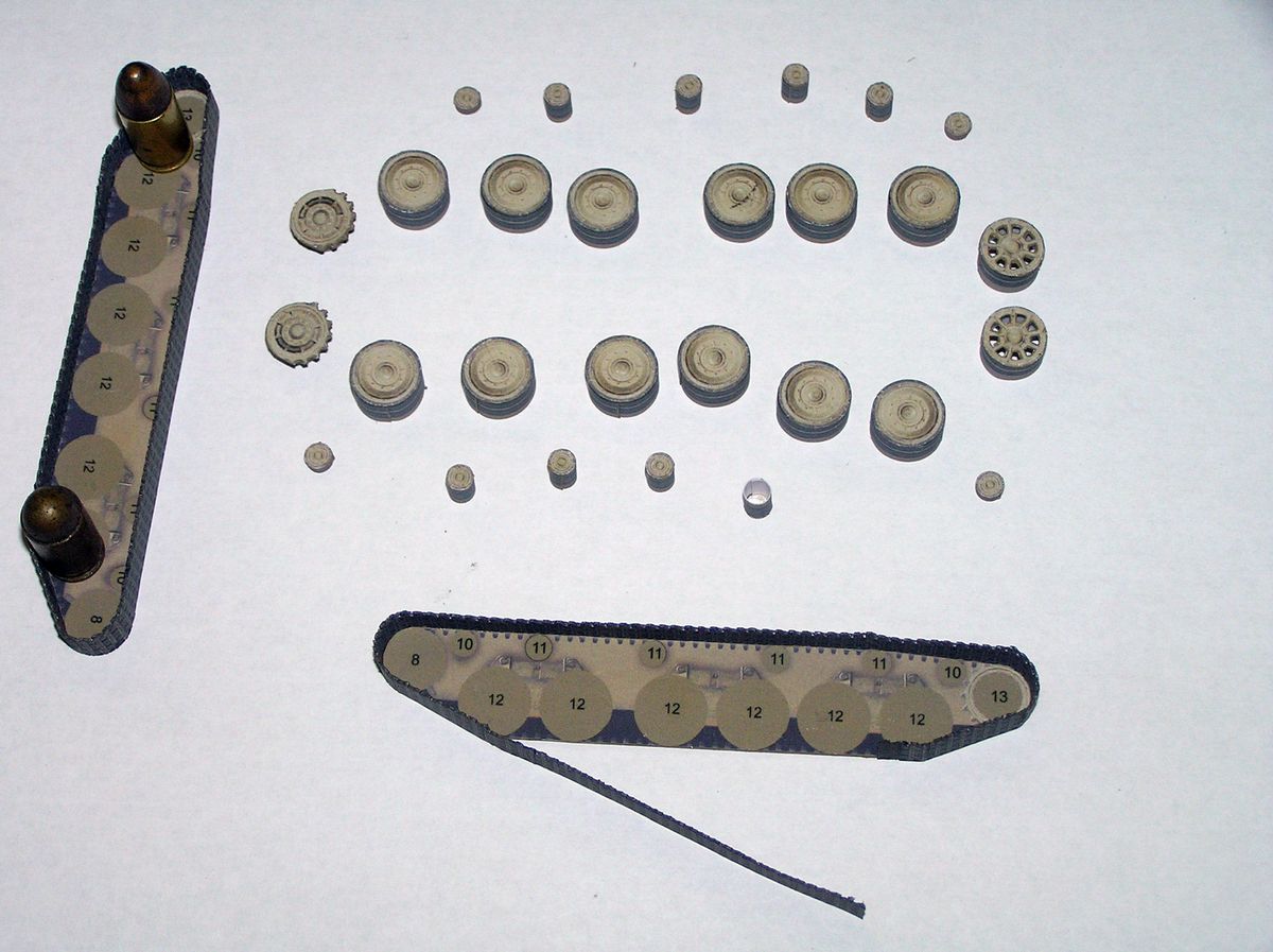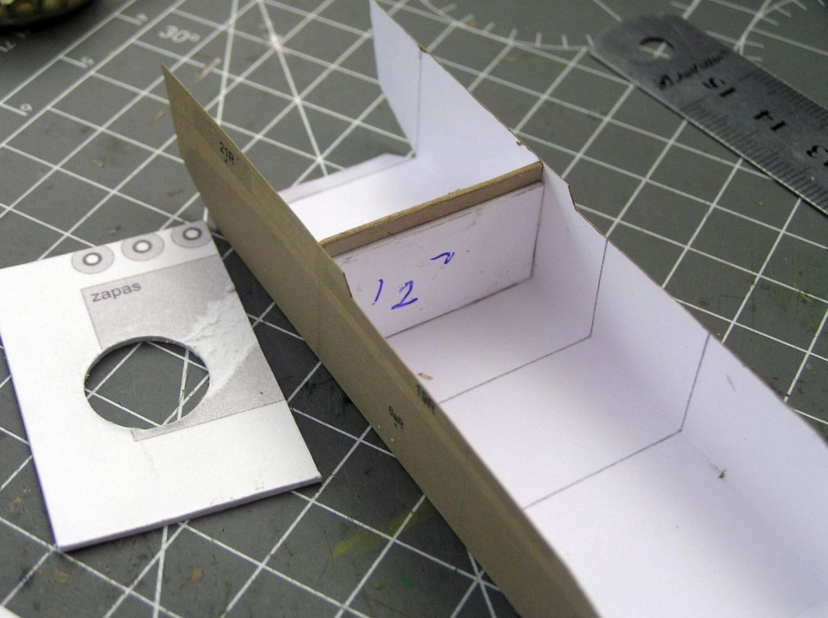 Скачать брошюру для сборки модели Waffentrager auf E100 в версии "Макет танка" можно тут. Печатать детали лучше всего на бумаге плотностью 160 г/м2 (некоторые листы - на бумаге плотностью 80 г/м2). Для сборки также понадобится картон и проволока различных диаметров, а также акриловая краска для закрашивания торцов бумажных деталей и проволочных деталей. Перед началом работы рекомендую почитать статьи: Инструменты и материалы для бумажного моделизма. Хочу победить в "Бронекоробочке" 1 http://cdn-frm-eu.wargaming.net/wot/ru/uploads/monthly_09_2020/post-718256-0-49061800-1601288101_thumb.jpg В соответствии со схемой 1 склеиваем ванну корпуса из деталей 1, 2L, 2R, 3, 4, 5, 6L, 6R, 7L, 7R. 2 http://cdn-frm-eu.wargaming.net/wot/ru/uploads/monthly_09_2020/post-718256-0-26655800-1601288104_thumb.jpg Вид снизу на корпус. Деталь 8а можно с самого начала использовать как ориентир для уточнения толщины 2R и 2L. 3 http://cdn-frm-eu.wargaming.net/wot/ru/uploads/monthly_09_2020/post-718256-0-64045400-1601288111_thumb.jpg http://cdn-frm-eu.wargaming.net/wot/ru/uploads/monthly_09_2020/post-718256-0-78591700-1601288113_thumb.jpg Склеиваем между собой детали 9 и 9а, предварительно проклеенные на картон. 4 http://cdn-frm-eu.wargaming.net/wot/ru/uploads/monthly_09_2020/post-718256-0-85635300-1601288118_thumb.jpg В соответствии со схемами 2 и 4 склеиваем деталь 8. Я эту деталь усилил изнутри путем проклейки дополнительных слоев бумаги с изнанки. При этом необходимо слегка подшлифовать детали 2R и 2L в месте приклейки детали 8. 5 http://cdn-frm-eu.wargaming.net/wot/ru/uploads/monthly_09_2020/post-718256-0-53458000-1601288116_thumb.jpg Приклеиваем к детали 8 детали 18L, 18R, 24, 25, 26, 27, 27а, 28, 29, 30 – для дополнительной жесткости детали 8. Во-первых, приклейка этих деталей проще, пока деталь не приклеена к корпусу. Во-вторых, так легче избежать прогибов на детали 8 6 http://cdn-frm-eu.wargaming.net/wot/ru/uploads/monthly_09_2020/post-718256-0-28093100-1601288128_thumb.jpg Приклеиваем к ванне корпуса деталь 8, затем – склеенные между собой детали 9 и 9а. 7 http://cdn-frm-eu.wargaming.net/wot/ru/uploads/monthly_09_2020/post-718256-0-38400300-1601288123_thumb.jpg Перейдем к сборке подвески. Склеиваем детали 45, 45а, 45b, а также блоки пружин 46, 47, 47а и 47b. Приклеивать эти детали к корпусу рекомендую в следующем порядке: сначала деталь 45, затем оси балансиров 48, затем блоки пружин 46+47. 8 http://cdn-frm-eu.wargaming.net/wot/ru/uploads/monthly_09_2020/post-718256-0-36508100-1601288140_thumb.jpg Вид сбоку на места крепления подвески. Обратите внимание на "отсебятину" в местах крепления ведущих катков и ленивцев - это сделано для упрочнения крепления этих катков и упрощения их позиционирования. 9 http://cdn-frm-eu.wargaming.net/wot/ru/uploads/monthly_09_2020/post-718256-0-33933400-1601288130_thumb.jpg Я выбрал усложненную версию ходовой, состоящую из 32 отдельных "блинчиков" опорных катков. В процессе сборки и проклейки на картон это может слегка пугать. Опорные катки делятся на катки внутреннего ряда и катки внешнего ряда 10 http://cdn-frm-eu.wargaming.net/wot/ru/uploads/monthly_09_2020/post-718256-0-85113700-1601288132_thumb.jpg Собранные катки внутреннего ряда 11 http://cdn-frm-eu.wargaming.net/wot/ru/uploads/monthly_09_2020/post-718256-0-43454000-1601288134_thumb.jpg Собранные катки внешнего ряда 12 http://cdn-frm-eu.wargaming.net/wot/ru/uploads/monthly_09_2020/post-718256-0-44827200-1601288138_thumb.jpg Балансиры внешнего ряда катков. К балансирам приклеены оси, которые будут вставляться в детали 48 и оси внешнего ряда катков. Эти оси - чисто моя самодеятельность, с их помощью проще позиционировать катки и сами балансиры. Да и держаться они за счет этого намного крепче. 13 http://cdn-frm-eu.wargaming.net/wot/ru/uploads/monthly_09_2020/post-718256-0-37905100-1601288136_thumb.jpg Дополнительная "отсебятина": 1) подставка под корпус для одинакового клиренса по всей длине ходовой - иначе говоря, корпус везде будет отстоять от поверхности стола на одно и то же расстояние (7мм); 2) "направляющие" для регули