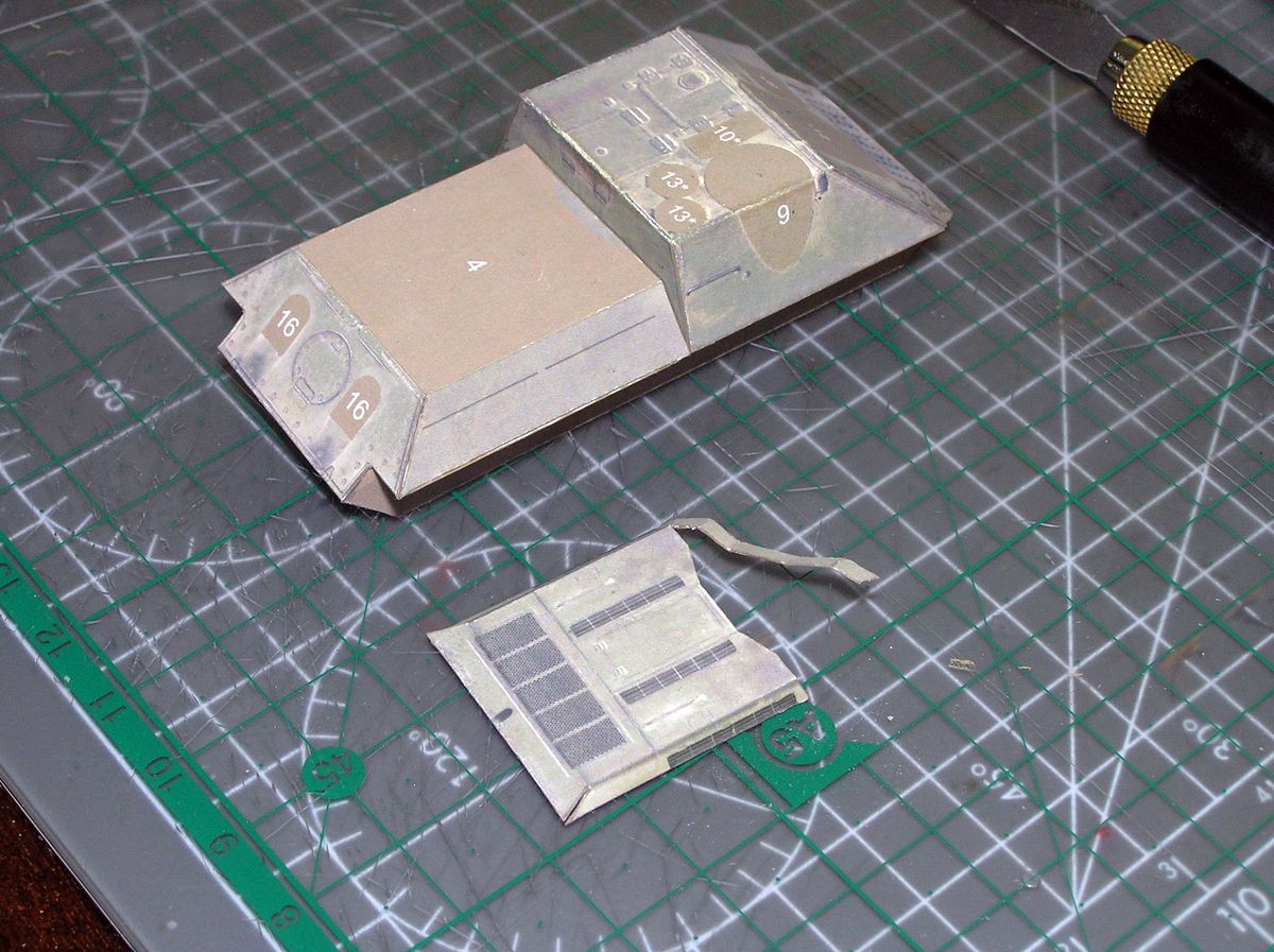 http://cdn-frm-eu.wargaming.net/wot/ru/uploads/monthly_05_2017/post-4861458-0-57672300-1494264298.jpg Всем привет! Targo_Kainрасскажет нам о сборке модели легендарной ПТ-САУ СУ-100 (текст и фото - автора). Рекомендуем перед началом сборки ознакомиться с статьей о инструментах и материалах для бумажного моделизма. Если вы читаете этот гайд, внимательно прочитайте его до конца, чтобы увидеть общую картину, отдельные нюансы и только тогда приступайте к поэтапной сборке. 1 http://cdn-frm-eu.wargaming.net/wot/ru/uploads/monthly_05_2017/post-4861458-0-82876900-1493976579_thumb.jpg Начнём с корпуса. В этой модели у нас ранее не применявшаяся технология – корпус состоит из верхней и нижней "половинок-кессонов", которые нужно потом склеить друг с дружкой. На фото подготовленная ванна корпуса – деталь 5, а также шаблоны-шпангоуты силового каркаса – детали 6. Детали-шпангоуты у меня с отрезанными клапанами и подклеенные на картон. Делайте так, как вам кажется удобным – с клапанами, или с подклейкой. 2 http://cdn-frm-eu.wargaming.net/wot/ru/uploads/monthly_05_2017/post-4861458-0-90253900-1493976935_thumb.jpg Ванна корпус 5 с вклеенными шаблонами-шпангоутами 6. На фото также некоторое количество уже склеенных брёвен. 3 http://cdn-frm-eu.wargaming.net/wot/ru/uploads/monthly_05_2017/post-4861458-0-37946200-1493976941_thumb.jpg Деталь 3. Тут лучше всего линии изгиба проводить с обратной стороны печати, а затем подточить наждачной бумагой изнутри же её края – тогда клапан будет давать минимальный радиус в месте изгиба. Такой приём мы применяли в частности для масок орудий японского танка О-И. На фото боковой клапан приклейки к корпусу максимально откинут наружу – в такой позиции и производится подтачивание наждачной бумагой внутренних краёв линии изгиба. 4 http://cdn-frm-eu.wargaming.net/wot/ru/uploads/monthly_05_2017/post-4861458-0-40869600-1493976947_thumb.jpg Вид на деталь 3 с другого ракурса – попытка показать, как чётко и ровно сгибается клапан, у которого линия изгиба подточена по краям изнутри. 5 http://cdn-frm-eu.wargaming.net/wot/ru/uploads/monthly_05_2017/post-4861458-0-37650300-1493976954_thumb.jpg Ванна корпуса 5 (она у нас является нижней половинкой всего корпуса ПТ) и склеенные детали рубки и МТО – 2 и 3. Клапаны рубки и МТО тоже лучше подточить изнутри – ради более чётких линий при сборке. Также видна деталь 1 – это промежуточное звено между верхней и нижней половинками корпуса ПТ. Рубка и МТО должны быть приклеены к детали 1, после чего с другой стороны будет приклеена ванна корпуса. 6 http://cdn-frm-eu.wargaming.net/wot/ru/uploads/monthly_05_2017/post-4861458-0-25477500-1493976960_thumb.jpg Рубка ПТ приклеена к детали 1, сама деталь 1 к ванне корпуса не приклеена, просто приложена для примерки. Учтите, что такая технология сборки корпуса требует очень точного проведения линий изгиба. Поэтому примеряйте и проверяйте, что получилось после каждой операции, чтобы была возможность исправить косяк. 7 http://cdn-frm-eu.wargaming.net/wot/ru/uploads/monthly_05_2017/post-4861458-0-89294300-1493976969_thumb.jpg На деталь 1 наклеена деталь 3 – МТО и сама ванна корпуса склеена с деталью 1, а также с ВЛД рубки и задней стенкой МТО. Перед склейкой обязательно примерьте, как всё садится на свои места. 8 http://cdn-frm-eu.wargaming.net/wot/ru/uploads/monthly_05_2017/post-4861458-0-83466900-1493976985_thumb.jpg Вид спереди на собранный корпус ПТ. 9 http://cdn-frm-eu.wargaming.net/wot/ru/uploads/monthly_05_2017/post-4861458-0-69346200-1493976992_thumb.jpg Работаем с деталью 4 – крышка МТО. Клапаны приклейки к детали 3 тоже были продавлены с обратной стороны от печати, и подточены края линий изгиба. Это даст нам точную посадку детали 4 на деталь 3, почти без зазоров между ними. 10 http://cdn-frm-eu.wargaming.net/wot/ru/uploads/monthly_05_2017/post-4861458-0-16363300-1493977005_thumb.jpg Деталь 4 рядом с