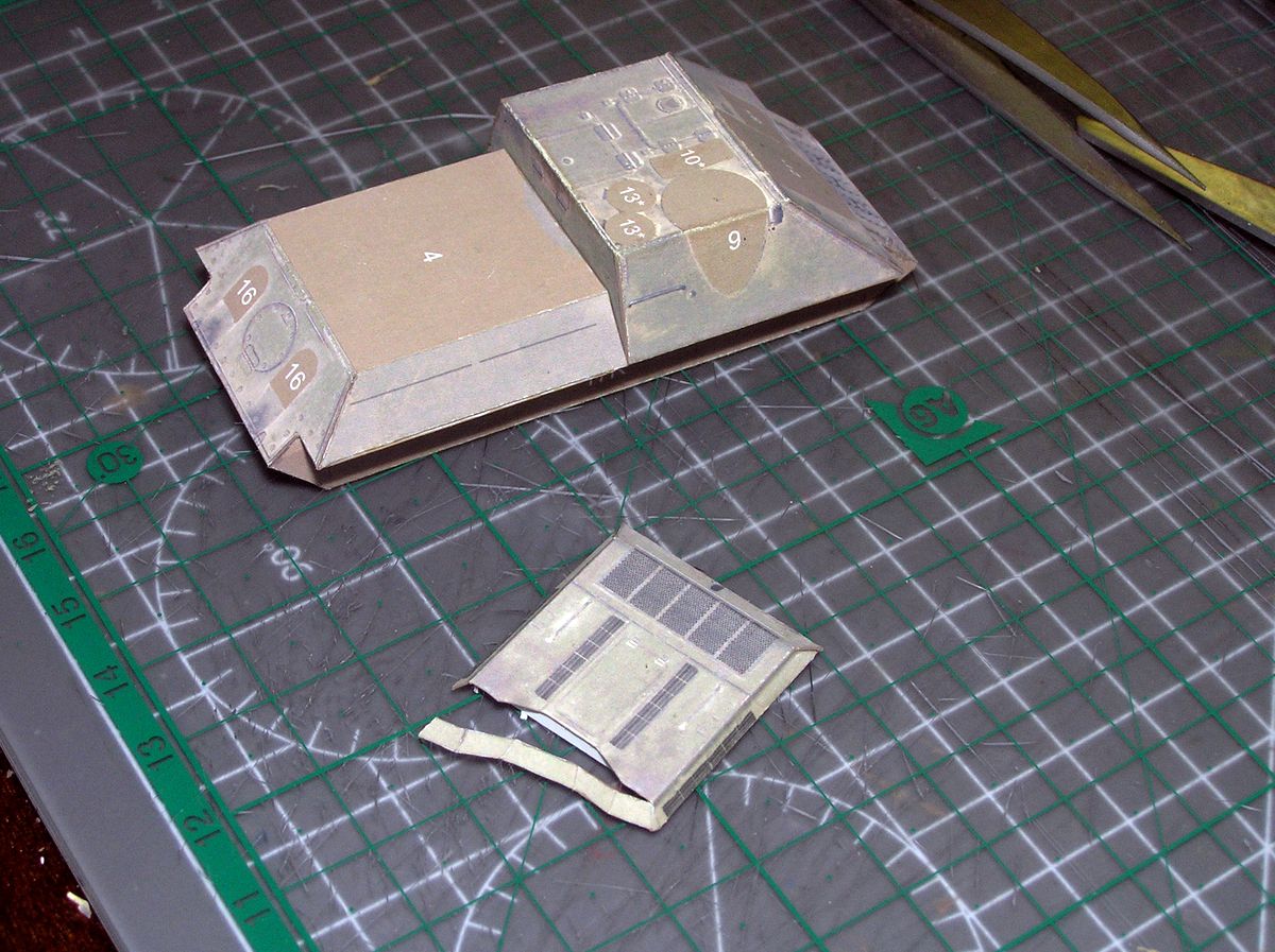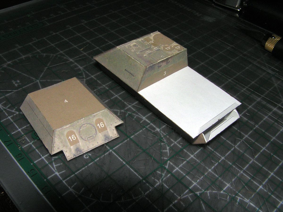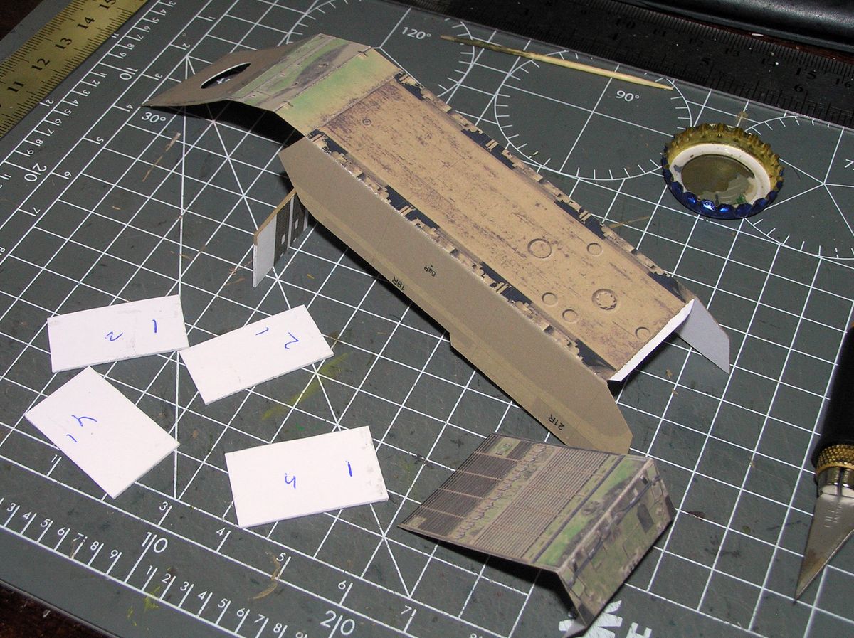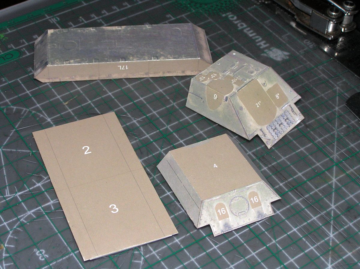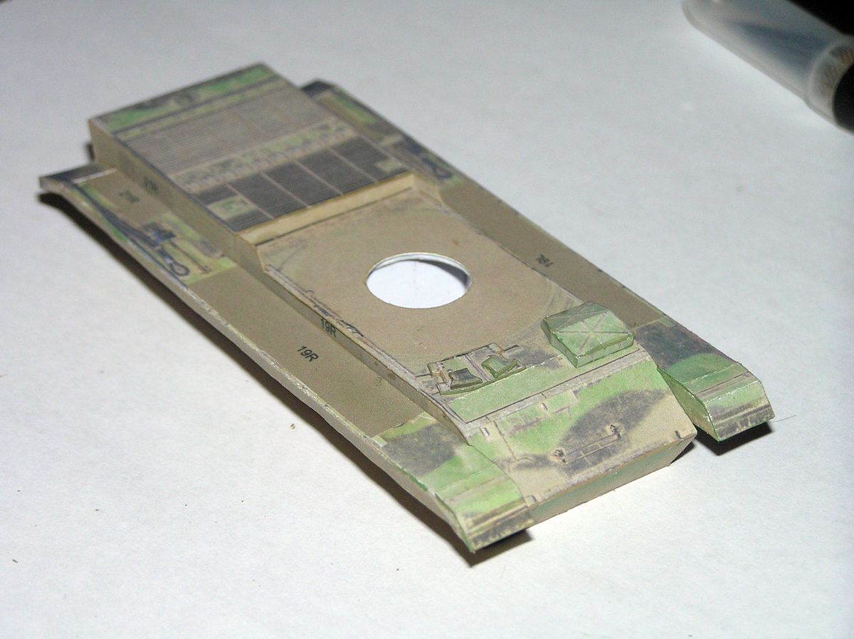 http://cdn-frm-eu.wargaming.net/wot/ru/uploads/monthly_08_2016/post-4861458-0-23046000-1471249647.jpg Очередной рассказ от нашего "бумажного гуру", Targo_Kain, о сборке модели танка из брошюры T26E4 Super Pershing. Бронекоробочка (стиль изложения автора сохранен). Рекомендуем перед началом сборки ознакомиться с статьей о инструментах и материалах для бумажного моделизма. Предыдущие статьи автора: "M103", "Type 5 Heavy", "AMX 50 B", "Японский Тигр", танка Т-54, ИС-2 и ПТ-САУ: Charioteer, А теперь приступим к сборке! 1 http://cdn-frm-eu.wargaming.net/wot/ru/uploads/monthly_08_2016/post-4861458-0-60596300-1471249694_thumb.jpg Начнём, как обычно, с корпуса. Планирую вставлять дополнительные шпангоуты. На фото пока только штатные, из брошюры. 2 http://cdn-frm-eu.wargaming.net/wot/ru/uploads/monthly_08_2016/post-4861458-0-67135600-1471249695_thumb.jpg А здесь уже пара дополнительных шпангоутов, причём один из них впритык к штатному, деталь 49. Это для того, что бы отрезать от крыши корпуса клапан и посадить его на место более красиво. Да – сборка будет более сложного варианта, что корпуса, что башни. Но на самом деле всей сложности – буквально несколько дополнительных деталей. 3 http://cdn-frm-eu.wargaming.net/wot/ru/uploads/monthly_08_2016/post-4861458-0-60139900-1471249696_thumb.jpg На фото две детали 53 – крышка МТО. В одной сделаны разрезы как по инструкции, в другой – нет, но согнуты по линиям разрезов. Углы изгиба совсем небольшие – поэтому я выбрал вариант с сгибанием – так проще и даже аккуратнее. 4 http://cdn-frm-eu.wargaming.net/wot/ru/uploads/monthly_08_2016/post-4861458-0-57222700-1471249697_thumb.jpg Здесь сборка в единый блок деталей 52 и 53. Склейка встык – деталь 52 у нас по инструкции клеить на картон. 5 http://cdn-frm-eu.wargaming.net/wot/ru/uploads/monthly_08_2016/post-4861458-0-54938500-1471249698_thumb.jpg Примерка сборки деталей 52+53 к корпусу. 6 http://cdn-frm-eu.wargaming.net/wot/ru/uploads/monthly_08_2016/post-4861458-0-69706300-1471249699_thumb.jpg Подготовка блока деталей 54. Такие детали есть только в "сложном" варианте корпуса. На самом деле ничего сложного в этих деталях нет. 7 http://cdn-frm-eu.wargaming.net/wot/ru/uploads/monthly_08_2016/post-4861458-0-68291500-1471249700_thumb.jpg Надкрыльевые ящики ЗиП. В дальнейшем – при монтаже крыльев можно поступить следующим образом – приклеить ящики к крыльям и после этого приклеить всё в сборе к корпусу – так будет значительно удобней. 8 http://cdn-frm-eu.wargaming.net/wot/ru/uploads/monthly_08_2016/post-4861458-0-55160400-1471249701_thumb.jpg Вид на корму сложного варианта корпуса с уже смонтированными фрикционами – детали 54. 9 http://cdn-frm-eu.wargaming.net/wot/ru/uploads/monthly_08_2016/post-4861458-0-68019300-1471249702_thumb.jpg Начнём башню. Все нужные детали для сборки короба башни вырезаны, торцы подкрашены. 10 http://cdn-frm-eu.wargaming.net/wot/ru/uploads/monthly_08_2016/post-4861458-0-72686300-1471249703_thumb.jpg Собираем башню. После некоторого количества размышлений, я решил, что собирать лучше всего в следующем порядке – приклеим деталь 64 задней частью к детали 62 сначала с одной стороны, потом с другой. 11 http://cdn-frm-eu.wargaming.net/wot/ru/uploads/monthly_08_2016/post-4861458-0-61229800-1471249704_thumb.jpg После чего вставим изнутри деталь 63. Если будет идти слишком внатяг – подточите края 63 мелкой наждачной бумагой. Но у меня легло без подточки. На фото также забашенный ящик ЗиП в простом варианте – 45, и задняя нижняя часть башни – деталь 21. 12 http://cdn-frm-eu.wargaming.net/wot/ru/uploads/monthly_08_2016/post-4861458-0-63730600-1471249705_thumb.jpg Вид изнутри в башню, видно подклейку детали 63. 13 http://cdn-frm-eu.wargaming.net/wot/ru/uploads/monthly_08_2016/post-4861458-0-72951200-1471249706_thumb.jpg Теперь вставим круглую деталь 22. Это примерка, деталь ещё не подклеена. Видим, что всё отлично садится куда надо. 14 http://cdn-frm-eu.wargaming.net/wot/ru/uploads/monthly_08_2016/post-4861458-0-68281900-1471249707_thumb.jpg На фото видно почти готовую башню, с уже вклеенным полом 22, ещё один ящик ЗиП к башне – развёрнутый, 