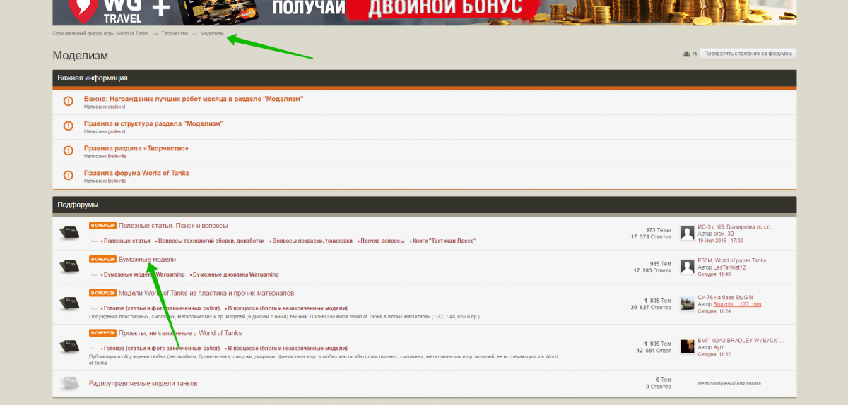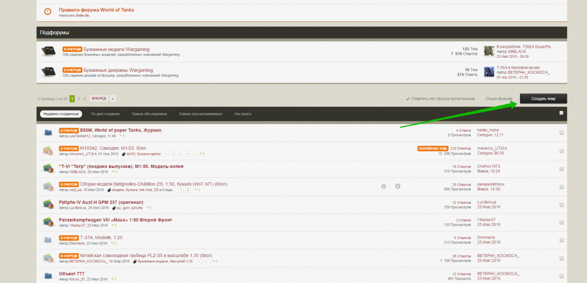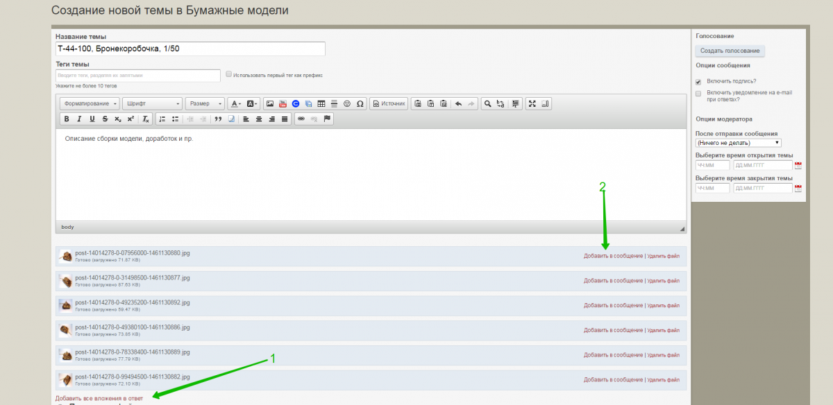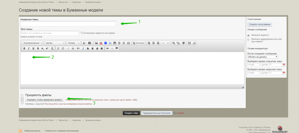 Всем привет, в этот раз мы решили помочь новичкам форума и по шагам рассказать, как разместить свою работу (модель) на форуме, на примере бумажной модели танка Т-44-100 из серии "Бронекоробочка". http://cdn-frm-eu.wargaming.net/wot/ru/uploads/monthly_07_2016/post-4861458-0-23619100-1469612124_thumb.png Заходим на форум и находим раздел "Моделизм". Официальный форум игры Мира танков → Творчество → Моделизм → Бумажные модели http://cdn-frm-eu.wargaming.net/wot/ru/uploads/monthly_07_2016/post-4861458-0-65063200-1469612127_thumb.png Нажимаем кнопку "Создать тему" http://cdn-frm-eu.wargaming.net/wot/ru/uploads/monthly_07_2016/post-4861458-0-54269500-1469612130_thumb.png Перед нами появляется форма создания темы, ключевые поля: 1) Название темы (желательно указать правильное название модели, производителя, масштаб 2)Краткое описание модели и процесса постройки 3) Важная кнопка для прикрепления фото. Рекомендуется прикреплять 5-6 фото размером от 1024*768 до 1600*1200. http://cdn-frm-eu.wargaming.net/wot/ru/uploads/monthly_07_2016/post-4861458-0-55340700-1469612133_thumb.png После загрузки файлов есть 2 способа вставить их в сообщение: 1) Установить курсор в то место описания модели, куда вы их хотите вставить и нажать "Добавить все вложения в ответ" (вставятся все фото сразу) 2) Вставить фото по одному "Добавить в сообщение" , можно в разные места сообщения, как вам удобно. http://cdn-frm-eu.wargaming.net/wot/ru/uploads/monthly_07_2016/post-4861458-0-79897200-1469612136_thumb.png 1) После этих шагов можно увидеть как будет выглядеть ваша тему на форуме 2)Если все готово, жмем кнопку "создать тему" и любуемся полученным результатом. Аналогично публикуются работы из пластика и других материалов, но в соответствующих подразделах: Моделизм → Модели World of Tanks из пластика и прочих материалов → Готовое (статьи и фото законченных работ) Моделизм → Проекты, не связанные с World of Tanks → Готовое (статьи и фото законченных работ) P.S. Если вы хотите отредактировать свою тему (изменить текст, заменить фото и пр.), то в первом сообщении необходимо нажать кнопку "изменить", потом "полная форма отправки" и внести все нужные правки.