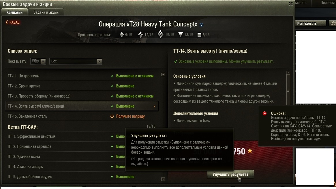 Только что выполнил ТТ15 на концепта (без отличия). Хотел повыполнять с отличием предыдущие лбз этой ветки (ТТ). Столкнулся с тем, что при попытке выбора предыдущей задачи - она не выбирается и мне вываливается угрожающий транспарант "ошибка: необходимо получить награду". Награду за выполнение ТТ15 ещё не получил. Вопрос: это баг или фича? Можно ли улучшить выполнение других задач, не получая награду за ТТ15? P.S. Ответ на вопрос, почему не получил награду за ТТ15: P.P.S. http://cdn-frm-eu.wargaming.net/wot/ru/uploads/monthly_01_2017/post-11167124-0-30538900-1484919173_thumb.jpg
