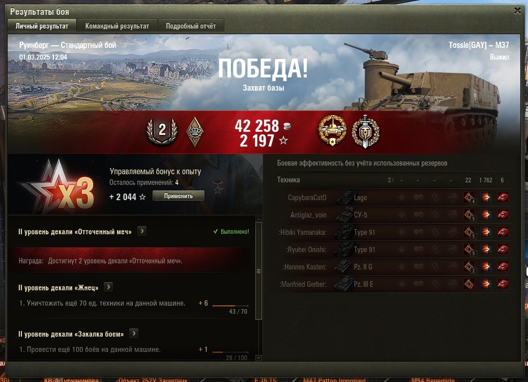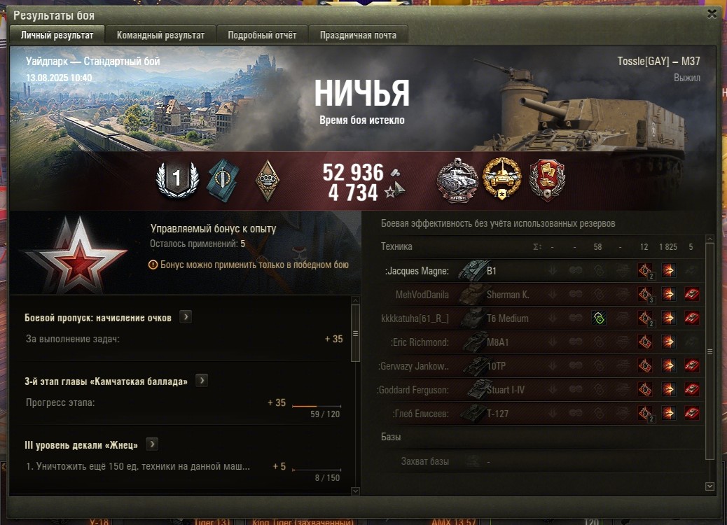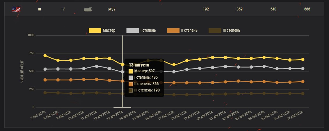 Первый раз пишу на форуме с момента регистрации в 2011 году. Пару лет назад загорелся идей взять мастера на всех танках в стате. Спустя два года взял почти все, кроме... М37. Не скажу, что остальные мастера на лоулевел артах были легкими, но М37 каждый раз убивает все желание закончить этот путь. Ниже на скринах примеры боев, а также планка на мастера для отдельно взятого боя от 13 августа 2025 года. Считаю, что уже давно сделал все возможное, чтобы получить заветный знак классности, а взять его будто бы нереально. Пожалуйста, сделайте что-нибудь с лоулевелом, особенно с артами, так как помимо того, что играть там невыносимо, так еще и планки на мастера просто космические. Пожелайте удачи, я смогу! P.S. Да, бои с ботами, но поверьте, это единственный шанс взять мастера на лоулевеле, особенно на арте. P.P.S. При ничьей мне начислили опыта за достойное сопротивление, т.е. как за победу...