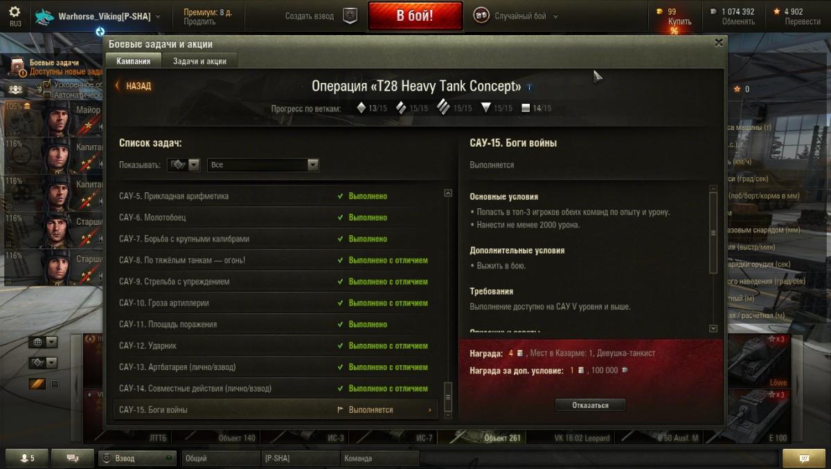 Здравствуйте ! Помогите, пожалуйста, разобраться. Выполнил лбз, но оно не засчитано, даже награду не показывает, просто активна кнопка "отказаться". Выполнял лбз на т28 концепт САУ-15. Условия следующие: 1) попасть в топ-3 игроков обеих команд по урону и опыту, 2) нанести не менее 2000 урона, дополнительное условие: выжить в бою. Скрины прилагаю