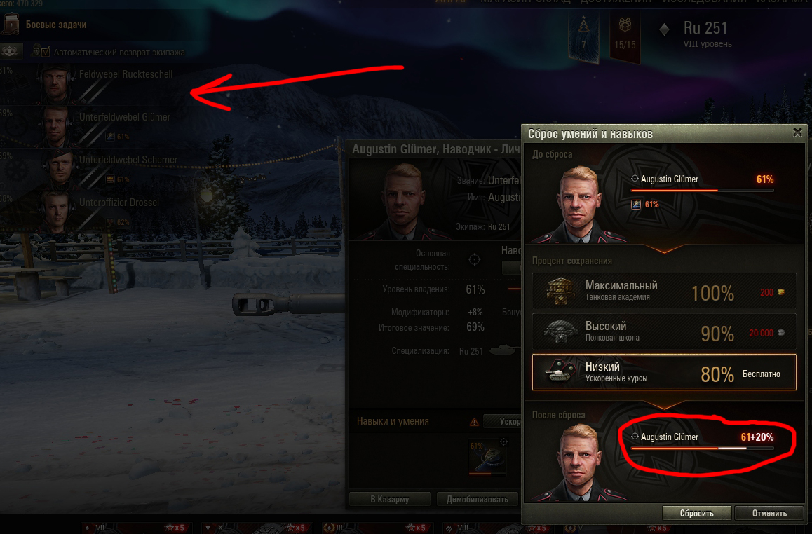 Добрый день! С новым годом! на портале не нашел информации о "льготных" сбросах умений и навыков, если такие вообще были в праздники, поэтому: 1. Поясните пожалуйста, что за +20% на фото... при сбросе у командира умение исчезло, ибо основная специальность ниже 100%. 2. Я правильно понимаю, что когда основная специальность станет 100% умение вернется к своим % ? спасибо!