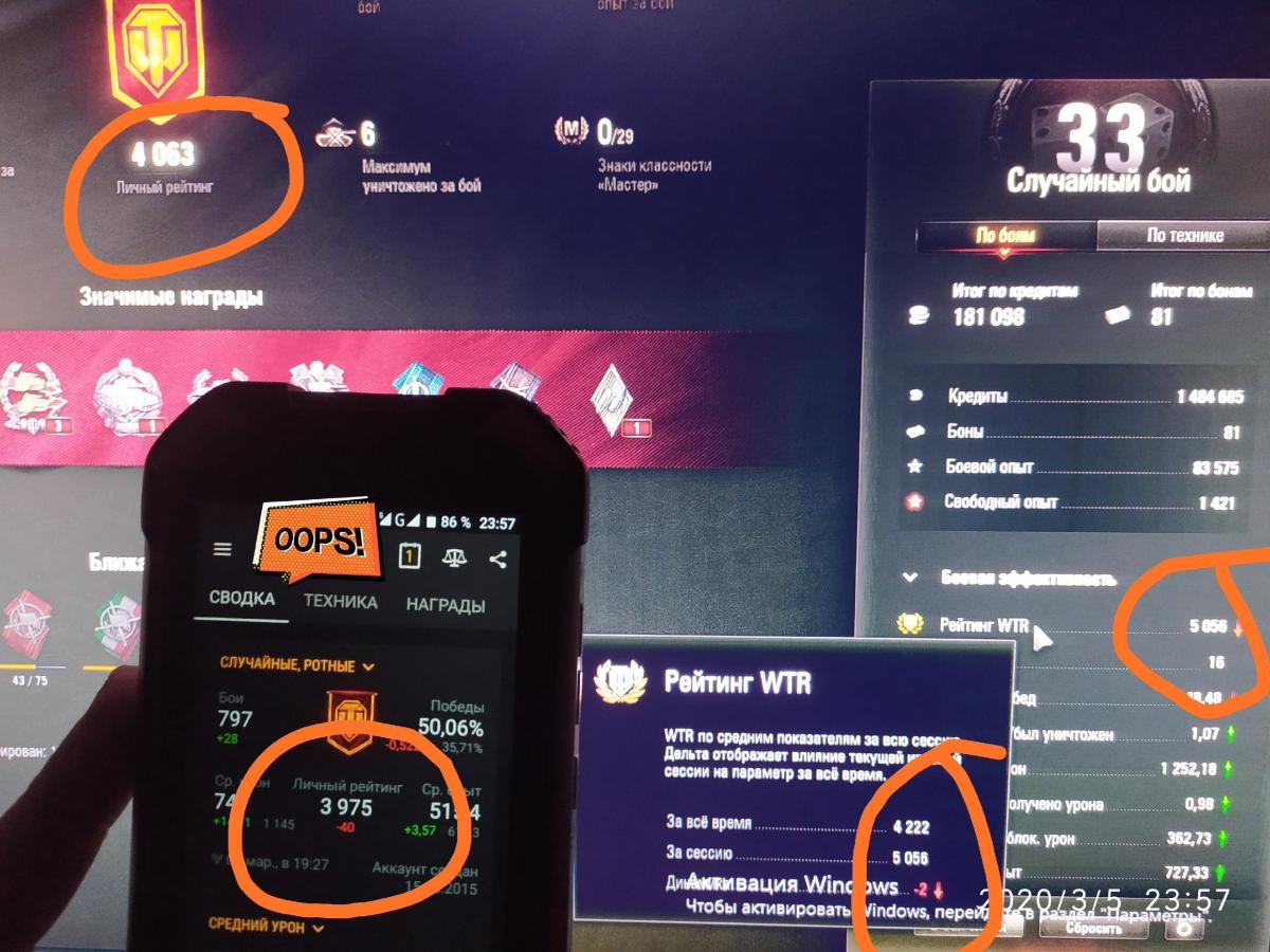 Здравствуйте. Столкнулся с проблемой. Я не знаю какой у меня рейтинг. На фото Видно что во вкладке "Достижения" в клиенте показывает 4063 рейтинга, в программе "Wot Assistant" показывает 3975, а во вкладке сессионной статистики 4222. Скажите мне пожалуйста, какой у меня рейтинг за все время? Второй вопрос. Почему на вкладке сессионной статистики Динамика -2, если рейтинг за все время 4222, а за сегодня я играл с рейтингом 5056? Заранее спасибо.