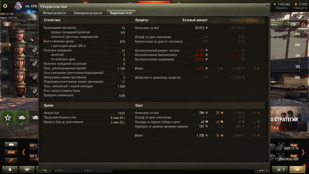 Всем доброго дня. В общем ситуация следующая. Вышел в бой на ИСУ-152, сделал 7 фрагов, 4.200 нанесенного урона, 3 использованных куммулятива, а по итогам боя ушел в чистый минус на 79.000. Смотрю в результатах - а у меня за пополнение снаряжения сняло ровно 75.000 кредитов. Это при том, что из снаряжения в бою у меня было малая аптечка, ремкомлект и обычный огнетушитель, и ни один из них я не использовал. К сожалению, скрин этого неподобства не успел сделать, так как пошел смотреть повтор боя, клиент закрылся, и результат боя пропал. Но остались вот такие скрины и собственно повтор боя. Помогите разобраться что чудеса (повторяюсь, точно помню, что за снаряжение сняло ровно 75.000) http://cdn-frm-eu.wargaming.net/wot/ru/uploads/monthly_05_2018/post-7284983-0-84796300-1526719135_thumb.jpghttp://cdn-frm-eu.wargaming.net/wot/ru/uploads/monthly_05_2018/post-7284983-0-90880500-1526719156_thumb.jpghttp://cdn-frm-eu.wargaming.net/4.5/style_extra/mime_types/win_player.gif replay_last_battle.wotreplay 1,16МБ