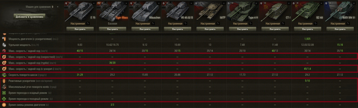 Сделать так, чтобы не показывались те пункты (строчки), которых нет ни у одного танка в сравнении. Зачем мне при сравнении этих танков смотреть на кучу прочерков, которые просто занимают место? У скольких танков у нас в игре есть турборежим, как часто эта строчка не будет заполнена прочерками? А время перехода в/из осадного? А дальность огнеметания? А время залпа? А время остывания?