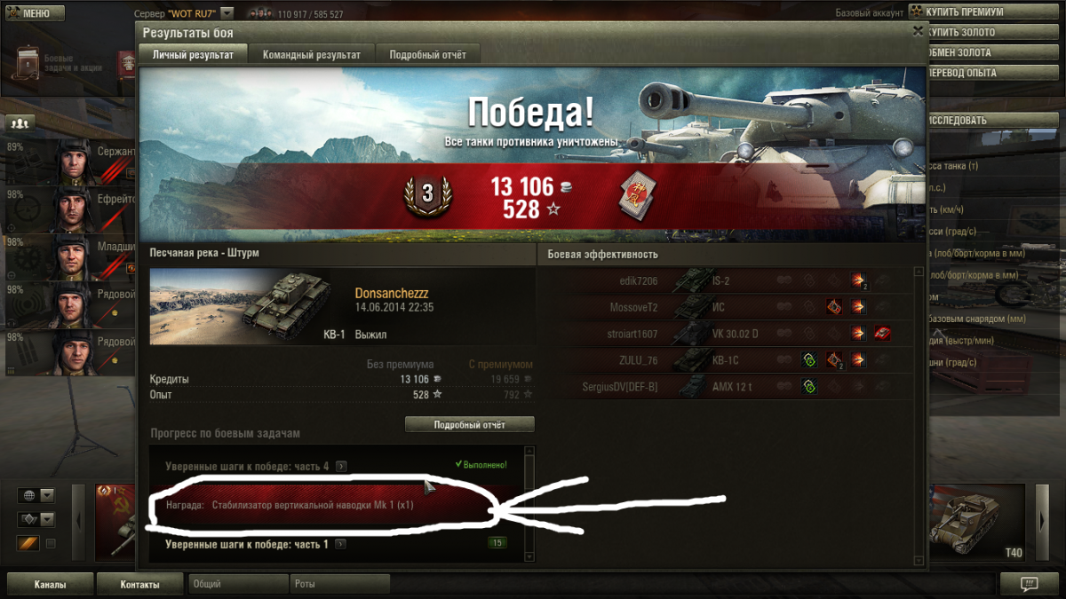 подскажите кто знает: Я закончил миссию Уверенные шаги к победе часть 4 и за это пологается награда "стабилизатор вертикальной наводки"... в отчете прописано, что я его получил, но я нигде не могу его найти... В оборудовании нету. В чем может быть дело?