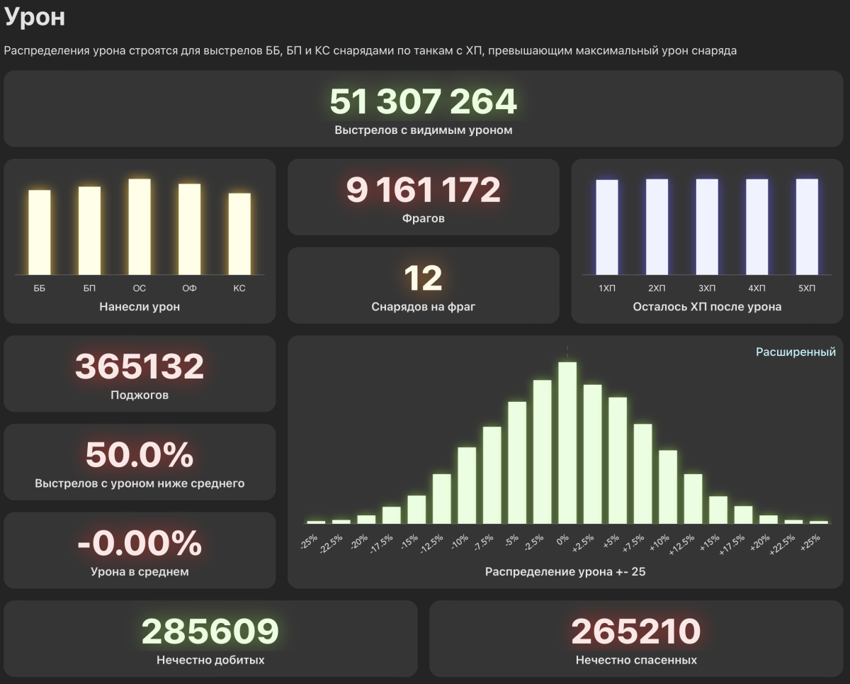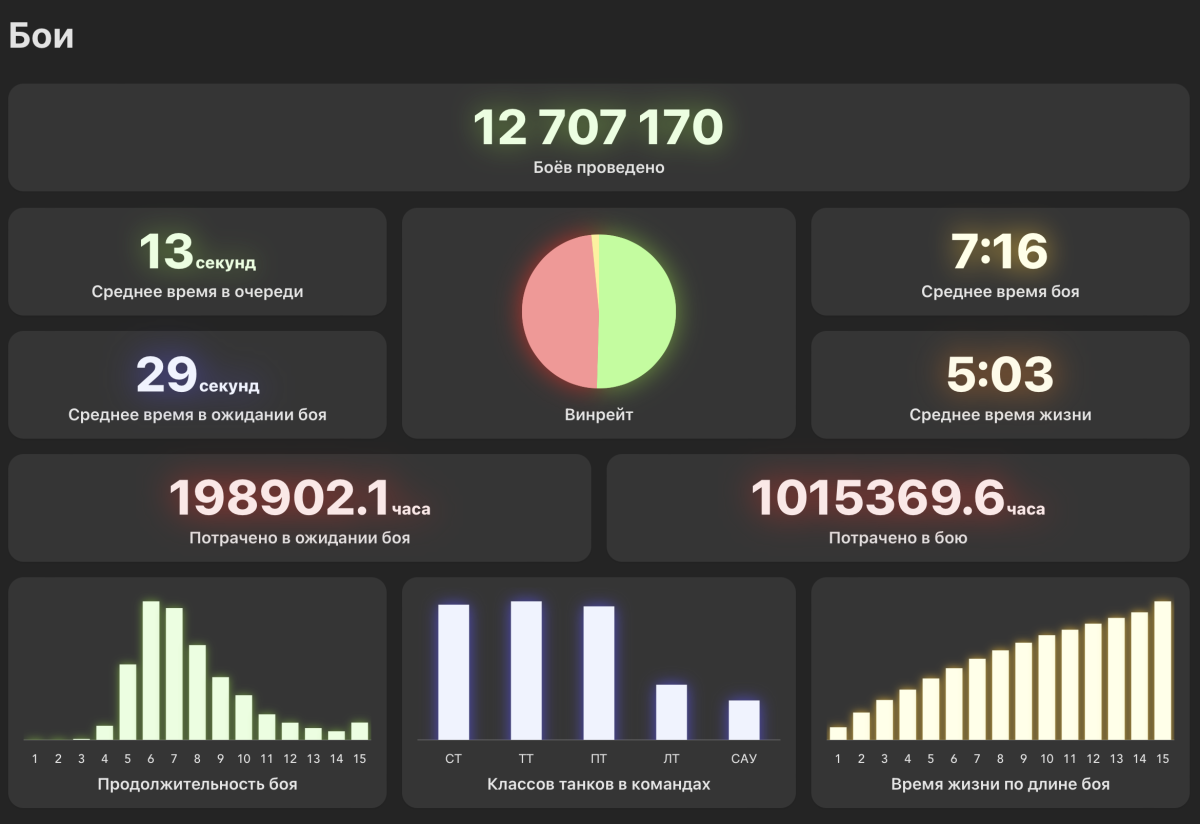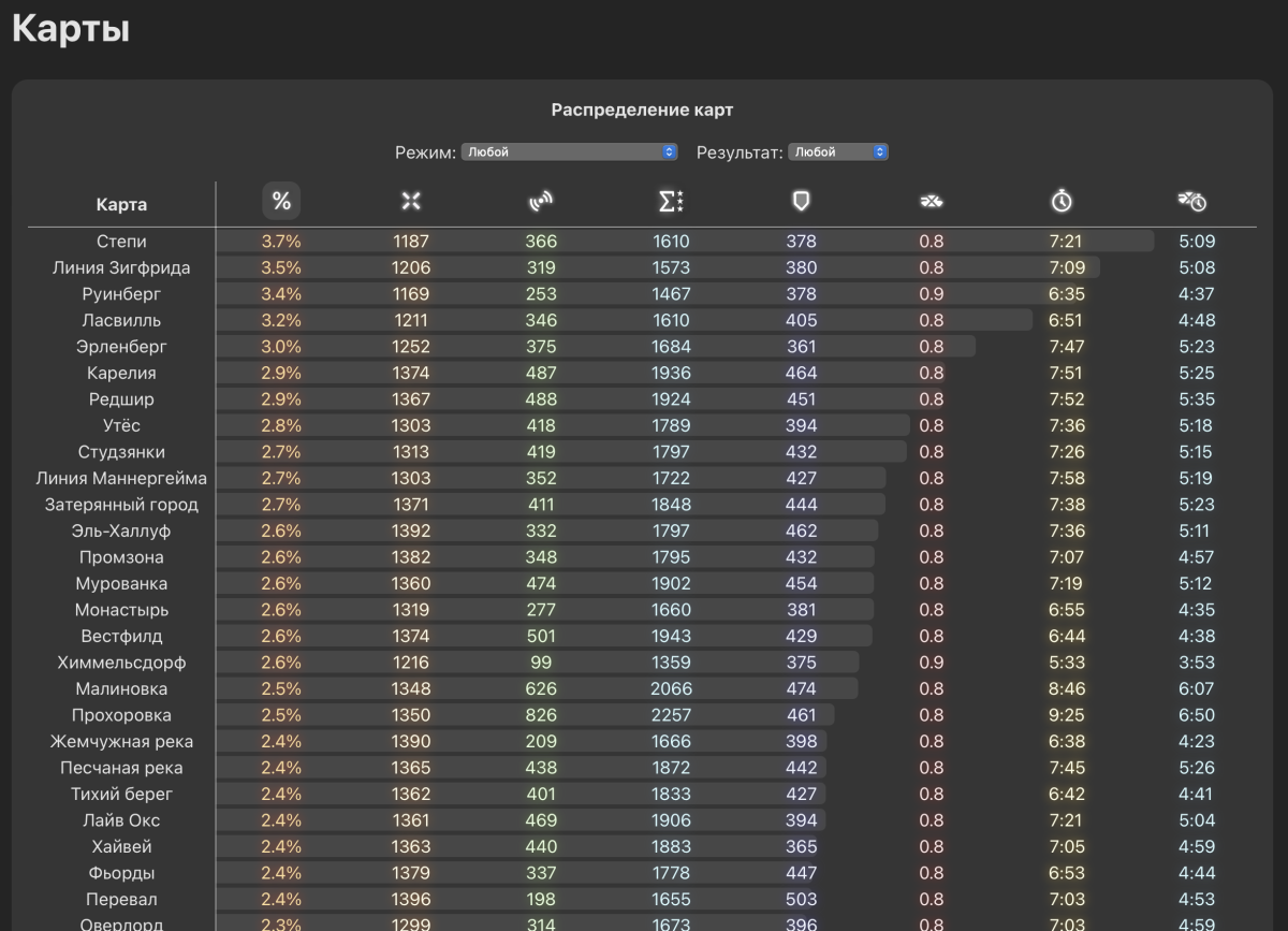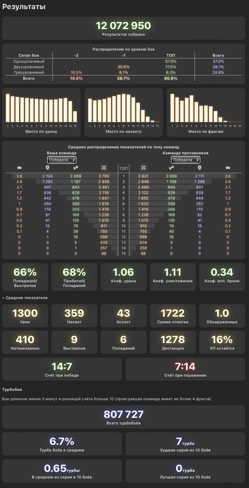 Серверная и персональная аналитикаВсем привет! Посмотрел тут на форуме, есть интерес к сервису, решил создать отдельную тему. Сайт мода https://ru.wotstat.info/ Собственное мод для игры который собирает различные данные, вебсайт который отображает инфографику, и база данных к которой открыт доступ на чтение. Вы можете просматривать общую инфографику не устанавливая мод. УстановкаДля установки мода необходимо просто перетащить его в папку с актуальной версией игры. В качестве подтверждения корректности установки, после входа в игру, в ангаре будет уведомление со ссылкой на аналитику за сессию. ВозможностиМод собирает информацию о Входе в бой Каждом выстреле и его результате (попадание и урон) Результате боя Влияние на игруПосле выхода 1.25 были проблемы со стрельбой в Натиске, их я своевременно исправил, и переписал кусок мода таким образом, чтоб он никак не влиял на игру. Теперь, даже если мод полностью сломается, вы этого не заметите и продолжите нормально играть. В качестве доказательства безопасности мода, весь его исходный код открыт и доступен на GitHub Обзор инфографикиИнфографику можно строить по различным фильтрам. Их можно комбинировать. Ник игрока Уровень танка Класс танка Конкретный танк Режим Временной период Для доступа нажмите на шестеренку рядом с заголовком инфографики Инфографика о боях Винрейт Время в очереди/в бою Продолжительность боя и время жизни в бою Инфографика о стрельбеКуда попадал каждый выстрел в круге сведения Сколько выстрелов попало по танкам/пробило их Сколько выстрелов было с расстояния 300+ метров/с полным сведением/неподвижно График процента снарядов попавших в определённую область сведения. Например в первую половину сведения (ту что ближе к центру) попадает 64% снарядов. Собирается по серверному и клиентскому прицелам вне зависимости от активированному в настройках игры отображению. Общий график позволяет сравнить свои показатели с показателями других игроков в этом же режиме На круге сведения можно кликнуть по каждому выстрелу и посмотреть о нём подробную информацию, и соседние выстрелы в этом же бою Инфографика о нанесённом уронеЧисло выстрелов/фрагов/поджогов Распределение оставшегося после выстрела ХП в промежутке от 1 до 5 (опровергает теорию о том, что 1ХП остаётся слишком часто) Распределение процента пробитий по типам снарядов Распределение урона +-25 Процент выстрелов с уроном ниже среднего Процент отклонение урона (сумма нанесённого урона / сумма базового урона) Инфографика о результатах бояРаспределение по типу боя и нахождение в топе Место в команде по урону/насвету/фрагам Распределение урона/насвета/фрагов/танкования по топу команд. Например топ1 по урону нанёс Х, топ1 по насвету насветил Y Средние/медианные/максимальные и квантильные показатели урона/насвета/ассиста/отметки/и многого другого. Переключаются по нажатию на стрелочку в заголовке Процент турбобоёв, где турбобой это бой длительностью менее 5 минут и проигравшая команда имеет не более 4х фрагов Инфографика по картамЧисло боёв, средний урон/насвет/сумма отметки/наткнкованный урон/фрагов/время боя/время жизни в разбивке по каждой карте. Можно посмотреть в победных и проигрышных боях. Можно отсортировать по каждому показателю кликнув на него Инфографика об охватеЧисло уникальных игроков которые были в боях. Можно см