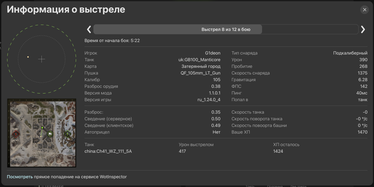 В общем такая тема. Играю не первый бой и не первый раз, знаю про разбросы, знаю про круг сведения, так что это можете не писать. Ниже по реплею играл вот на IS2 с топовой пушкой, экипаж прокачан с перком "Боевое братство" на 96%. По дефолту разброс на этой пушке идет 0.46, а сведение 3.4. Стоит оборудка: 1. Досылатель (класс 2) 2. Улучшенный прицел (класс 2) 3. Улучшенная система вентиляции +5% к умению экипажа (класс 2) В итоге характеристики пушки стали такие: 1.Разброс на 100 метров - 0.4 2.Время сведения - 3.12 Это вполне играбельно, так как на фугасниках похуже точность, но даже на фугасах летит точнее при полном сведении, и так вверх, вниз и вбок не летит, как на реплее ниже. Такое ощущение, что мне сделали открутку, и теперь снаряды от танков отмагничивает в стороны, по-другому описать не могу. На реплее уже психовал, возмущался, в середине колески крутил вперед назад (бывает в противоположную сторону срабатывает). Сводился где-то полностью, где-то чуть-чуть не до конца, но точность при таком расстоянии просто убивает... Причем это не только на ИС2, подобное у меня практически на всех танках, как играть? Я уже молчу, что я в 80% боев попадаю с противниками на 1-2 уровня выше меня, а союзники будто впервые зашли в бой..Какой тут процент побед и настрел, если такие чудеса происходят. P.S: Я девушку свою подсадил тоже на танки, так она настреливает на 5, 6 лвлах и с точностью таких чудес нет. Так же, есть у меня второй аккаунт (когда забыл пароль от основного, создал новый). Так на новом игралось значительно легче, после 50 боев взял рейтинг 4800, а на основе сейчас рейтинг 3166.. Основной аккаунт создан был мною в 13 году и он будто проклят. http://cdn-frm-ru.lesta.ru/4.6l/style_extra/mime_types/zip.gif 20241222_1516_china-Ch10_IS2_114_czech.zip 1,07МБ
