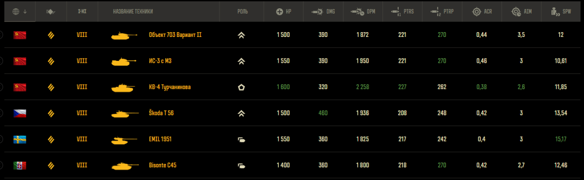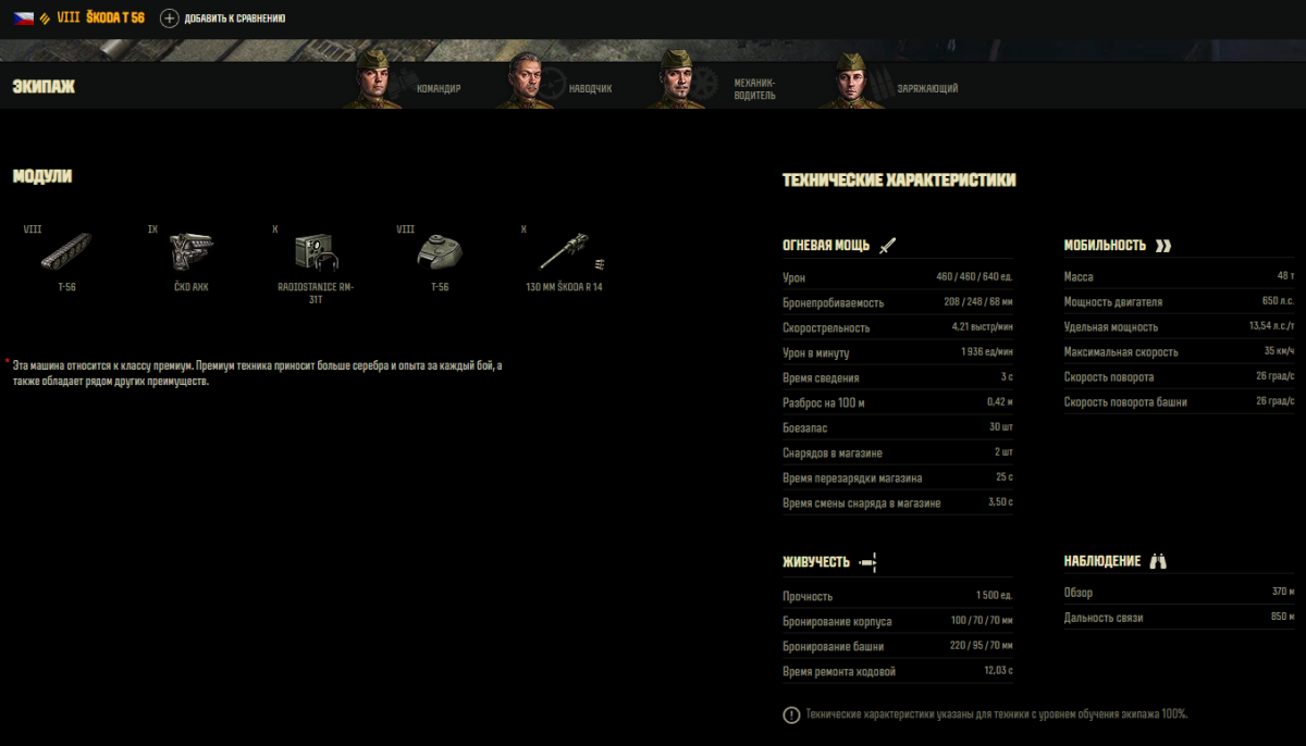 https://forum-mt-prod.lesta.ru/monthly_08_2025/post-4095553-0-87240200-1756105087.png В 1950-х годах в Чехословакии продолжались работы над оригинальными проектами боевых машин с широким использованием идей советской танковой школы и собственных наработок. Одним из таких проектов был танк Т-56, разработанный компанией Škoda. Работы были свёрнуты в связи с унификацией образцов вооружения стран-участниц Организации Варшавского договора. Не было выпущено ни одного образца. В игре танк представлен на восьмом уровне в виде тяжелого танка Чехословакии - Škoda T 56. Является премиумным танком, продаваемым изредка по акции, либо встречающийся в коробках. Игровые ТТХ https://forum-mt-prod.lesta.ru/monthly_08_2025/post-4095553-0-14775500-1756105228.pngПлюсы: Уникальный для уровня Барабан на 2 снаряда по 460 урона. Комфортная перезарядка барабана. Хорошие УВН в -8°. Неплохое бронирование башни. Неплохая подвижность для тяжелого танка. Общая универсальность танка. Премиумный снаряд ББ, а значит универсальный. Калибр 130 мм, а значит рикошеты от 40 мм брони невозможны.Минусы: Среднее количество ХП - всего 1500 в базе. Не высокий обзор 370 м Невысокое бронирование корпуса, а также уязвимая ком. башенка. Слабое пробитие, как основного (208 мм), так и премиумным снарядом(248 мм) снарядов. Общая зависимость от союзников. Танк не самодостаточный.Сравнение с одноклассниками: Среди барабанщиков наиболее близок Объект 703 Вариант II. Остальные как двуствольные, так и барабанные достаточно другие по геймплею. Порядок прокачки модулей Как премиумный танк не нуждается в прокачке. Полевая модернизация По классу относится к "Тяжелым танки прорыва". Непосредственно прокачка ПМ даёт постоянный бонус +3% к запасу прочности танка. Первые три уровня парных модернизаций идентичны все ТТ: Вездеходная ходовая (7,5% проходимости) / Облегченная ходовая (5% скорости поворота, 10% скорости ремонта) - однозначно проходимость. Отстройка параллакса (2% точности) / Притирка шестерней наведения( 5% время сведения) - точность лучше, сведения с таким КД барабана хватает. Звукоизоляция (10% времени оглушения) / Электропривод перископа (3% обзора) - однозначно обзор. Оборудование Варианты установки оборудования: Маневренный билд 1: Вентиляция, Турбина, Стабилизатор/СУО. С Турбиной скорость будет приличные 40 км/ч. Остальное на стабилизацию. Маневренный билд 2: СУО, Турбина, Стабилизатор. Тоже самое, но чуть ниже ДПМ, чуть лучше стабилизация. Билд комфорта огня: СПМ, Стабилизатор, СУО. Билд на максимальную стабилизацию для гарантированной выдачи барабана. Универсальный билд: Вентиляция, Стабилизатор, СПМ/СУО. Просто рабочая лошадка. Прочность и скорость: Закалка, Турбина, Стабилизатор. Альтернативный вариант.Нет возможности поставить досылатель, поэтому ДПМ можно разгонять только Вентиляцией. Абсолютный максимум перезарядки составляет 21.44 секунд. Расходные материалы выбирайте в зависимости от ваших целей, будь то экономия серебра или игра на урон/отметки. Но все же крайне рекомендуется использовать доппаек. В качестве дополнительного усиления можно использовать различные инструкции, например "Искусство сбивать пламя", которая дает навык пожаротушения для безопасной игры с пайком. Комбинируйте, выбирайте наиболее подходящий для вас билд. Танк достаточно пожароопасный, поэтому если нет перка пожаротушение, то лучше иметь огнетушитель, ну или периодически гореть. Навыки экипажа Эки