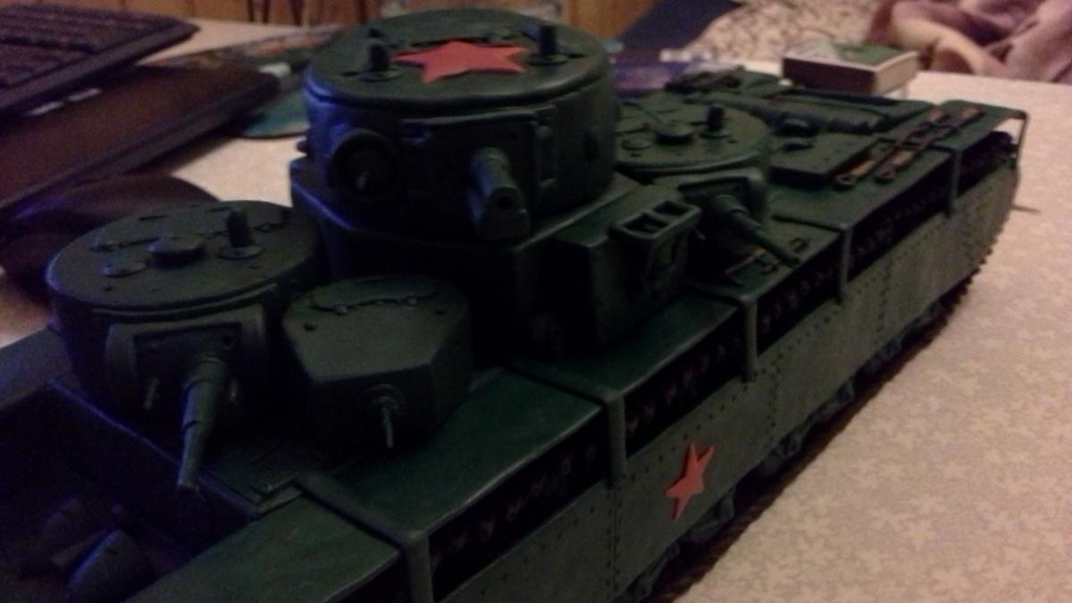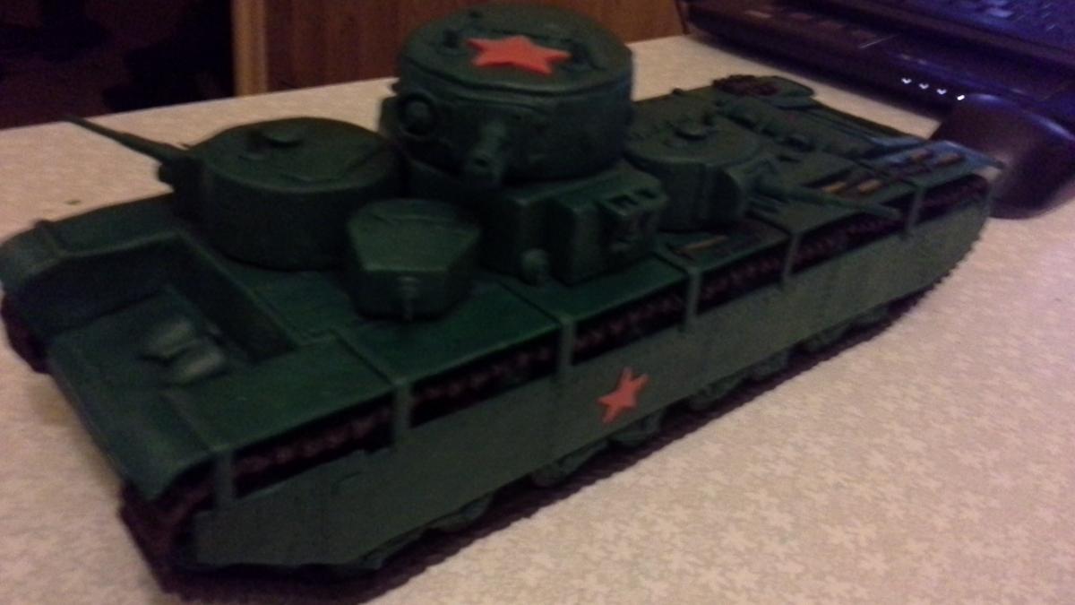 Вашему вниманию представляется модель пятибашенного танка т-35 в масштабе 1:35,выполненном из пластилина.В данном танке из материалов также используются спички(в элементах ходовой),пенопласт(внутри корпуса и подбашенной коробки),зубочистки(орудия танка).Создание модельки заняло около 70 часов чистой работы.за фото извиняюсь.Сфоткано на планшет.Грубо не судите,темы создавать не умею.