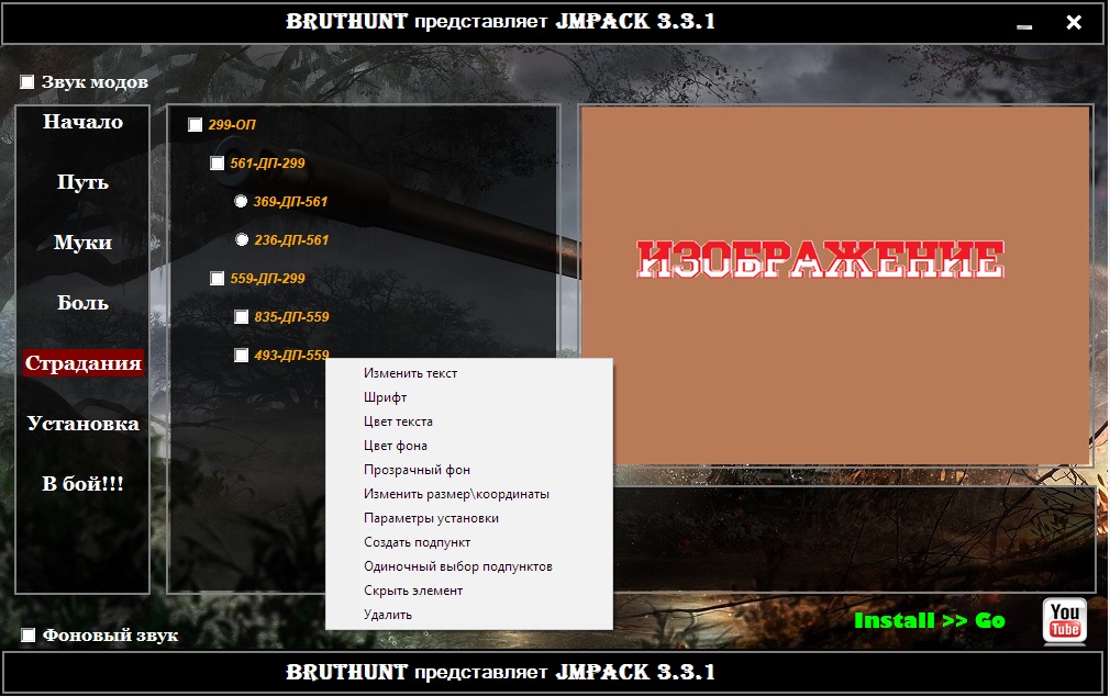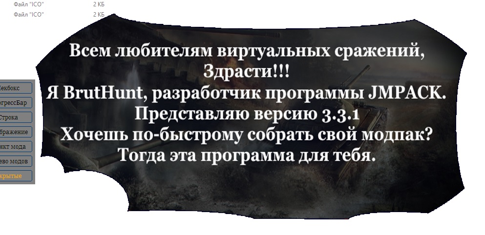 JMPACK- программа для сборки различных модификаторов в один инсталятор. Можно устанавливать зависимость между пакетами модов, настраивать внешний вид установщика и пр. Программа работает для всех версий WoT. JMPACK 3.5.1 - Яндекс, Mail.ru, GitHub JMPACK 3.x.х - видео