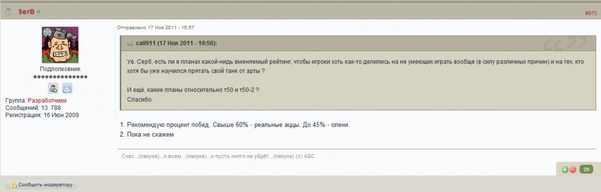 Возможно я не внимательно искал. В таком случае прошу извинить. Предлагаю для обсуждения вопрос: Как поменять режим, чтоб был менее токсичным и более привлекательным? На мой взгляд режим сам по себе достаточно интересный! (система 7х7). главной проблемой считаю целый ряд факторов: 1. "Обиженные", которым не нравятся набор техники, берут арту; берут быстрый танк, чтоб на первых 30 сек без выстрела слиться или стоят на базе без единого выстрела ... 2. "Качели" - В частности техника поддержки бывает в вопросе урона С ОТРЫВОМ на первом месте, но по опыту попадает в низ списка. Но и штурмовая техника часто оказывается со странным результатом, когда пол команды решаются на сливной "раш по центру", и по результату даже настрелом не вытянуть на адекватный результат по опыту. 3. чат - очень интересный феномен! Именно игроки с низкой эффективностью (как по бою, так и в целом) "громче" всех и часто особо "обиженные". Упарываются умирая с 1 выстрелом и начинают грязью поливать "неправильную" технику, союзников, которые не поехали рашить по центру. Ладно, феномен не новый. Но в формате 7х7 всё-таки хочется хоть как-то договариваться. "громкие" игроки вынуждают играть с выключенным чатом и выключенной голосовой связью. ну и последнее, НАВЕРНОЕ не ибегаемое ... "раш по центру" ГЛАВНЫМ предложением с моей стороны: - исключить из выбора артиллерию! Это всё-таки не рандом. - ограничить количество снайперской техники хотя-бы до 2 на команду. - ограничить количество лт - 1 на команду - это конечно субъективно, но на мой взгляд вознаграждение опытом следует бы немного доработать. Эту тему поднимали и самые известные статисты и блогеры в ранговых боях ... - я полагаю, что "качели" не избежать полностью. Но именно в связи с их наличием предлагаю пересмотреть награды за бои. Добавить хоть какой-то дополнительный "прогресс", который бы компенсировал страдания! Семиэтапный прогресс - конечно хорошая награда на финале. Но в расчёте на 1месяц "страданий" - количество плюшек маловато. Т.е. лично моё предложение ориентировано не на достижение цели. Для этого боновая награда хороша. Мое предложение ориентировано на "компенсацию" страданий. Можно - свободный опыт зарабатывать. Можно серебришка малость подбавить ... или прокачка экипажа ... что-нибудь привлекательное!!! - ну и по поводу чата: конечно, у разработчиков, вероятнее всего есть альтернативные взгляды. Но с чатом что-то нужно бы сделать. Или полностью отключить, поскольку бесполезный (ну или самому приходится выключать полностью). Или выписывать "обиженным" перерыв в режиме на 30 минут ... или некие другие административные инструменты.