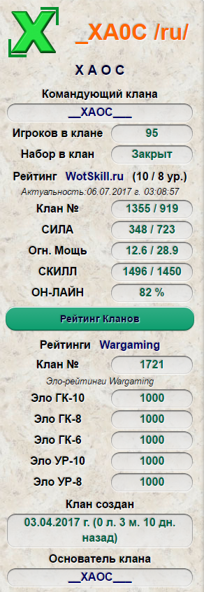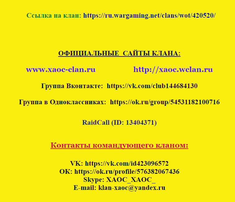 http://cdn-frm-eu.wargaming.net/wot/ru/uploads/monthly_07_2017/post-48519868-0-26852000-1499052264.png >>> Наш клан Официальные сайты нашего клана: >> и еще ТУТ >>> Средние показатели статистики по клану (14.07.2017 г.): http://cdn-frm-eu.wargaming.net/wot/ru/uploads/monthly_07_2017/post-48519868-0-50364700-1500056205.png http://cdn-frm-eu.wargaming.net/wot/ru/uploads/monthly_07_2017/post-48519868-0-84134900-1500056267.png http://cdn-frm-eu.wargaming.net/wot/ru/uploads/monthly_07_2017/post-48519868-0-88853600-1500056313.png Нашему клану требуется полевик для укрепов (без какой-либо зарплаты, чисто на энтузиазме). Многие конечно скажут, а для чего вообще человеку быть в нашем клане полевиком без зарплаты. Какие для него «плюсы»? И возможно будут правы. Но один «плюс» все же есть – это развитие своих знаний в командовании и получение опыта командования для игроков, у которых есть желание развиваться именно как полевики. Ну и атмосфера в клане вполне позитивная и дружелюбная, а это тоже не маловажно. Требования: Опыт командования в укрепах 6-го уровня (желательно и в укрепах 8-го, 10-го уровней, КБ, ГК). Минимум один танк 6-го уровня (ЛТ, СТ). Минимум один танк 8-го уровня. Минимум один танк 10-го уровня. Собирать укреп хотя бы пару дней на пару часов (желательно на буднях). Общение с соклановцами исключительно без мата, агрессии и оскорблений. Требований к стате практически нет (желательно: 10 000+ боев, процент побед 50+, WN8 1 000+). После успешной «обкатки» в укрепе 6-го с Командиром клана – должность «Командир подразделения» со следующими полномочиями: Развитие укрепа по своему усмотрению. Использование любых «плюшек» в укрепе также по своему усмотрению. Мотивированные инициативы Командиру клана насчет принятия в клан/исключения из клана игроков. «Неприкасаемость» со стороны офицерского состава клана. «Обкатка» по выходным в прайм примерно 16:00 ч. – 22:00 ч. (по Москве). Думаю, хватит сыграть всего несколько боев, чтобы Командир клана смог принять решение насчет того, подходит человек клану на должность полевика или нет. Поэтому много времени у вас это не займет. Итак, кто все же изъявит желание попробовать себя в роли будущего полевика, пишите мне в ЛС свой ник в игре (это для тех, кто на форуме сидит исключительно с твинка). Если к Вашей кандидатуре будет интерес, то обязательно отвечу в ЛС и обговорим день и время «обкатки» в укрепе. На Ваши комментарии в самой теме (если они будут касаться сути вопроса) постараюсь ответить. Комментарии не по существу темы – «Спасибо за Апп». http://cdn-frm-eu.wargaming.net/wot/ru/uploads/monthly_07_2017/post-48519868-0-53706200-1499052423.png Для тех, кто хочет вступить в ряды бойцов нашего клана, требования следующие: Требования к статистике: Процент побед от 50 WN8 от 1000 EFF от 900 Средний опыт от 450 Средний урон от 900 Дополнительные требования: Общение исключительно без мата, агрессии и оскорблений. Желание участвовать в клановой жизни. Наличие микрофона. Заявки на вступление в клан можно отправлять через >> или воспользоваться любыми другими контактами Командира клана (они указаны ниже). http://cdn-frm-eu.wargaming.net/wot/ru/uploads/monthly_07_2017/post-48519868-0-44648600-1499052458.png