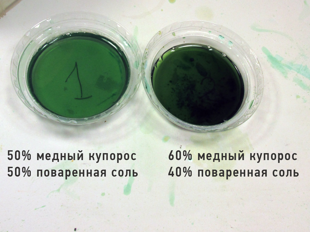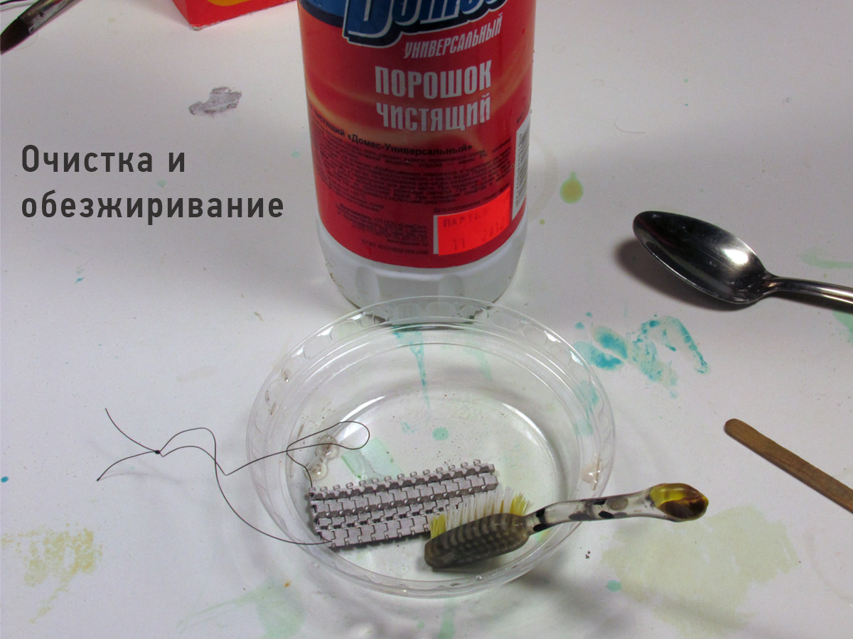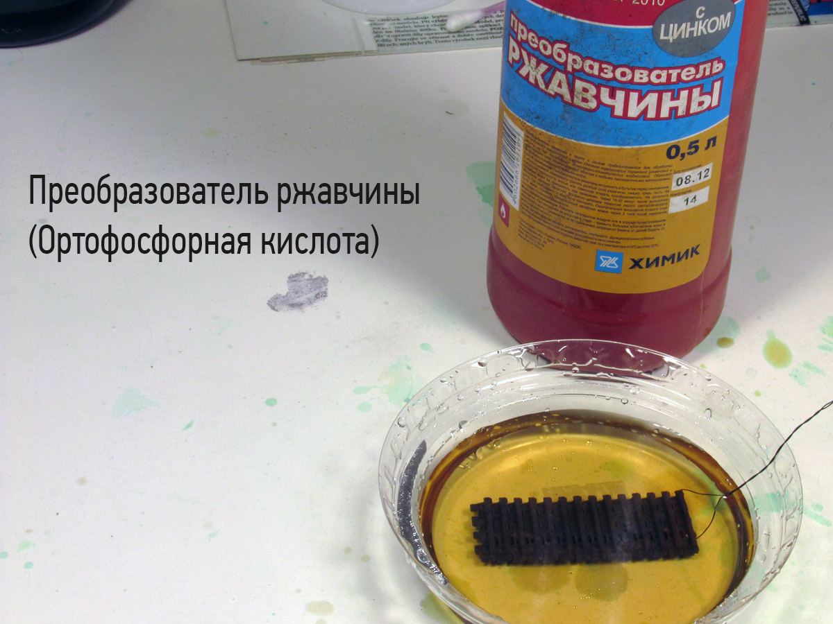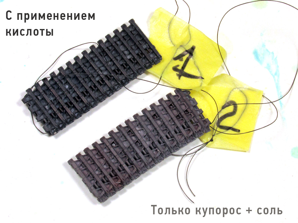 Привет всем! Небольшой отчет о моих опытах с металлическими траками и их чернением. Скажу сразу, на самом деле опытов и химических составов было намного больше. Но пишу только о том опыте, который был удачным. Рецепт почти классический, Но с небольшими нюансами. Гусеницы уже собраны в ленты (Friulmodel) 1) Начинаем с ОЧЕНЬ важного этапа. Моем и обезжириваем наши собранные траки. Лучше всего использовать порошкообразные моющие средства, типа "Пемоксоль". Тщательно очищаем траки с помощью старой зубной щетки, намочив их водой и добавив моющее средство. После чего ОБИЛЬНО промываем и не помешает дополнительно обезжирить ацетоном или спиртом. 2) Процесс приготовления раствора для чернения максимально прост. Медный купорос (продается в магазинах бытовой химии, в разделах для садоводов) и обычная поваренная соль. 3) Делаем раствор, добавляя в воду примерно равные части купороса и соли. Раствор должен быть очень насыщенным, т.е. добавляем составляющие до тех пор, пока они перестанут растворяться. Важный нюанс! От пропорций купороса и соли сильно зависит результат чернения, т.е. оттенки траков. Тут нужно пробовать и экспериментировать. Получить можно очень живописные цвета, от серо-коричневых ржавых до черно-вороненых траков. 4) Опускаем в раствор наши гусеницы и практически сразу происходит химическая реакция, траки покрываются налетом меди, потом темнеют. Проверьте отсутствие воздушных пузырьков в углублениях и труднодоступных местах, это обычно углубления между грунтозацепами. Если этого не сделать, то эти места остаются блестящими и незачерненными! Пузыри "выгоняются" оттуда жесткой кистью, не вынимая траки из раствора. После чего опускаем траки в преобразователь ржавчины (из магазина автохимии), Можно между раствором купороса и кислоты очистить дополнительно траки зубной щеткой, они немного меняют оттенок и темнеют. В кислоте я держал гусеницы 5-10 минут. Причем процесс "окунания" траков в купорос с солью и в кислоту можно повторять несколько раз, оттенки траков будут отличаться. 5) Когда гусеницы станут "живописными" и темными, их надо тщательно промыть в слабом растворе пищевой соды и ОЧЕНЬ обильно промыть под струей воды. Сушим на бумаге, получаем готовый продукт. Обратите внимание на то, что гусеницы после высыхания светлеют. На фото разные образцы, которые обработаны растворами с разным соотношением соли и купороса + к этому образец №1 дольше лежал в кислоте. P.S. Если траки получились очень светлыми, не отчаивайтесь. По ним можно сделать темную смывку (коричневый + черный) раствором из худ.масла и уайтспирита или темперы ПВА + воды (я пробовал второй вариант, как более быстрый).Дальше пыль и грязь, в зависимости от конкретной модели (пигменты и пр.) P.P.S Можно конечно купить фирменные растворы и не мучаться с этими опытами. НО во-первых себестоимость процесса копеечная. Пакет купороса (на 5-6 комплектов траков) стоит примерно 1,5-2 уе. Сколько стоит соль сами знаете. Преобразователя ржавчины за 2-3 уе. вам хватит еще на большее количество гусениц. Во-вторых, моделисты - народ пытливый по натуре, им интересен процесс и эксперименты. Надеюсь, что материал будет полезен.