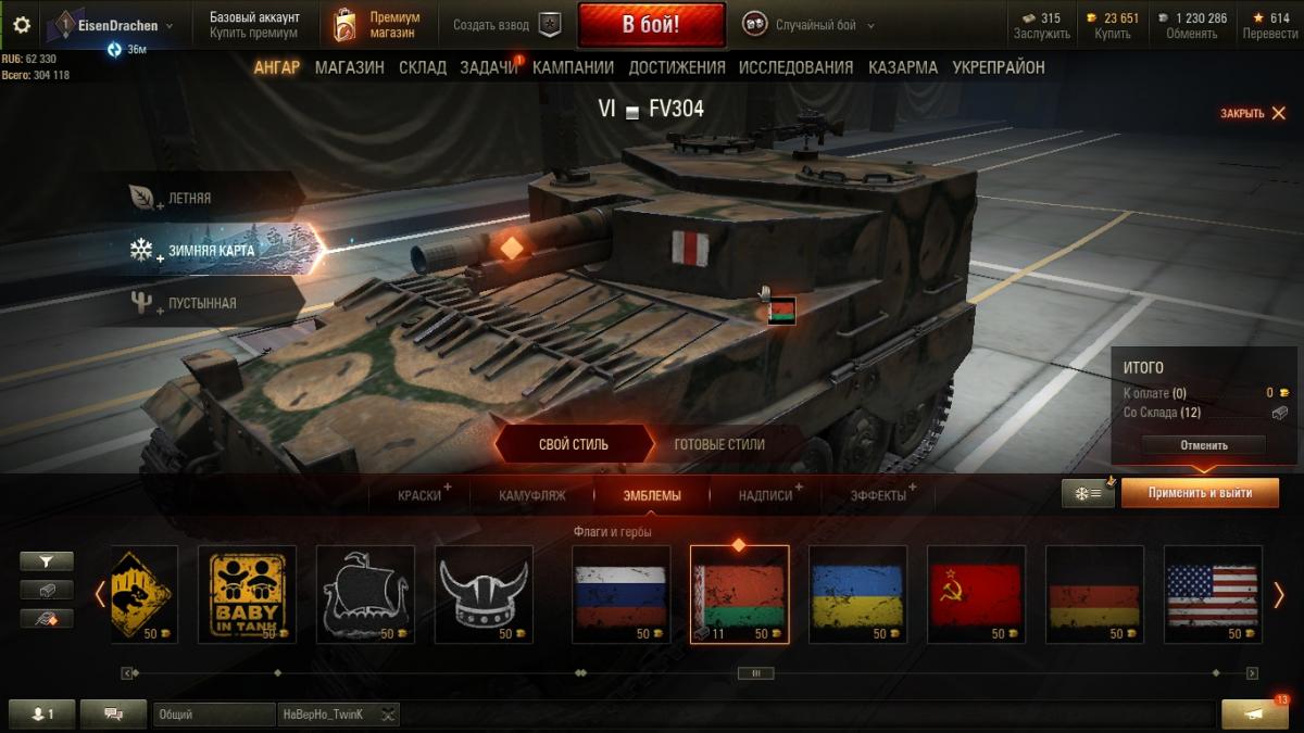 Купил британскую арту 6 уровня фв304, поставил картофельный камуфляж, попытался изменить эмблему (флаг) в кол-ве 2 штуки. На правом борту эмблему удалось сменить, а на левой части башни не удаётся: при выборе новой эмблемы старая не подсвечивается как должна. Модов нет. Что делать? P.S. я понимаю, что это не самая важная проблема в игре, но всё таки! http://cdn-frm-eu.wargaming.net/wot/ru/uploads/monthly_08_2018/post-11167124-0-94159400-1535312744_thumb.jpg P.P.S. подобные проблемы уже наблюдал с британской пт 6 уровня АТ8: там эмблему удалось сменить, но она самопроизвольно менялась на дефольтную, чаще всего после непосредственно входа в ангар либо после боя, либо после ввода логина/пароля, и если тыкнуть "в бой" , то катаешься без эмблемы, но я нашёл выход: если зайти в изменение внешнего вида и выйти, то эмблема опять появляется. Но здесь другое: вообще сменить эмблему не получается.