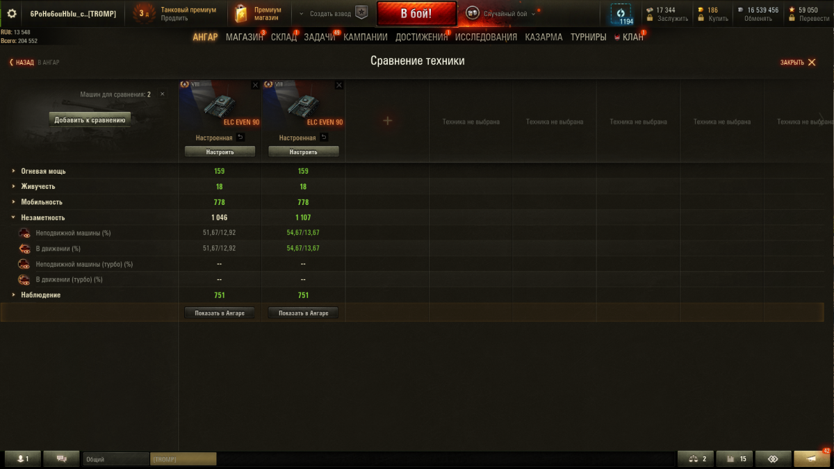 Здравствуйте! Приобрёл *Трофейную систему выхлопа* для ELC EVEN 90. Перед приобретением зашёл в раздел сравнения конфигураций. Изначально с установленной *Малошумной системой выхлопа* показатели маскировки были: 51,67/12,92(%). В таблице сравнения после установки *Трофейной системы выхлопа* были указаны показатели: 54,67/13,67(%), но в ТТХ указанных в ангаре, после реальной установки *Трофейной системы выхлопа* показатели маскировки так и остались 51,67/12,92(%). Отсюда вопрос-даёт ли в действительности дополнительный эффект трофейное оборудование? Спасибо за внимание.