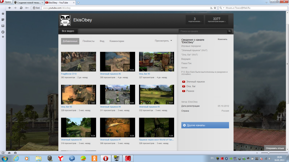 Всем доброго утра,дня,вечера,ночи хочу вам представить мой канал в youtube.com. Он включает в себя две игровые передачи фраг-муви и многое другое. Пока что канал только развивается. Но в будующем мы планируем сделать много чего, ваши предложения насчёт улучшений канала я с удовольствием прочитаю в коментариях. Спасибо за ваше внимание. Наш канал в youtube http://www.youtube.com/ekisobey Вот одно видео нашего канала Игровые передачи: "Эпичный прыжок" (WoT) "Опа, баг" (WoT) Ведущие: Паша Пэк - игровой ник peckk Антон - игровой ник noobasoss2010 P.S: Все баги были найдены в рандоме и случайно. Не забывайте остовлять свои предложения в коментариях.