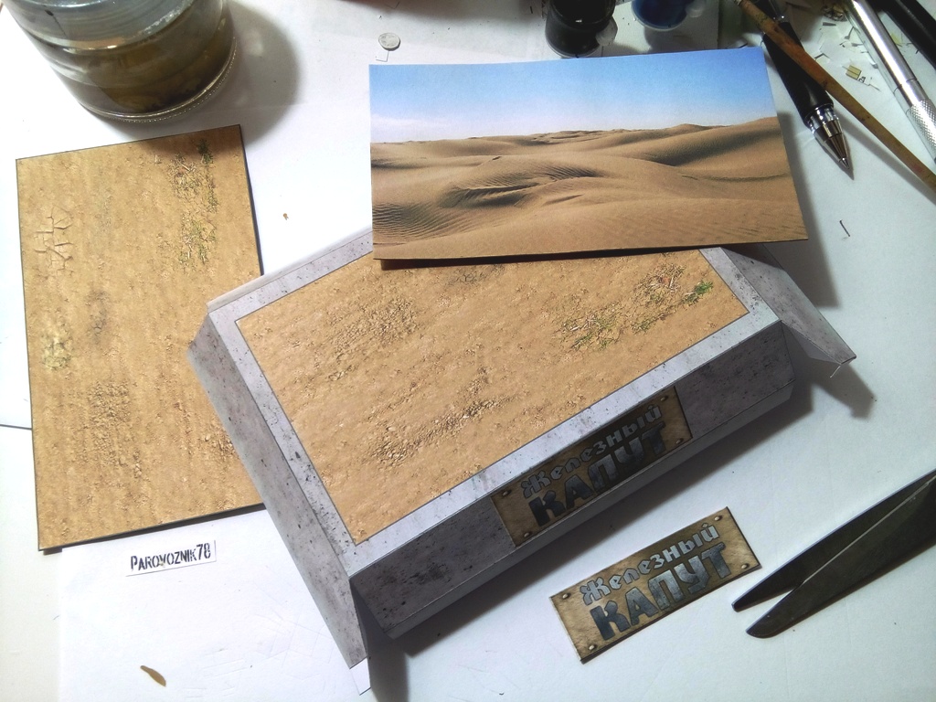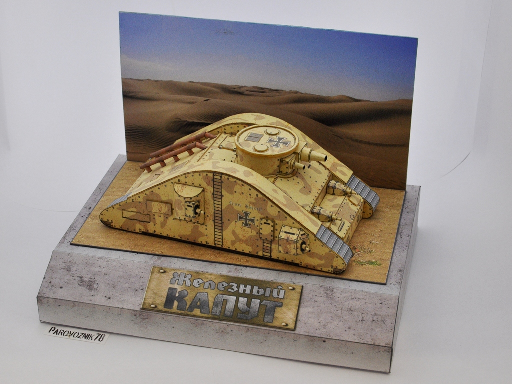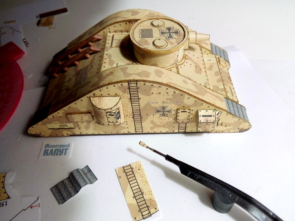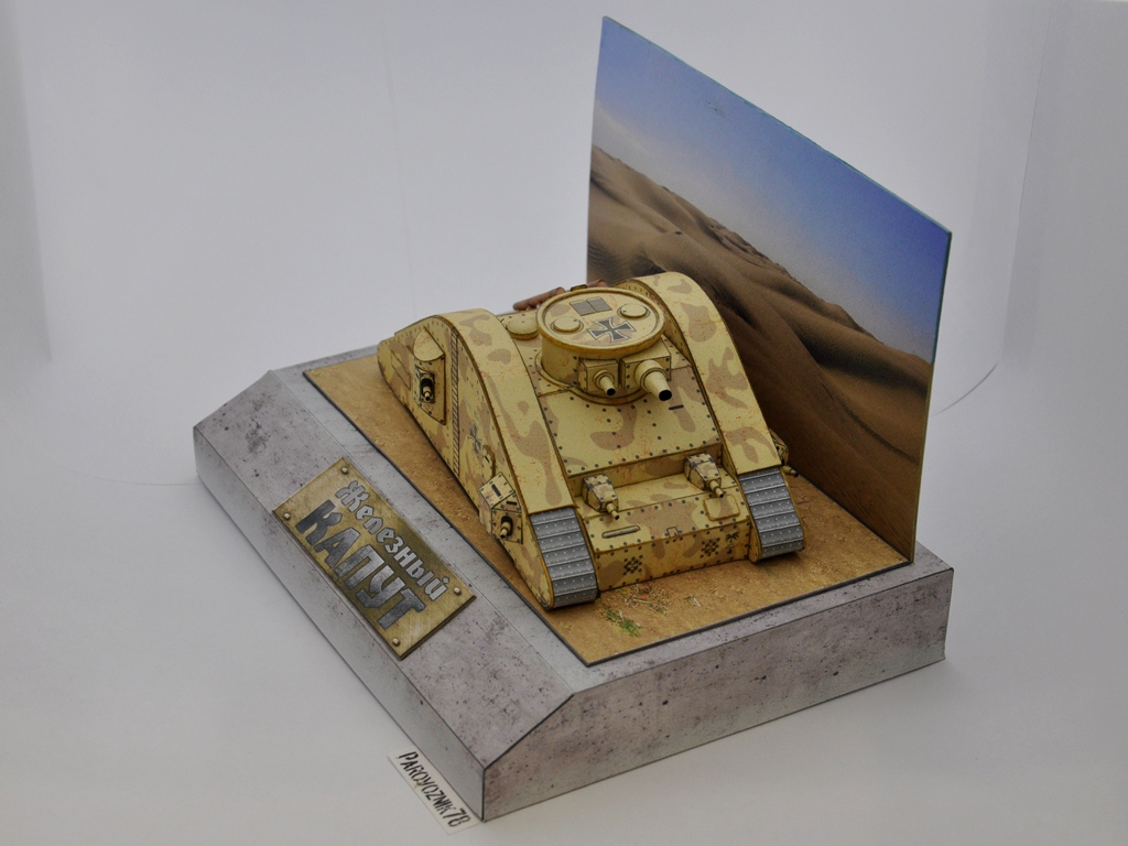 Доброго всем дня. Однажды в сети наткнулся на интересную модель танка "Железный капут", что-то внутри щелкнуло, в памяти всплыло далекое воспоминание любимого сериала и руки зачесались. Но собрать так просто, как предлагалось - неинтересно, не было изюминки. Почесав затылок решил немного "допилить" модель, состарить и придать ей "более натуральный цвет лица". Добавил немного ржавчины на корпус, выхлопные трубы состарил, нарисовал лестницы и опознавательные знаки. А так-как в шкафу все меньше места для моделей, то, по примеру Гуру микромоделей, решил собрать ее в меньшем масштабе, чем предлагалось. Получился масштаб примерно 1/100. Так как масштаб получился довольно мелкий, то и технология сборки изменилась, не как в журнале. Практически все склеивалось в стык, бумага использовалась офисная, плотностью 80г/м. На рисование и сборку ушло все лето. Итак, прошу внимания: http://cdn-frm-eu.wargaming.net/wot/ru/uploads/monthly_09_2016/post-34977863-0-07929200-1474607769_thumb.jpg http://cdn-frm-eu.wargaming.net/wot/ru/uploads/monthly_09_2016/post-34977863-0-66894400-1474607778_thumb.jpg http://cdn-frm-eu.wargaming.net/wot/ru/uploads/monthly_09_2016/post-34977863-0-25769200-1474607788_thumb.jpg http://cdn-frm-eu.wargaming.net/wot/ru/uploads/monthly_09_2016/post-34977863-0-73894400-1474607802_thumb.jpg http://cdn-frm-eu.wargaming.net/wot/ru/uploads/monthly_09_2016/post-34977863-0-23888000-1474607818_thumb.jpg http://cdn-frm-eu.wargaming.net/wot/ru/uploads/monthly_09_2016/post-34977863-0-11084400-1474607834_thumb.jpg http://cdn-frm-eu.wargaming.net/wot/ru/uploads/monthly_09_2016/post-34977863-0-72742900-1474607847_thumb.jpg http://cdn-frm-eu.wargaming.net/wot/ru/uploads/monthly_09_2016/post-34977863-0-49306400-1474607863_thumb.jpg http://cdn-frm-eu.wargaming.net/wot/ru/uploads/monthly_09_2016/post-34977863-0-49814000-1474607880_thumb.jpg http://cdn-frm-eu.wargaming.net/wot/ru/uploads/monthly_09_2016/post-34977863-0-38285000-1474607893_thumb.jpg http://cdn-frm-eu.wargaming.net/wot/ru/uploads/monthly_09_2016/post-34977863-0-70361200-1474607908_thumb.jpg Вот сам процесс сборки: В этот раз использовал новую для себя технологию съемки. Использовалась "труба ", склеенная из нескольких листов А4 и подсвеченная сверху настольными лампами. Съемка проходила под покровом ночи, чтобы не мешать никому: Спасибо за внимание.Продолжение следует...
