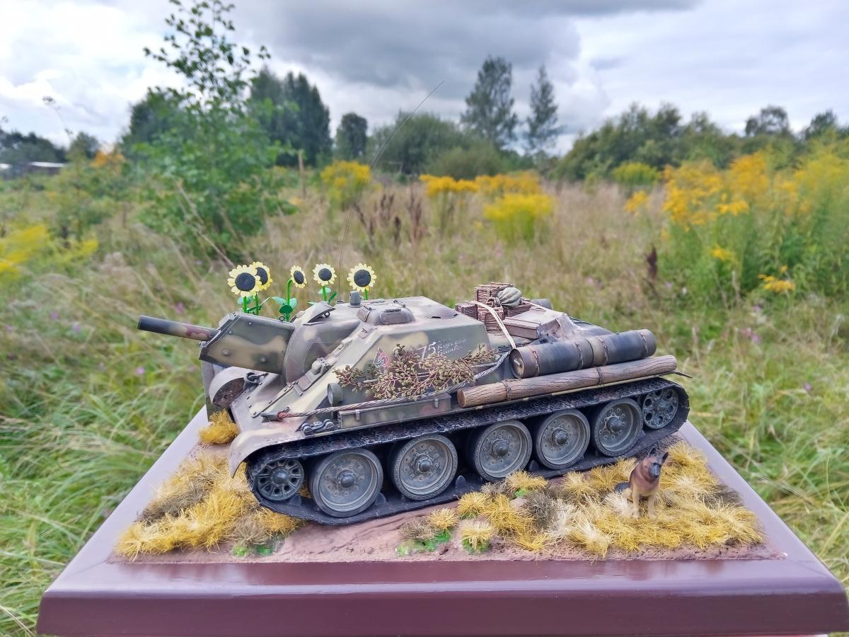 Привет танкисты и танкистки! Предлагаю признаться в том, что пиксельные танчики, которые мы ежедневно юзаем в виртуальных боях, иногда хочется увидеть и подержать в своих руках. Вот кто бы не хотел подержать, согласны? Очевидно будет услышать ответ, что всё это детские фантазии. Однако, если решили ответить наоборот – приятного просмотра. Зрителю предлагается обзор модели советской самоходной установки СУ-122 в масштабе 1/35 на базе набора от «Звезды» в особом камуфляже «75 лет Курской Битвы», напоминающий о знаменательных днях в страницах истории России. Тем самым художник-моделист обращает внимание на передачу памяти и исторических знаний о Великой Отечественной войне будущему поколению. Следует добавить, что модель-копия танка принимала участие в выставке «Наследие Победы» и вдохновила моделиста на дальнейшее завершение работы в виде диорамы. В работе применены наборы для моделирования (Союзмакет, MiniWarPaint, Tamiya, ZIPmaket) и подручные материалы доступные в любых хозяйственных магазинах: шпатлевка по дереву совместима и подходит в качестве основания, окрашенный сантехнический лен для имитации травы, а рисунок камуфляжа сделан из жгутиков скульптурного пластилина, – на заметку начинающему моделисту. Надпись и эмблема – это финальная деталь в сборке модели для выбранного образа самоходки, которые изготовлены самодельно на гуммированной бумаге. Спасибо за внимание! Буду рад Вашим отзывам.