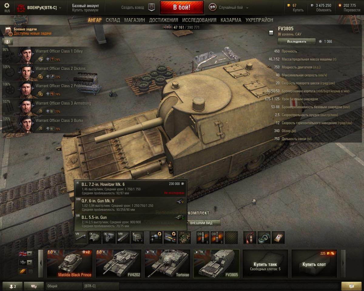 У Британской САУ FV3805 у первых двух орудий в игре совершенно одинаковая модель. Итак мы имеем B.L. 5,5-in.Gun со 139.7 мм и Q.F. 6-in.Gun Mk.V со 152.4 мм. Калибр орудий довольно сильно отличается, как и урон, а также отличается бронепробитие. Однако, сколько раз не пробовал менять орудие в ангаре, его графическая модель не изменяется от смены. По идее, такого не должно быть! Должны же как-то графически орудия отличаться, хотя бы калибром ствола (то бишь каналом ствола). Но такого (сколько не мерил линейкой) от смены ствола не происходит.