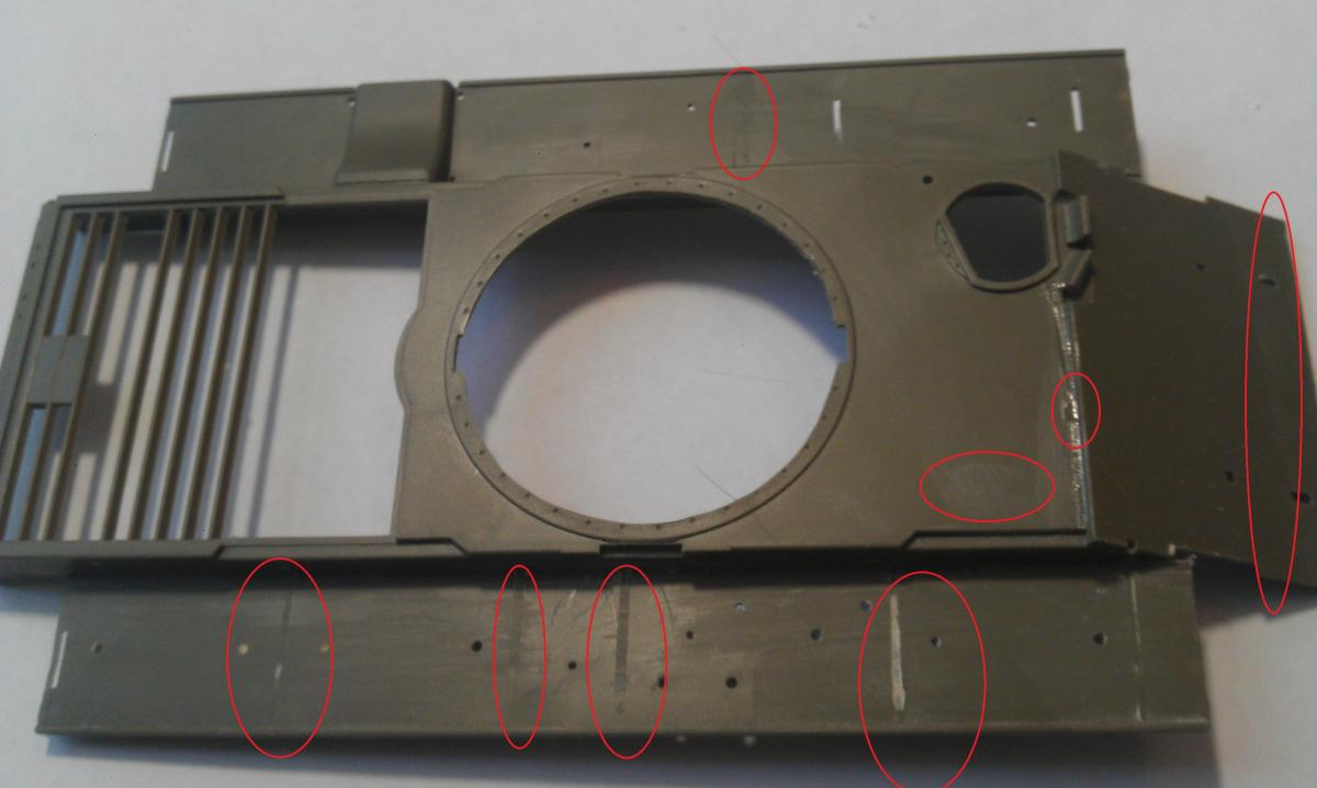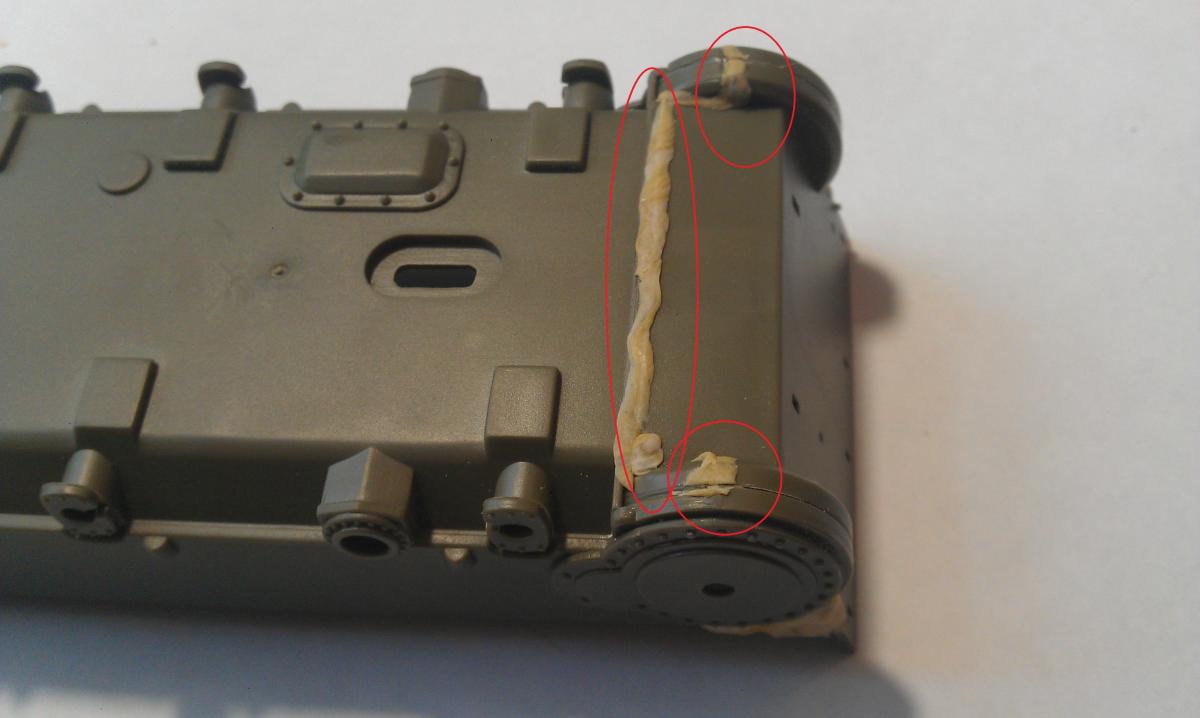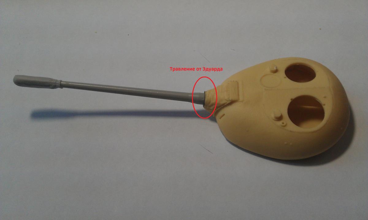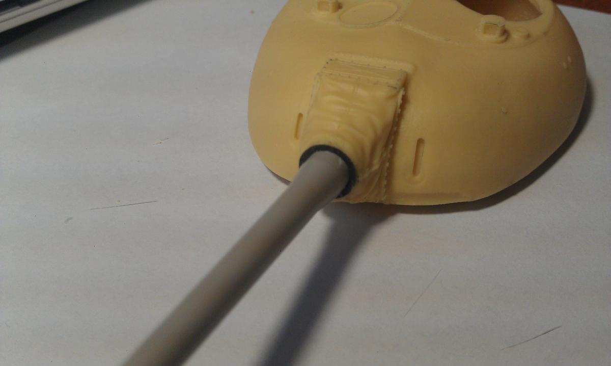 В данной теме буду собирать при Вас модель Limited Edition от Avangard Armour № 35004. Буду выкладывать фото, отвечать на вопросы, принимать предложения, советы и критику. 1. В комплекте идет набор смоляной башни образца 1949 года. Башня снизу сильно подрезалась, так как не влезала в корпус. Аккуратностью там не страдаю (пока). Замазаны щели двухкомпонентной шпаклевкой от Тамии (нормально под рукой пока нет). 2. Вклеено фототравленое кольцо из набора Эдуард № 35389 и вставлен ствол с чехлом от Panzer Art № RE35-102 3. Заделаны щели сзади 4. Спилены ребра жесткости на надгусеничных полках и спилены шов на лобовом листе.