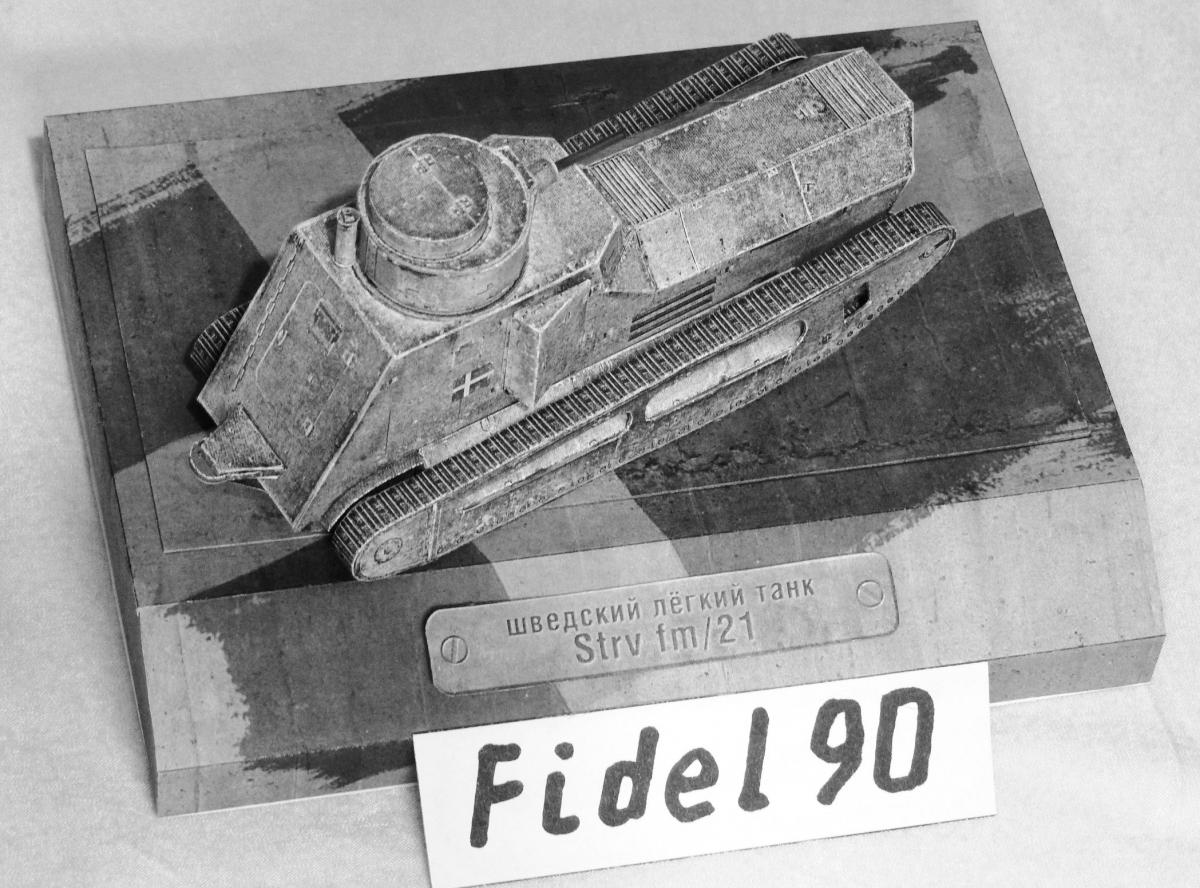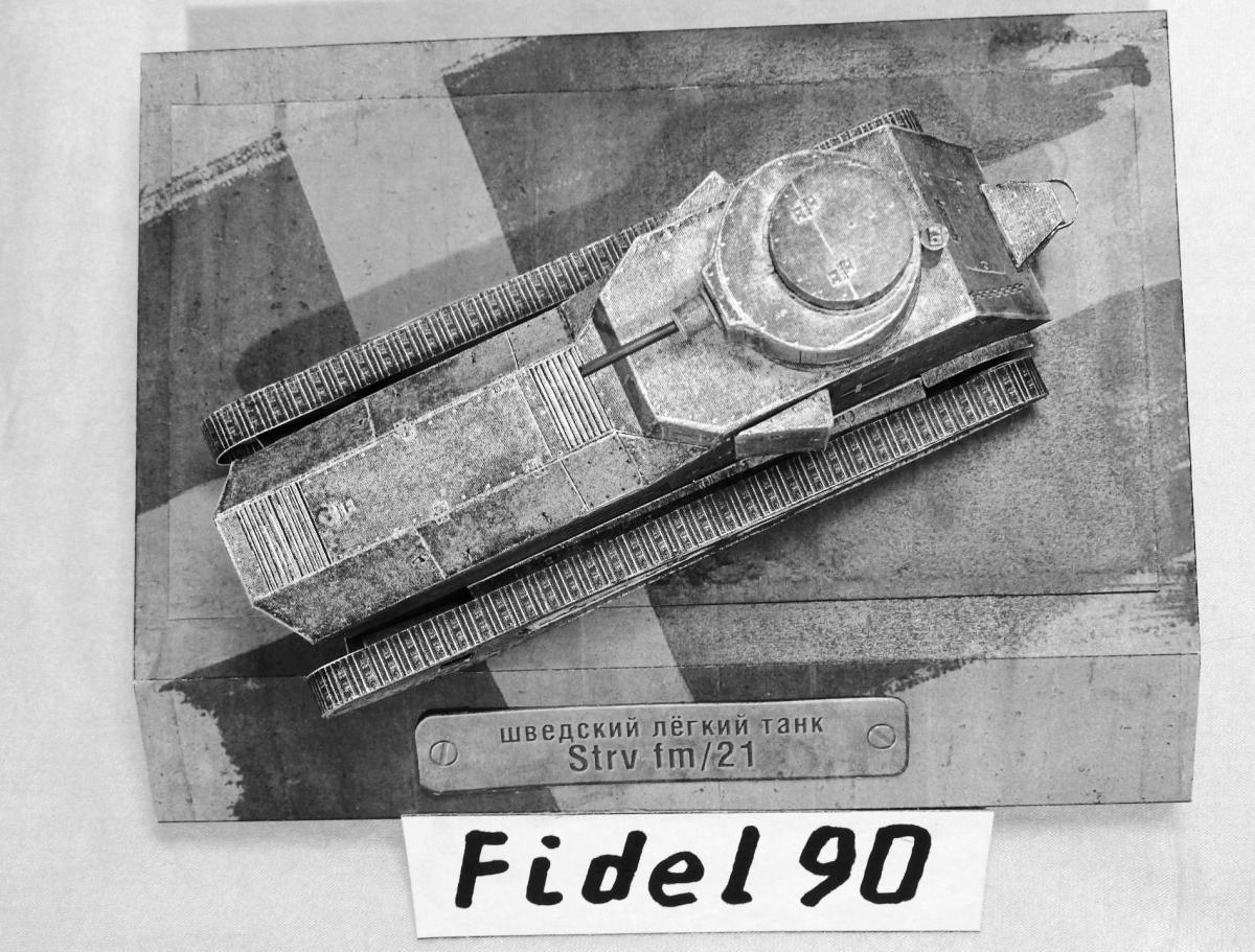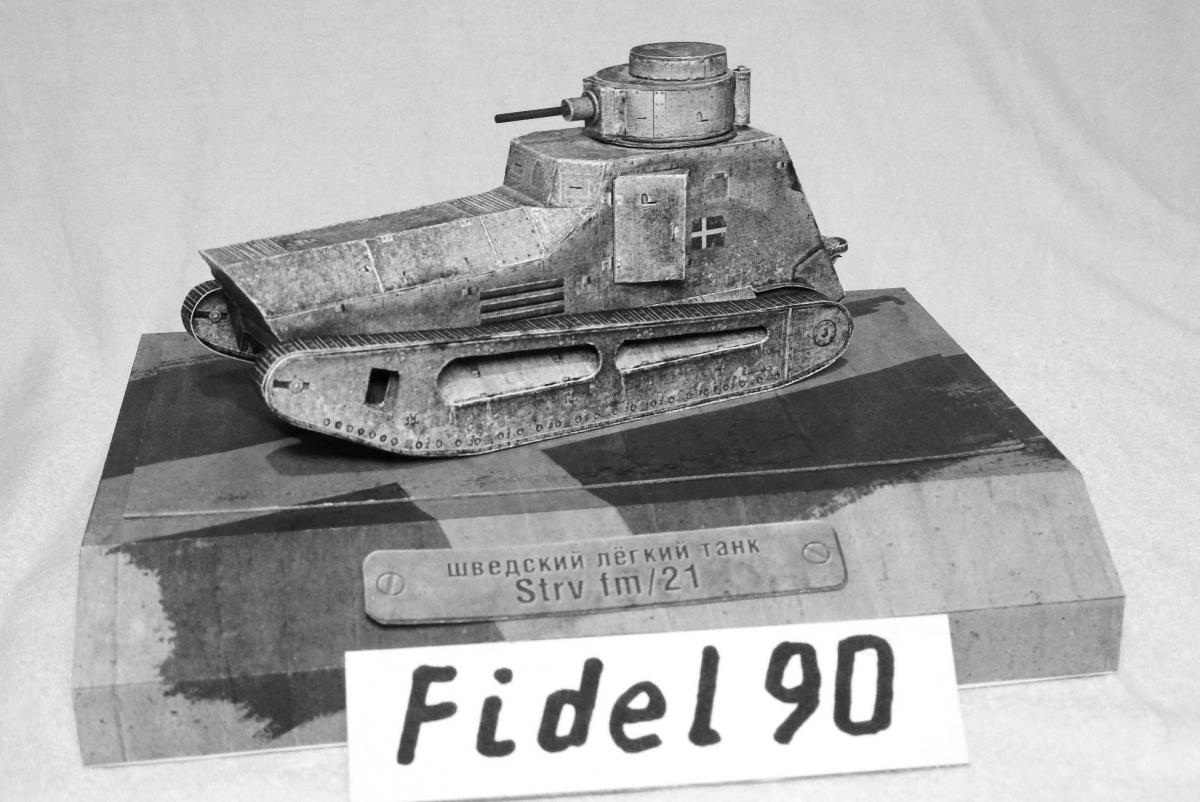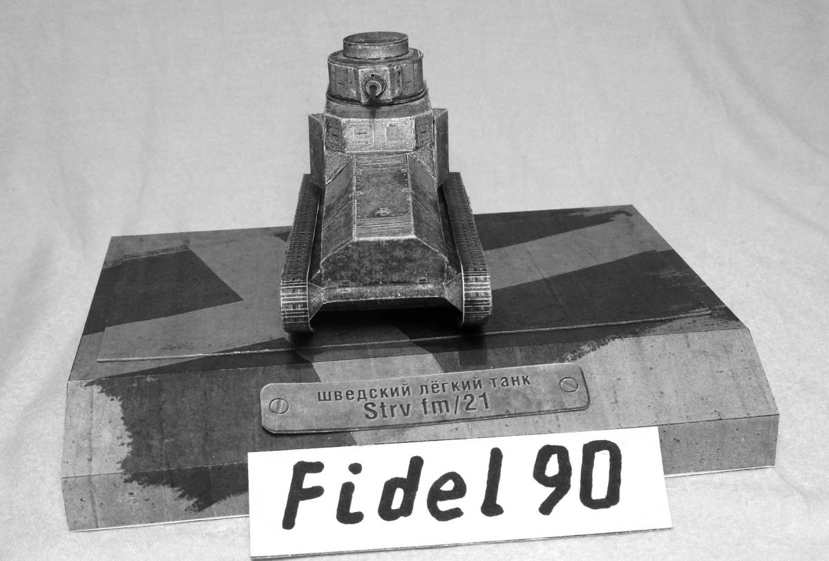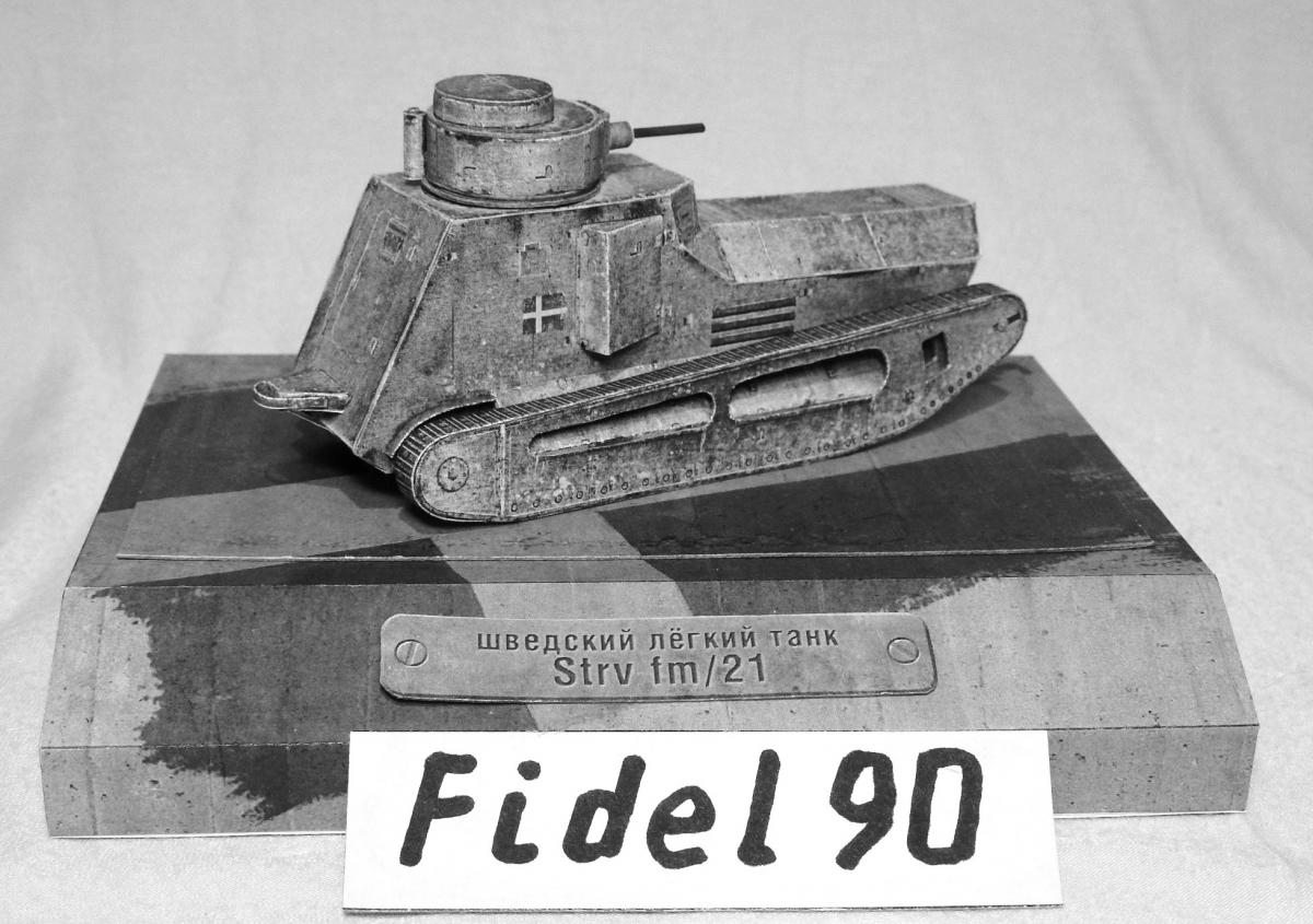 Опоздал на конкурс БК. Так что выкладываю здесь. модели "Strv fm 21 http://cdn-frm-eu.wargaming.net/wot/ru/uploads/monthly_04_2018/post-20700721-0-37054400-1522697986_thumb.jpg Ещё фото Почему ч/б фото? Потому что делал из листов напечатанных на лазерном принтере ч/б. Поэтому уже на компе убрал цветность. Захотелось посмотреть как получится из тонкой бумаги. И как сам процесс постройки из неё. Некоторые иногда пытаются и выкладывают. Оказалось гораздо труднее. Бумага тонкая, форму не держит, краска сыпется... Картону пришлось много вклеить. Из плюсов только одно - краску для торцев подбирать не надо, всё карандашом простым рисуется )) Так что если есть 100р. то лучше сходить и распечатать в ближайшую фото-контору на нормальной бумаге. ))
